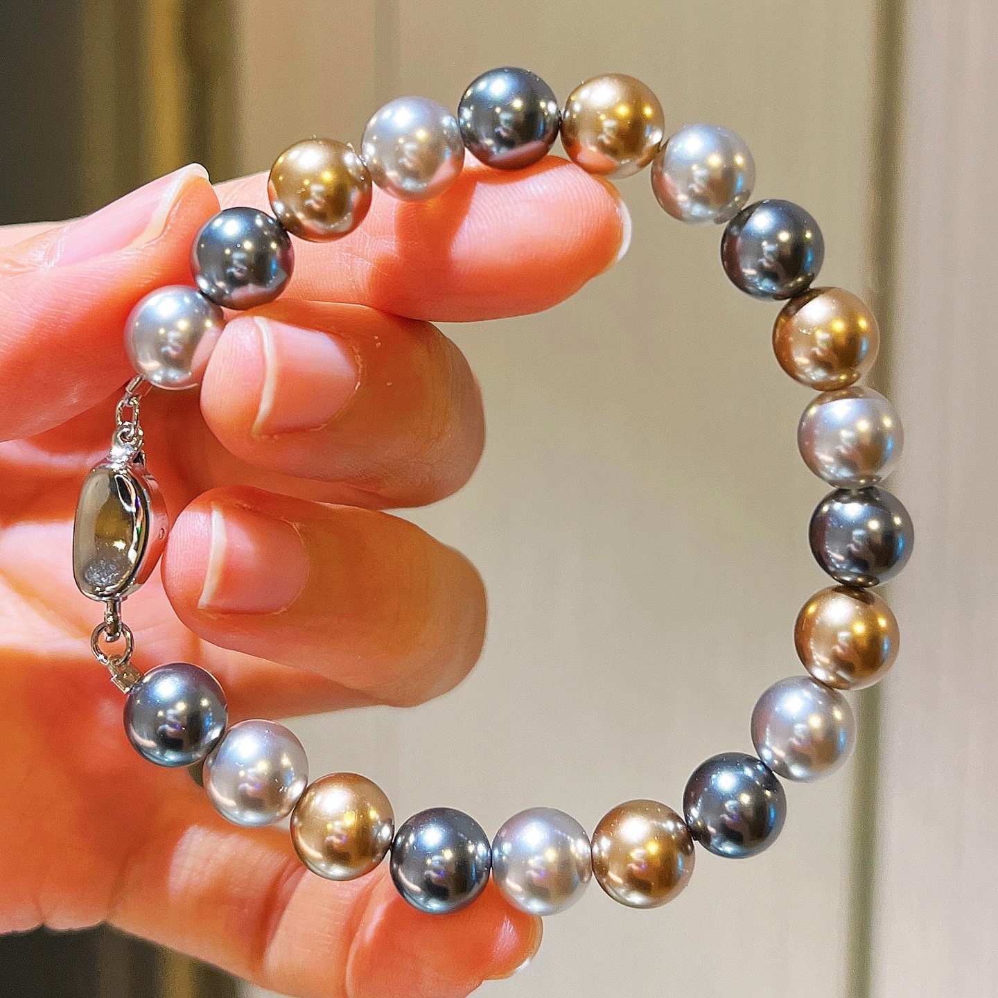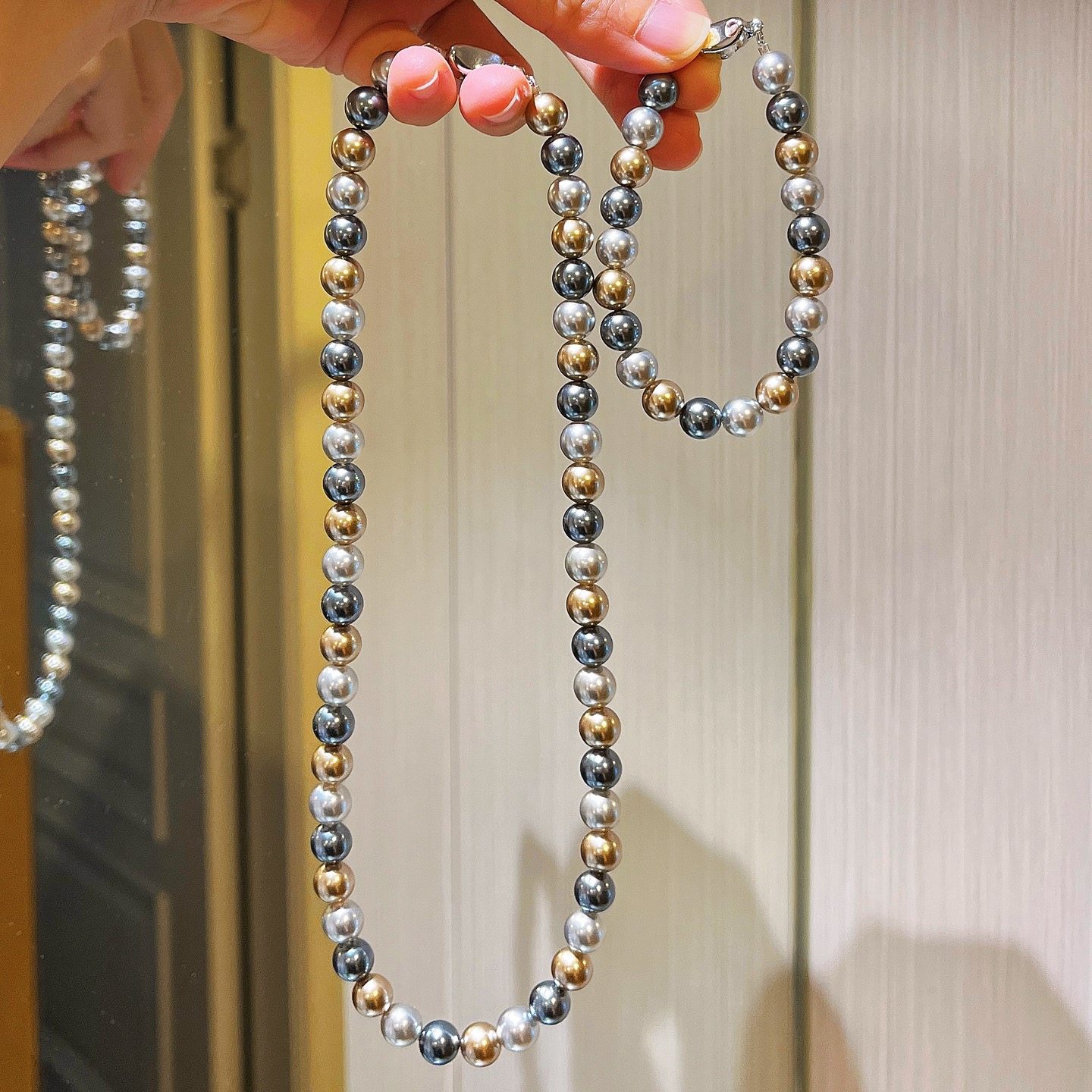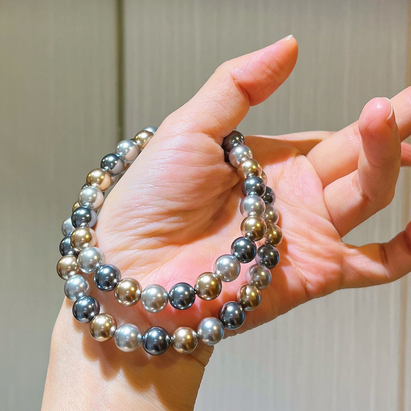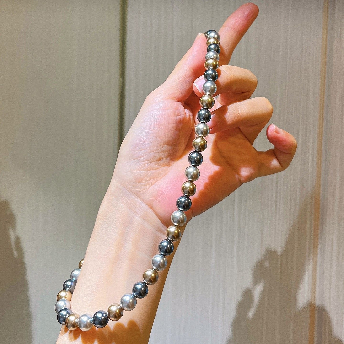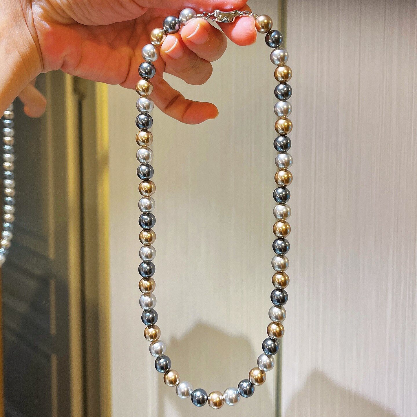 施家正圆极光仿海水大溪地黑灰混彩糖果色莫兰迪轻奢珍珠项链颈链