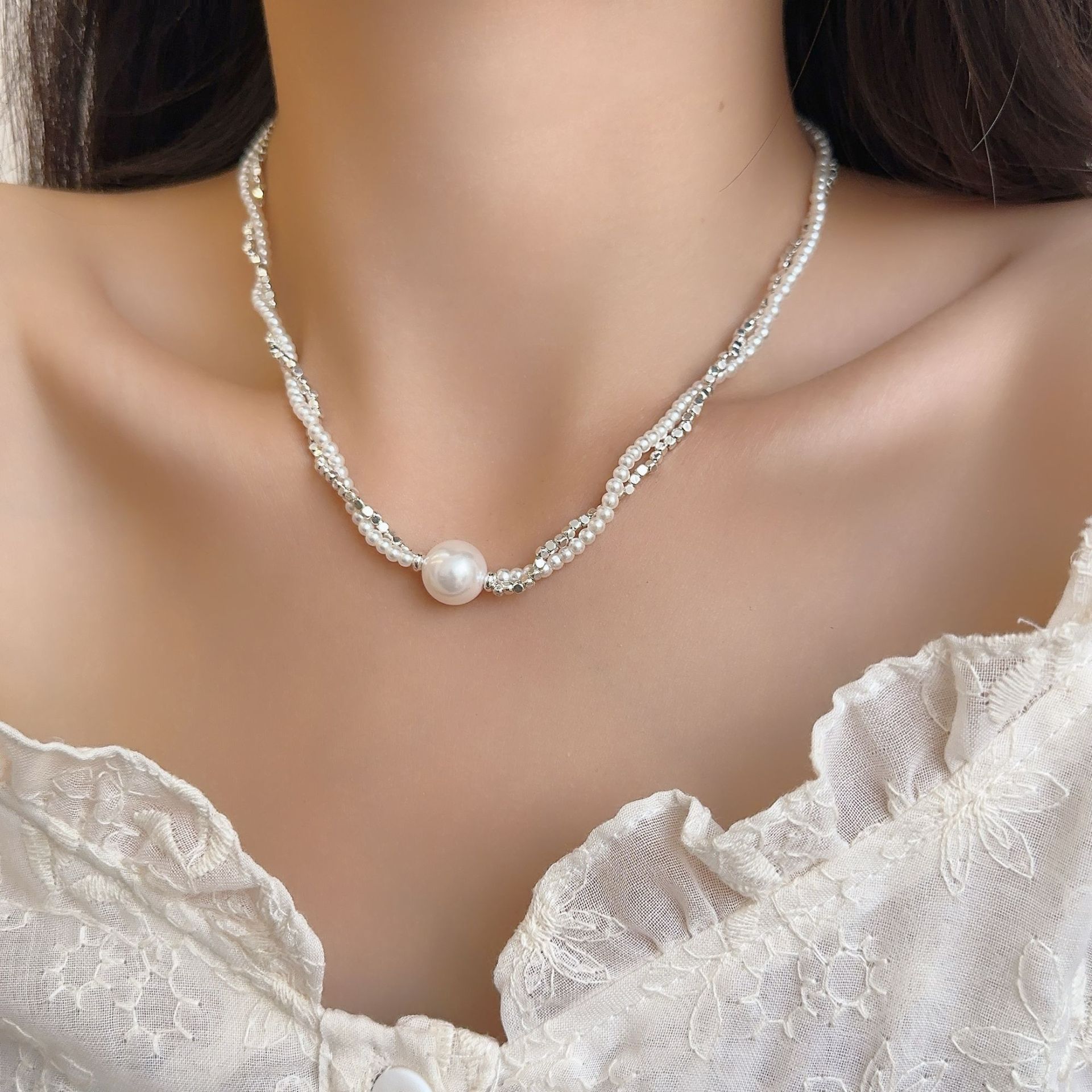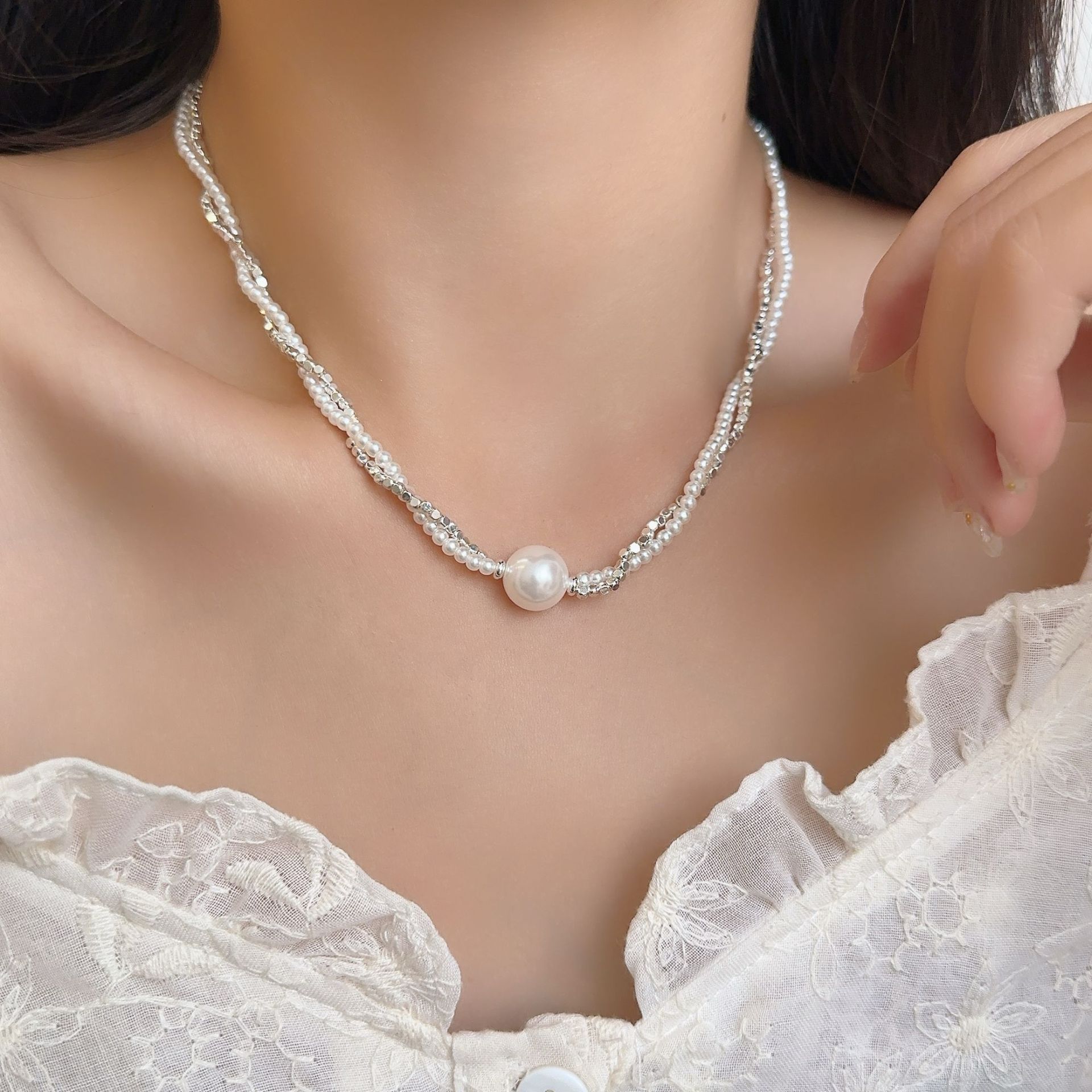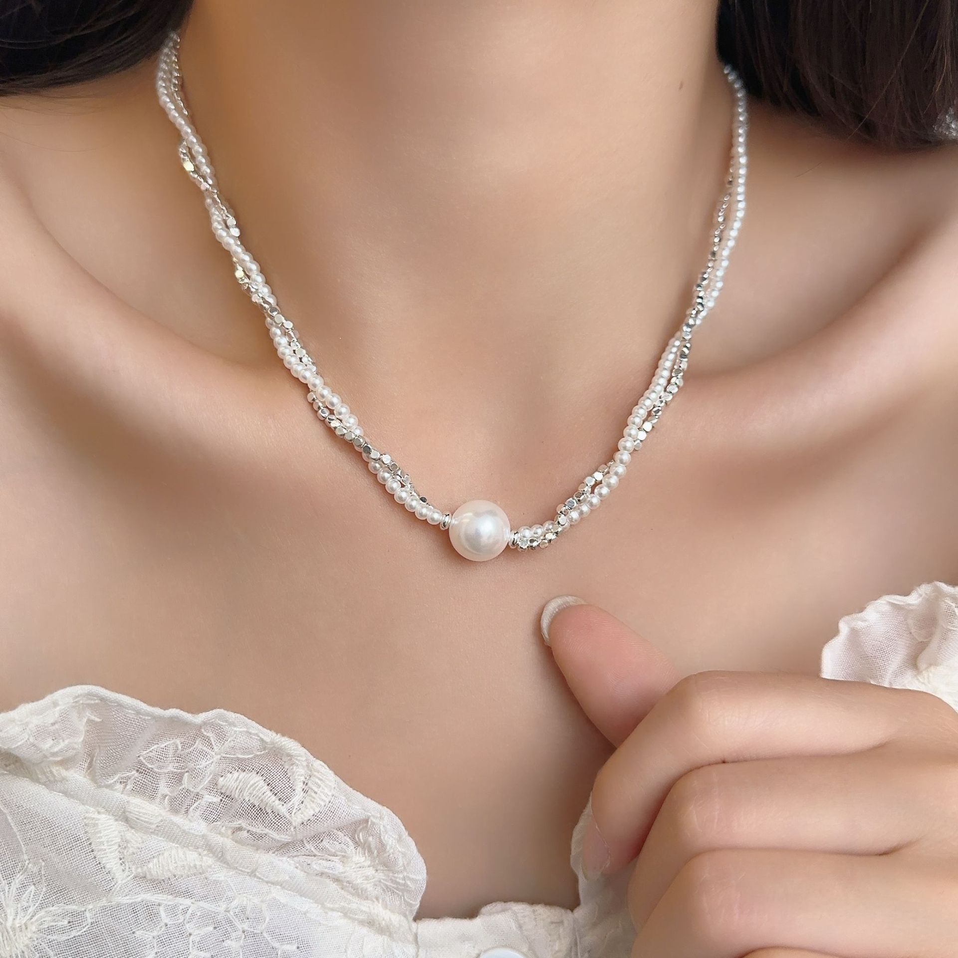 双层碎银子珍珠项链女 高级感ins风轻奢气质个性四季款锁骨链颈链