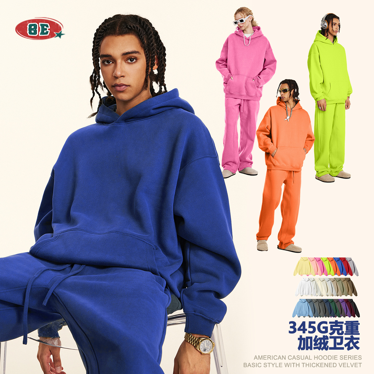 BE男装|2025秋季美式纯色休闲宽松大码加厚帽衫加绒连帽卫衣男潮