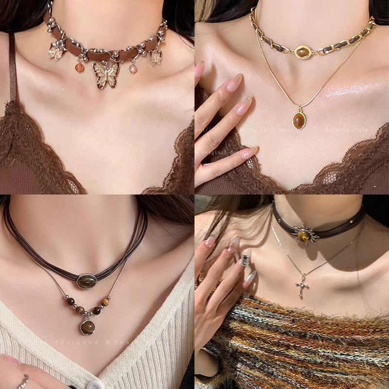美拉德秋冬虎眼石钛钢项链女韩系小众设计长款卫衣链配饰百搭新款