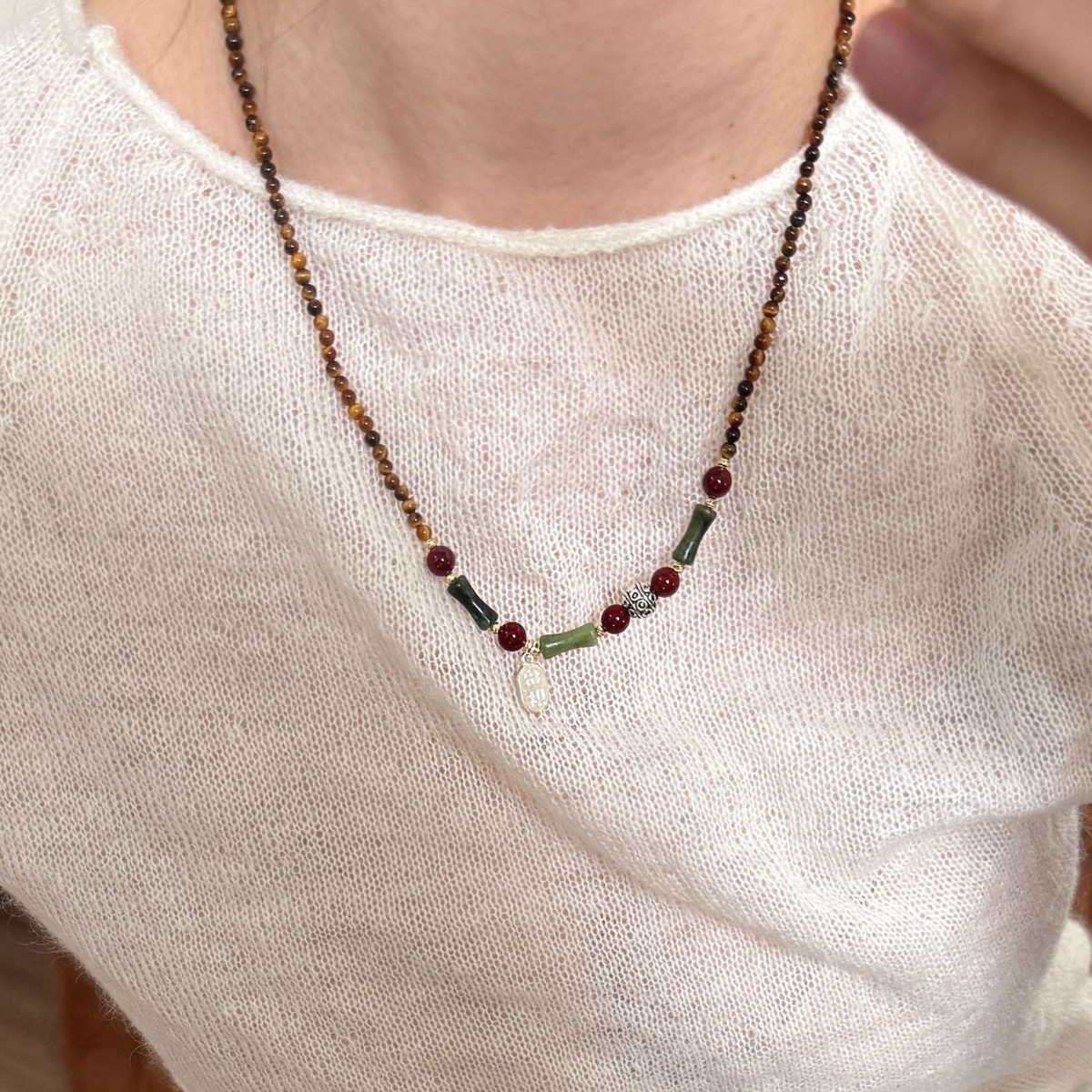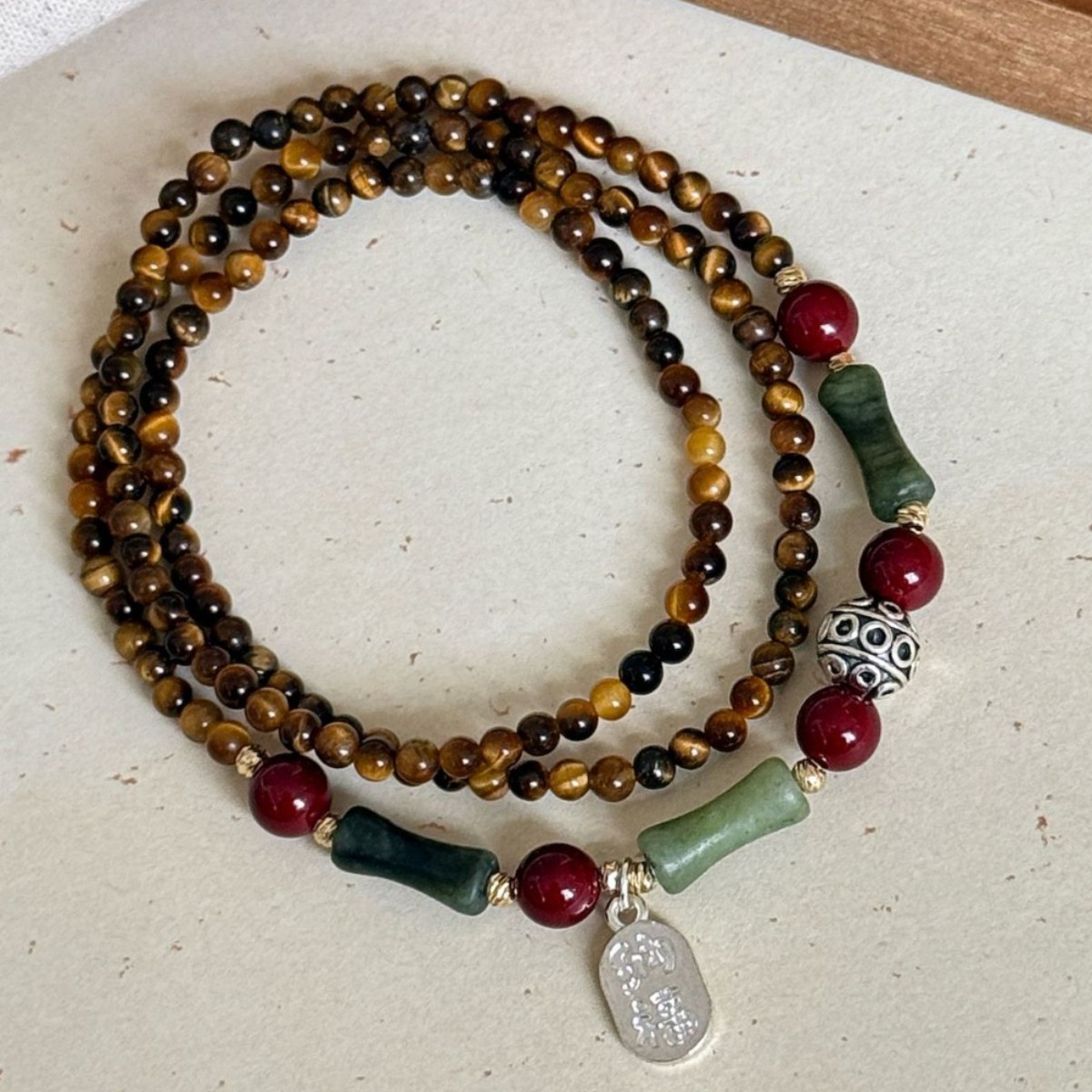 新中式纳福三层虎眼石朱砂串珠手串小众设计复古竹节中古锁骨链女