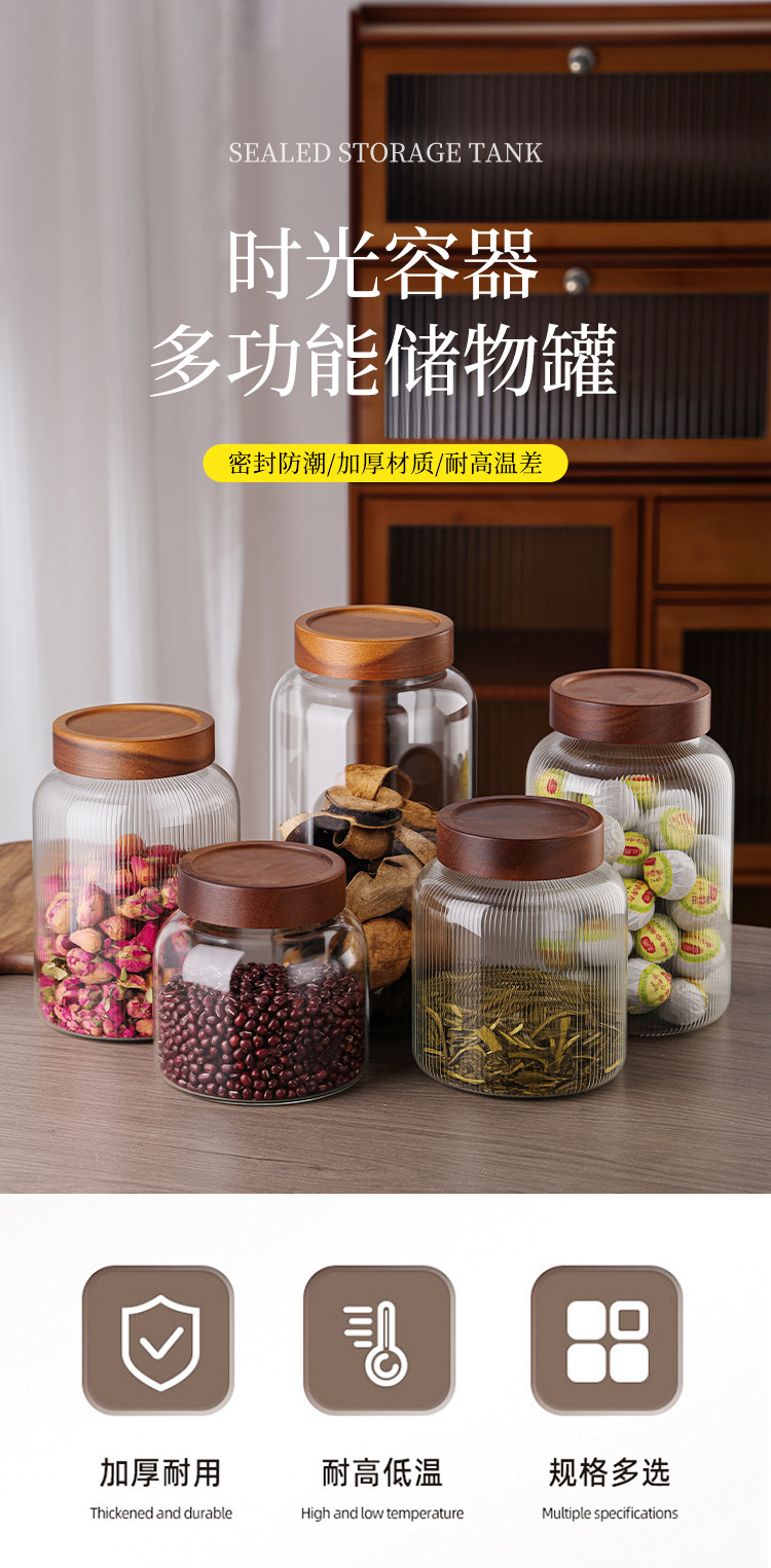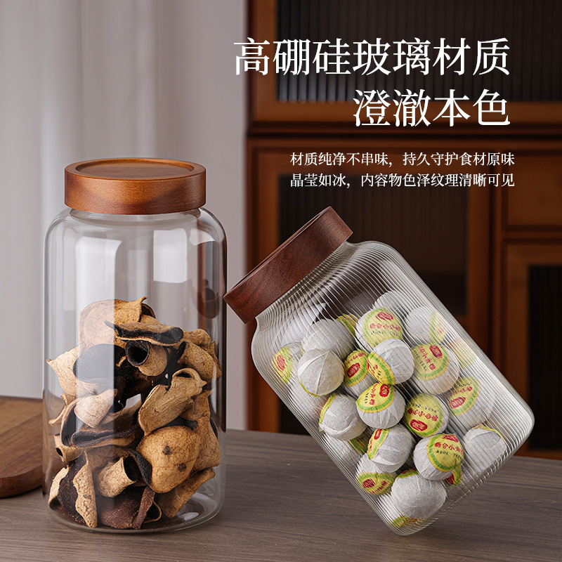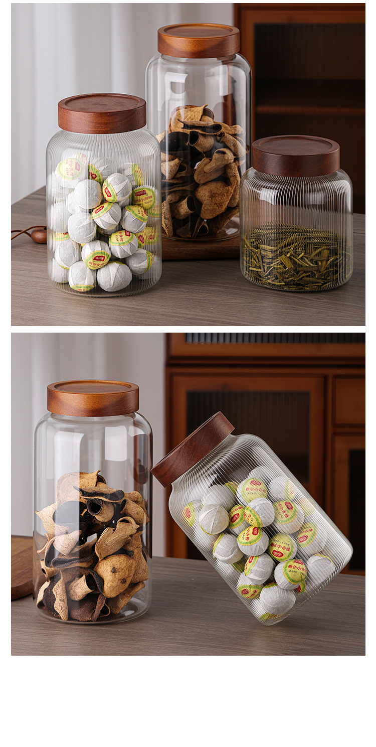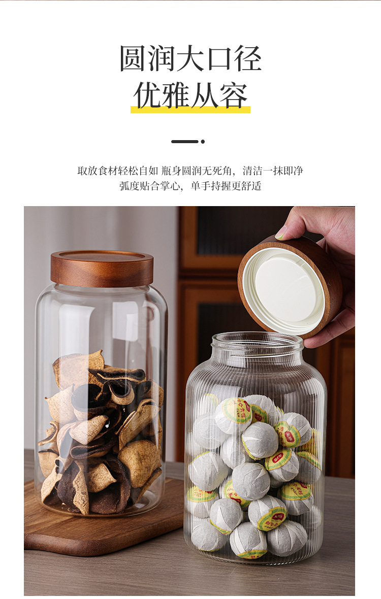储物罐玻璃密封罐竹木盖家用圆形茶叶陈皮罐防潮杂粮收纳透明罐