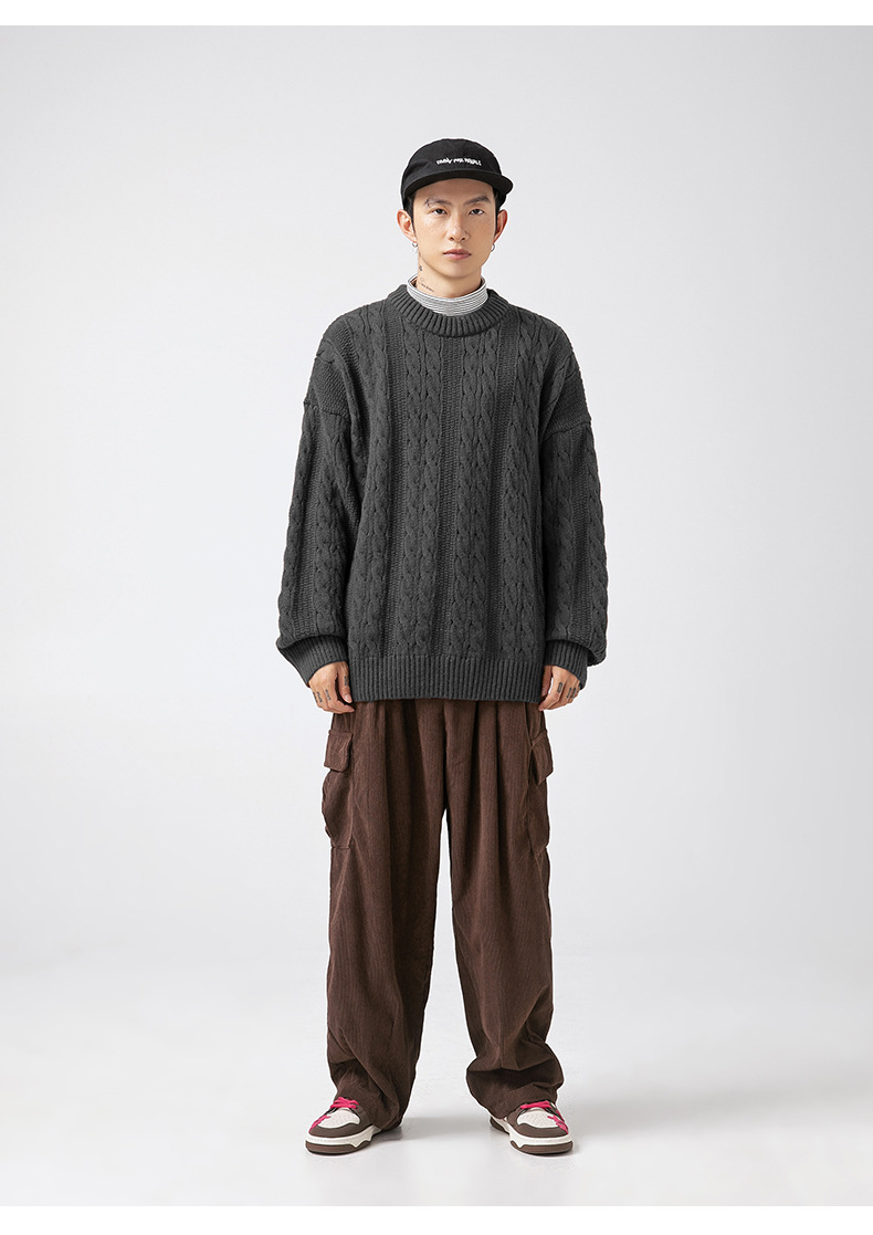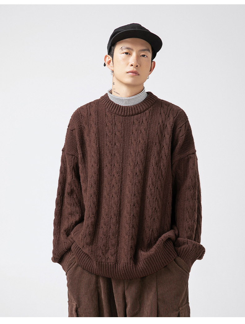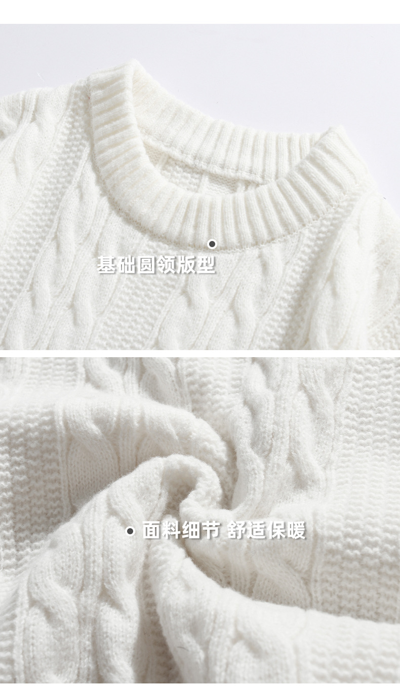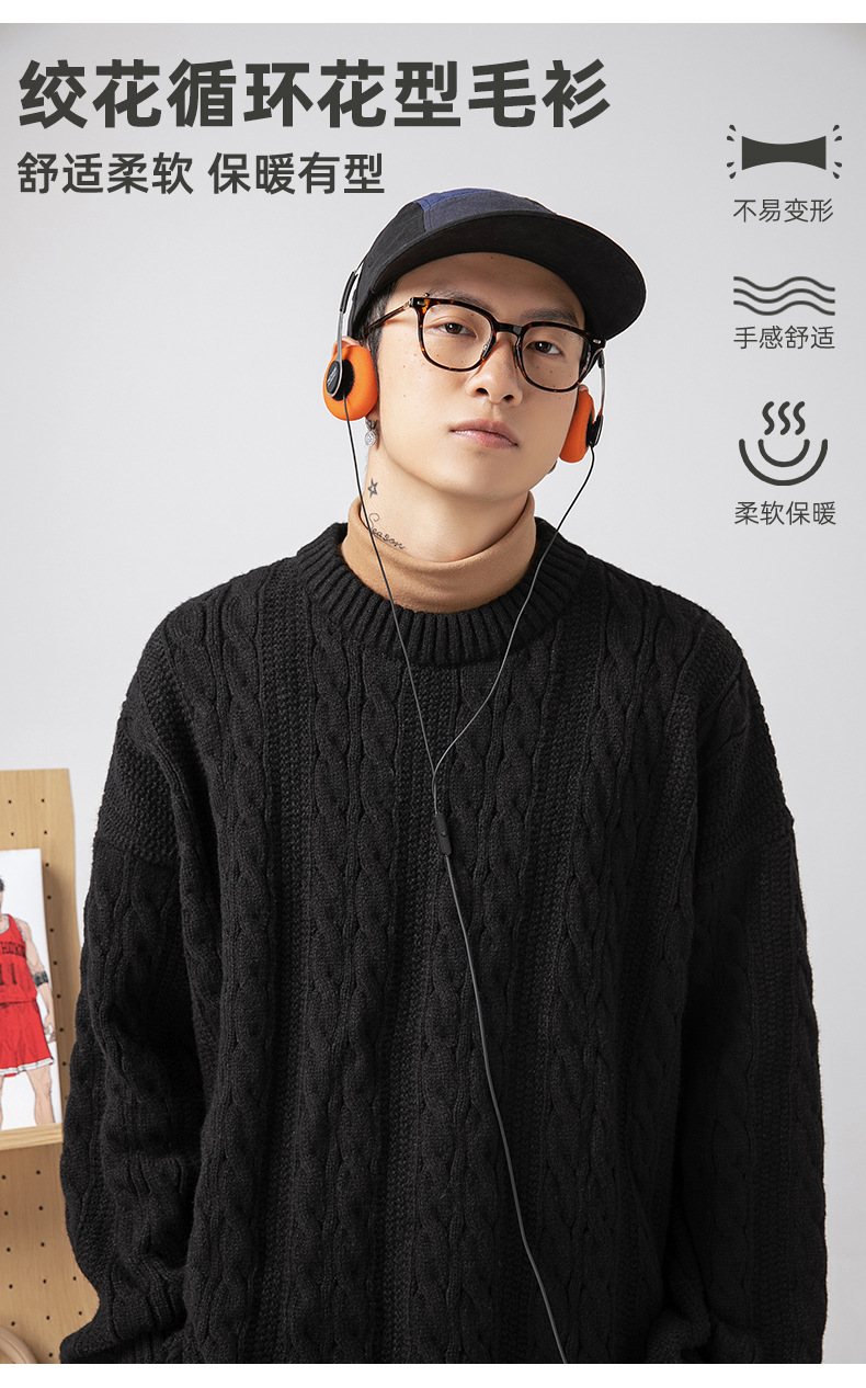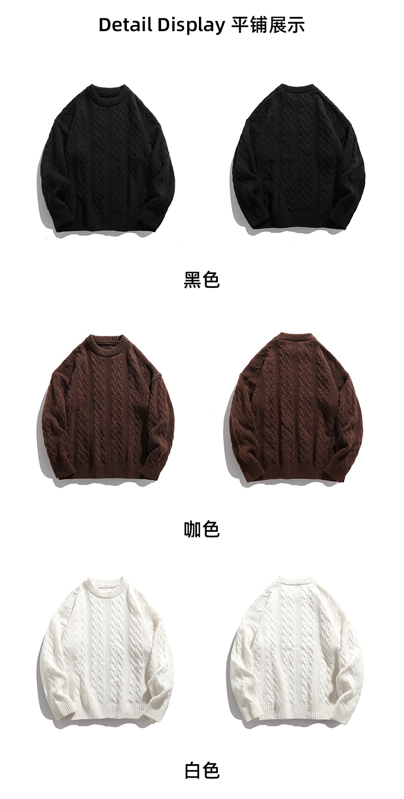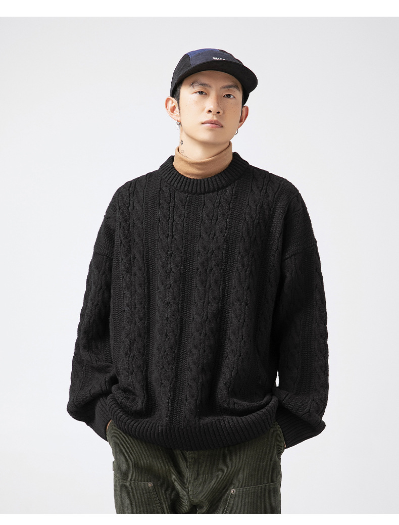 韩路日系男装绞花工艺纯色圆领毛衣男女秋冬季宽松复古针织衫外套