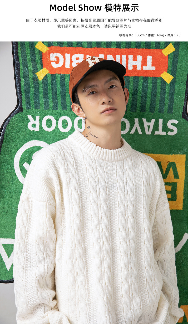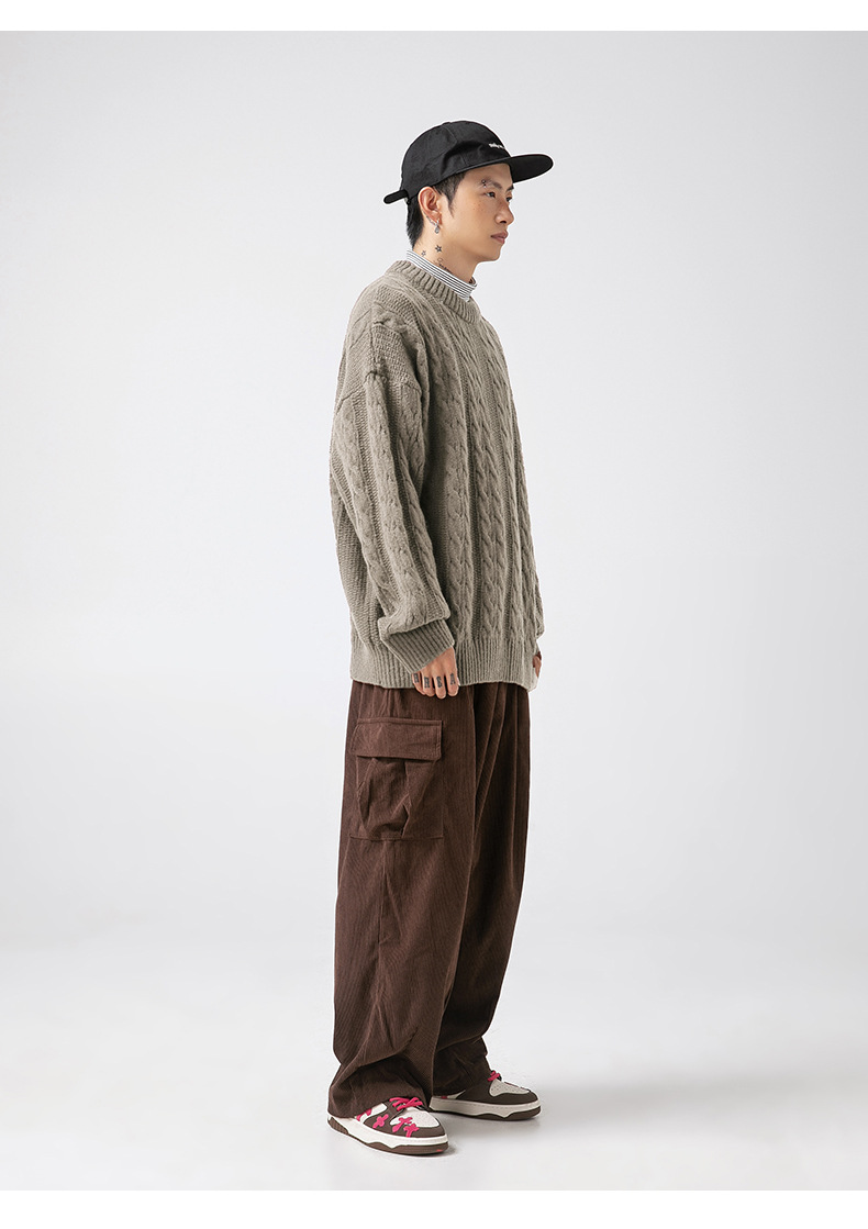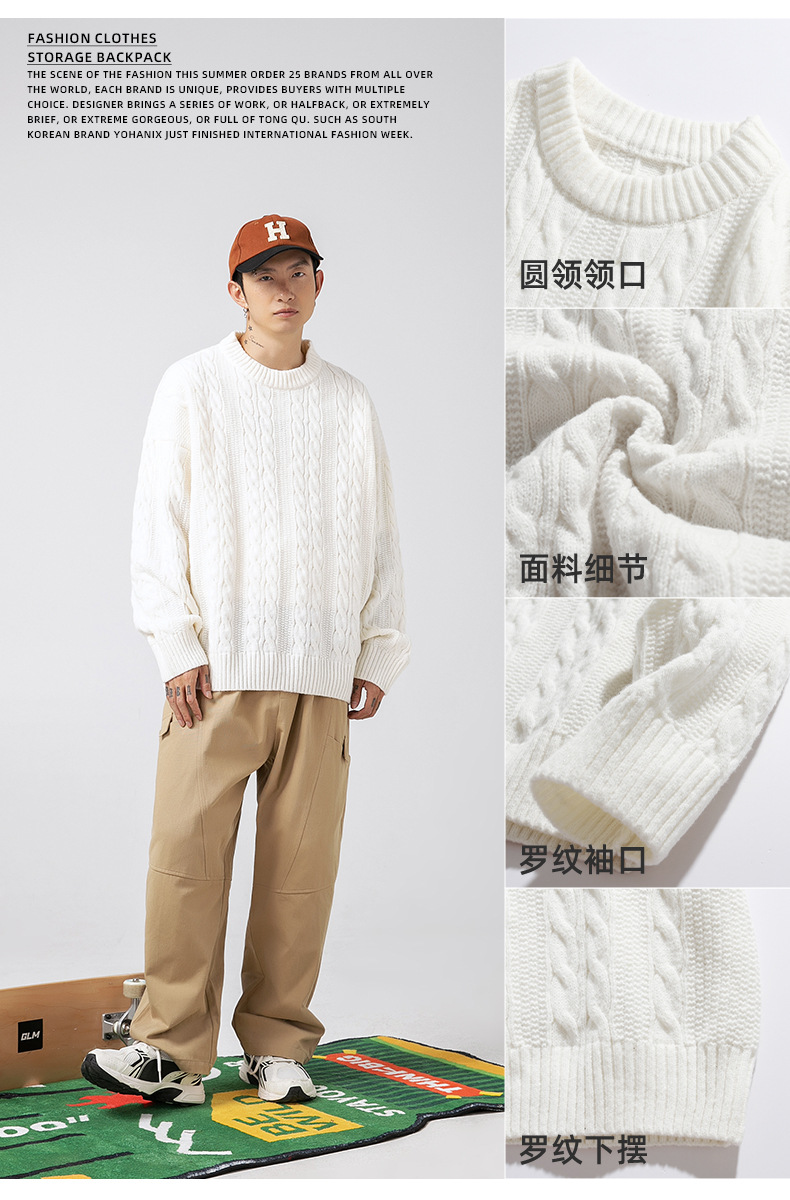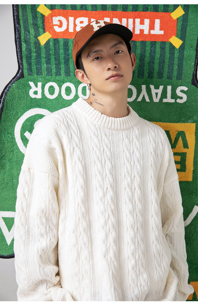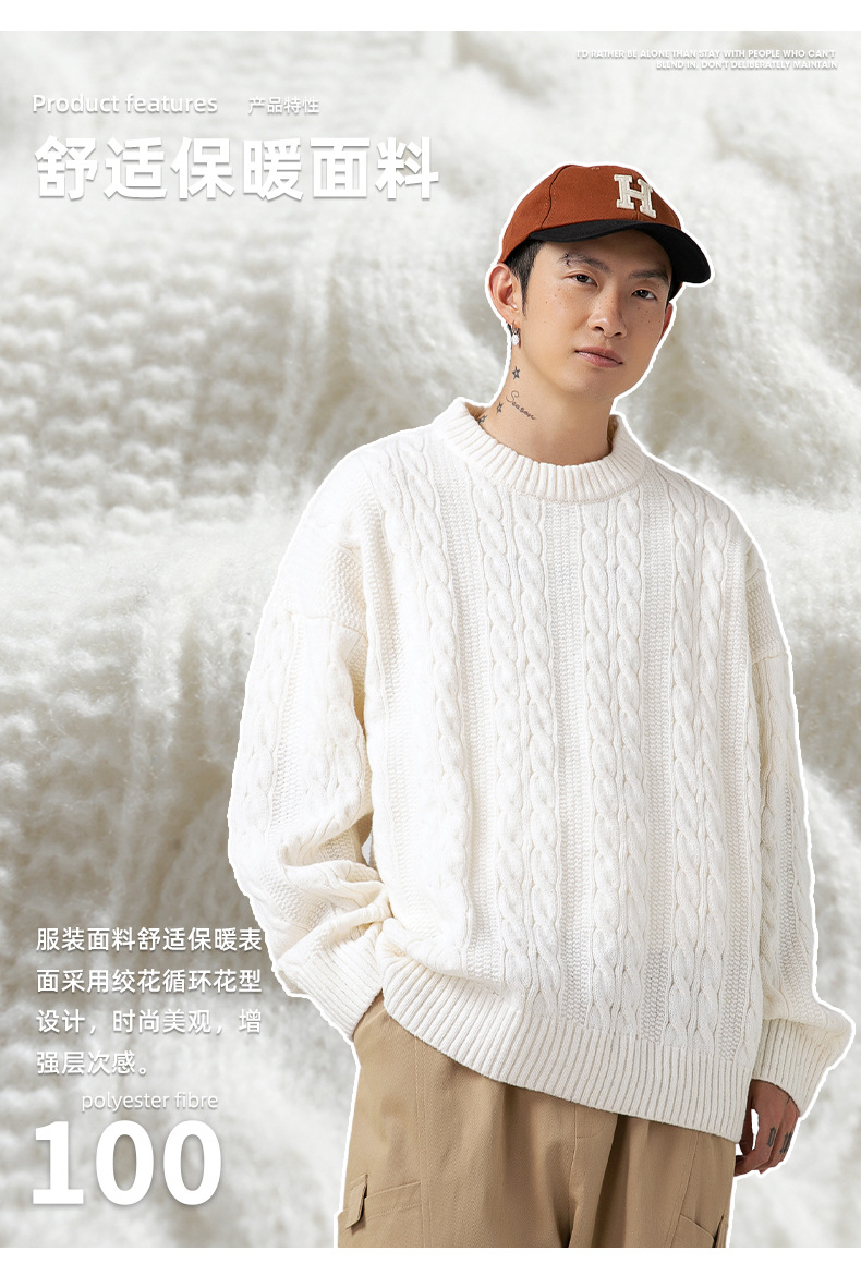 韩路日系男装绞花工艺纯色圆领毛衣男女秋冬季宽松复古针织衫外套