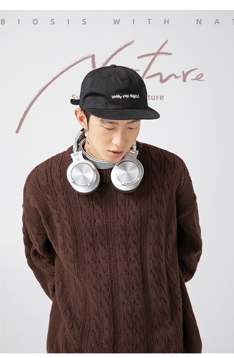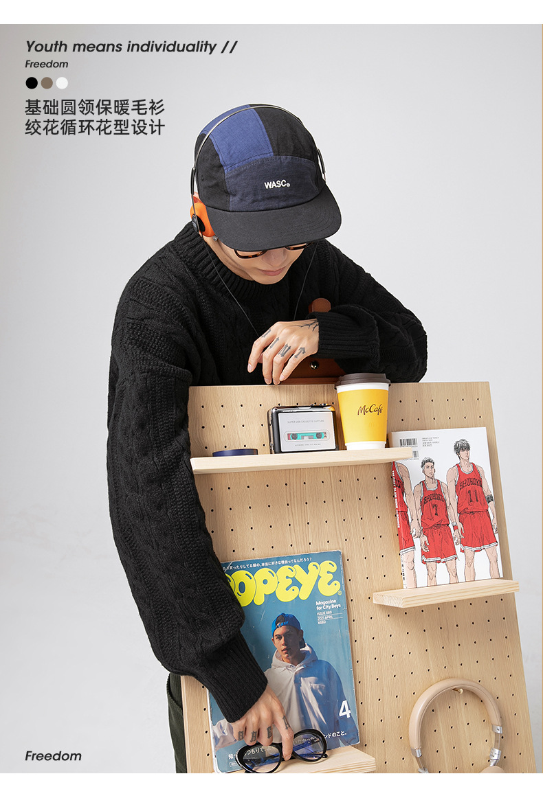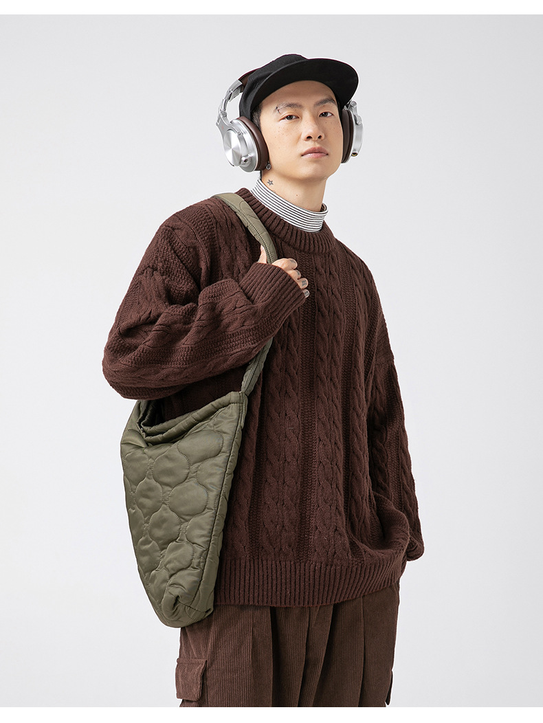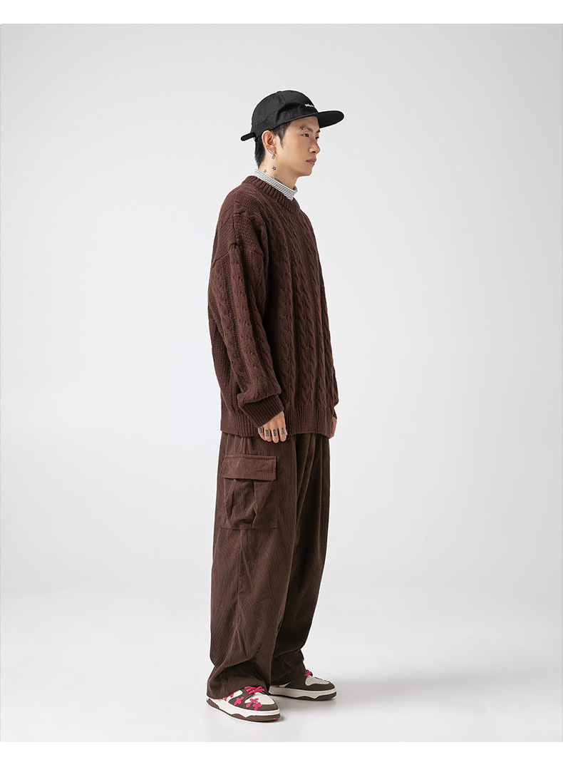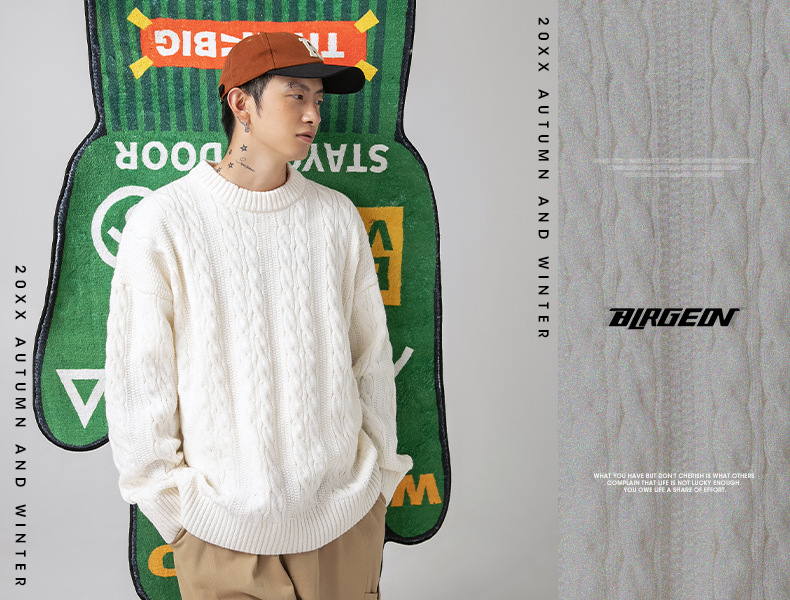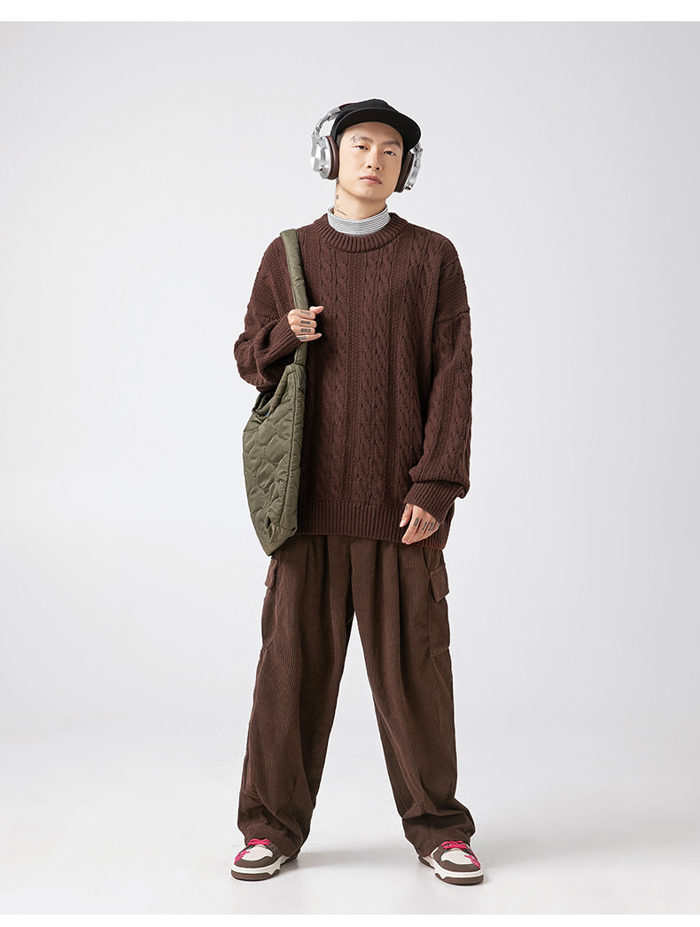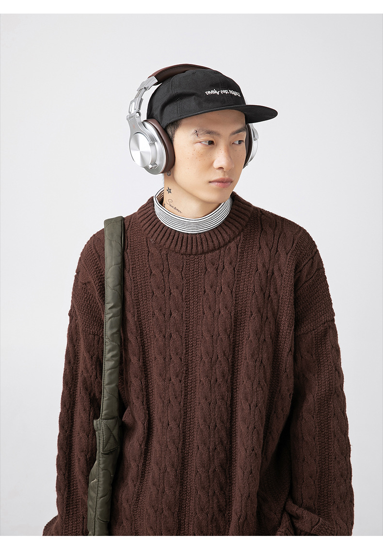 韩路日系男装绞花工艺纯色圆领毛衣男女秋冬季宽松复古针织衫外套