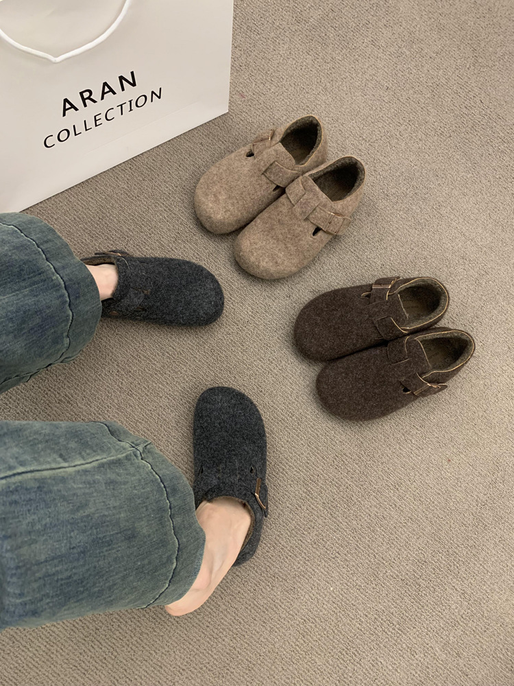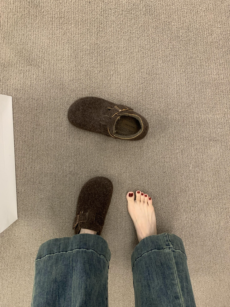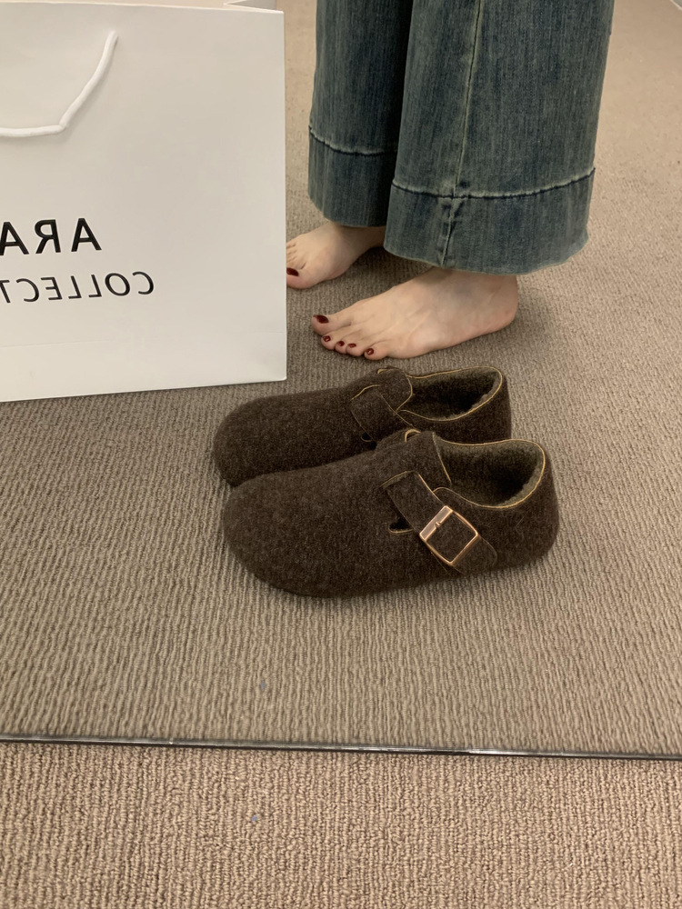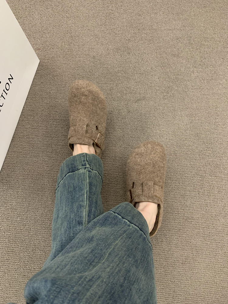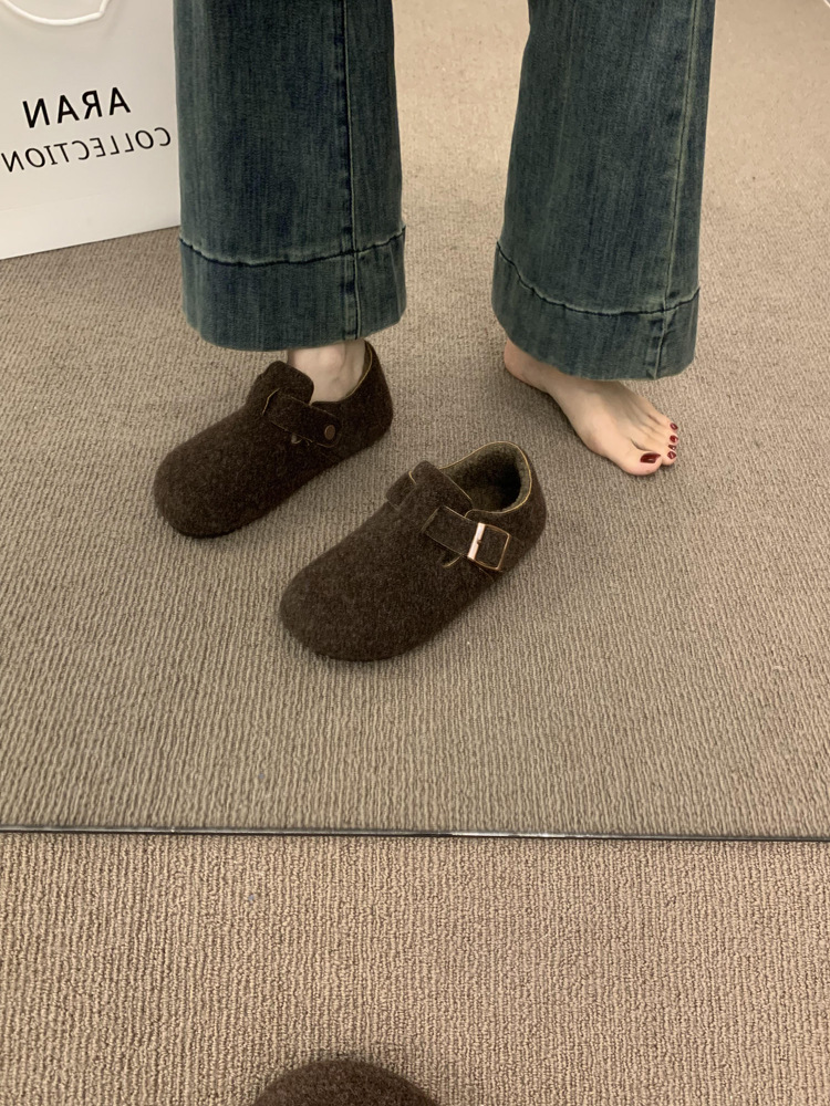 复古圆头毛毡加绒勃肯鞋女加绒秋冬季一脚蹬保暖棉瓢鞋毛呢乐福鞋
