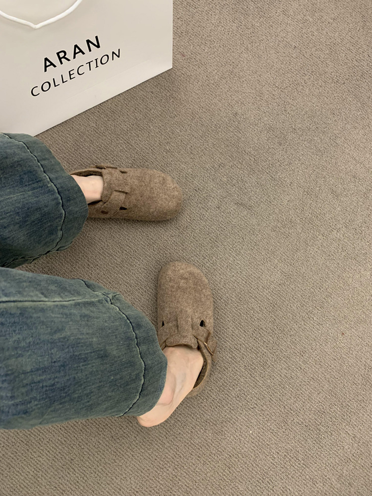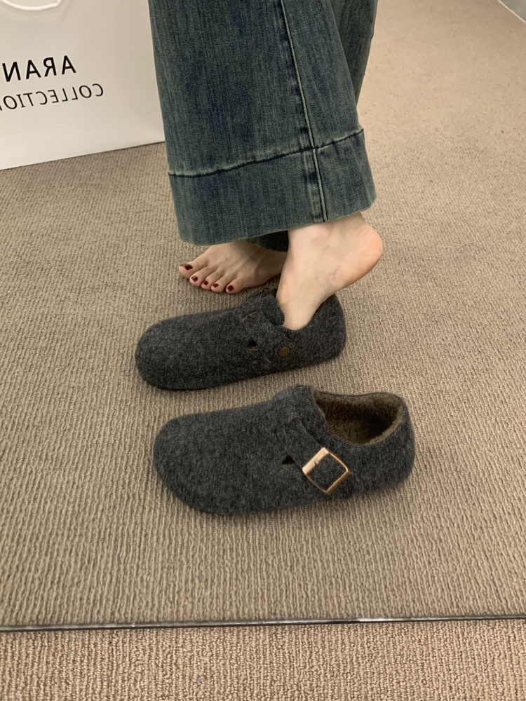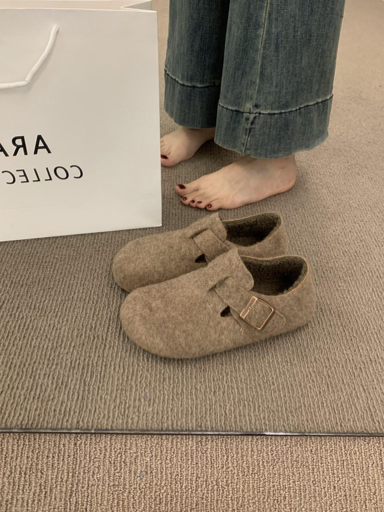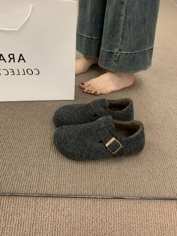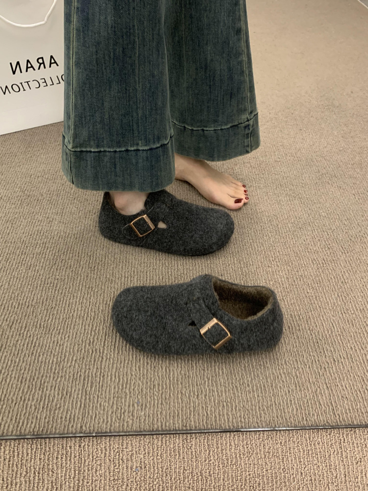 复古圆头毛毡加绒勃肯鞋女加绒秋冬季一脚蹬保暖棉瓢鞋毛呢乐福鞋