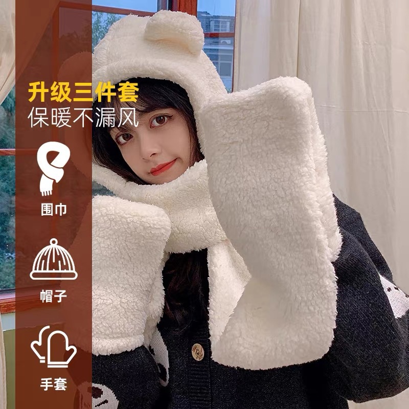 秋冬季帽子女可爱毛绒绒围巾加厚一体围脖毛绒帽骑车保暖护耳帽子