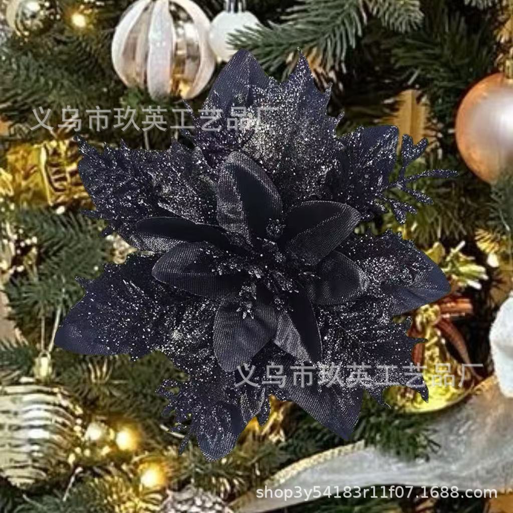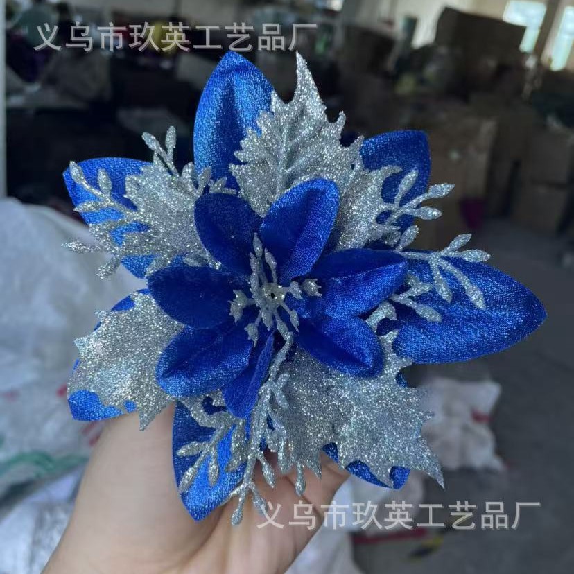 跨境银粉色圣诞花一品红仿真花圣诞树装饰圣诞节婚礼花环配件批发