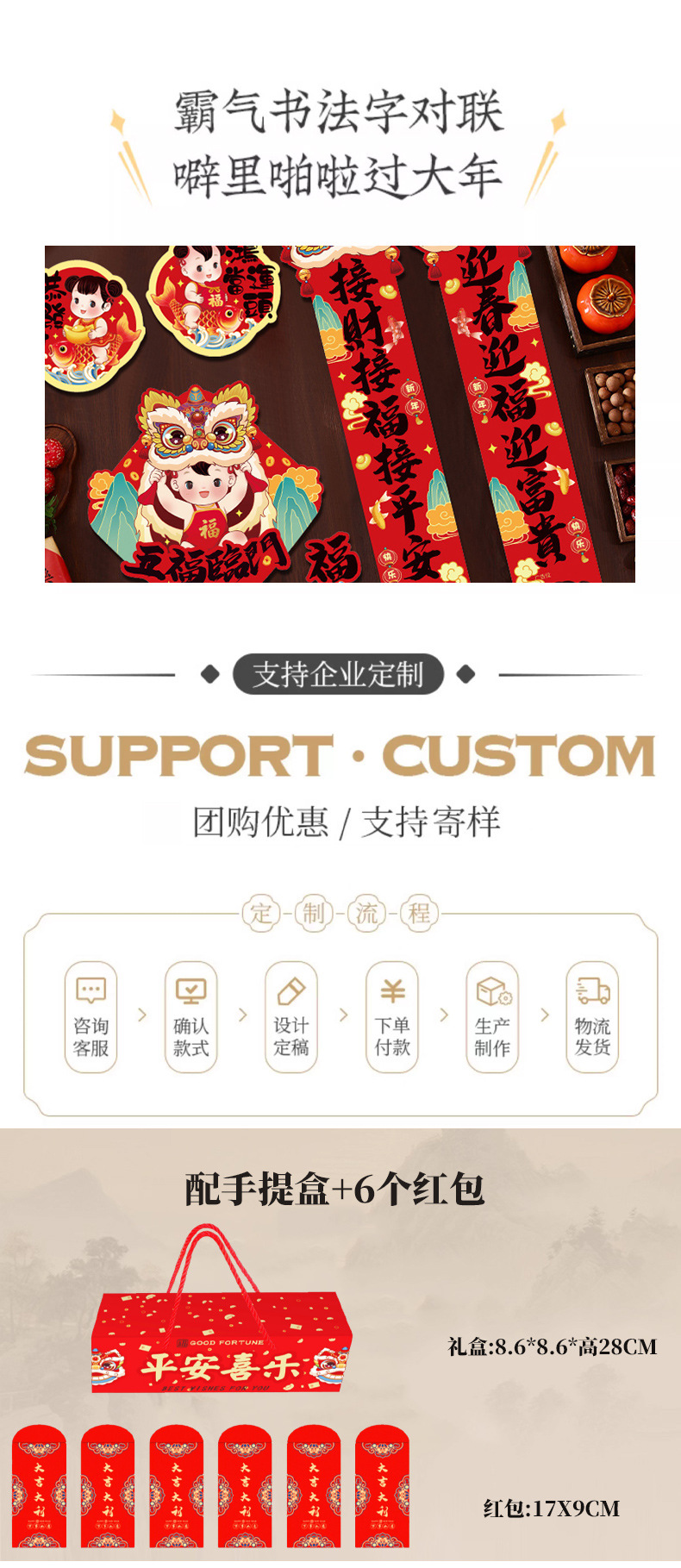 | including 6 red envelopes and 1 portable box(含6个红包和1个手提盒) | USD $2.73 | 889824 set available |