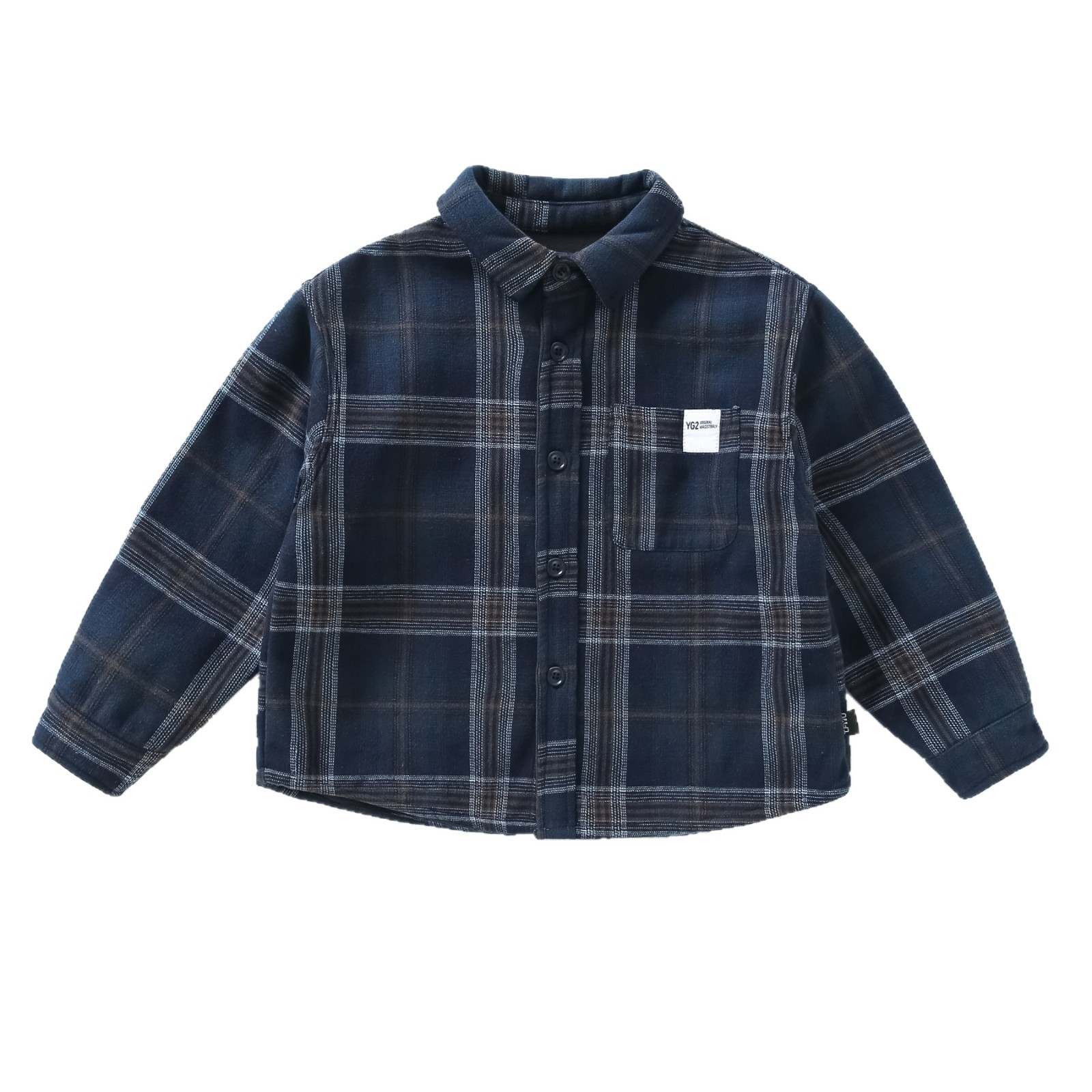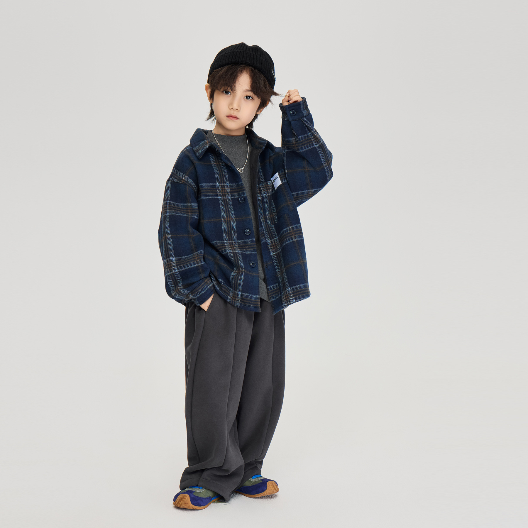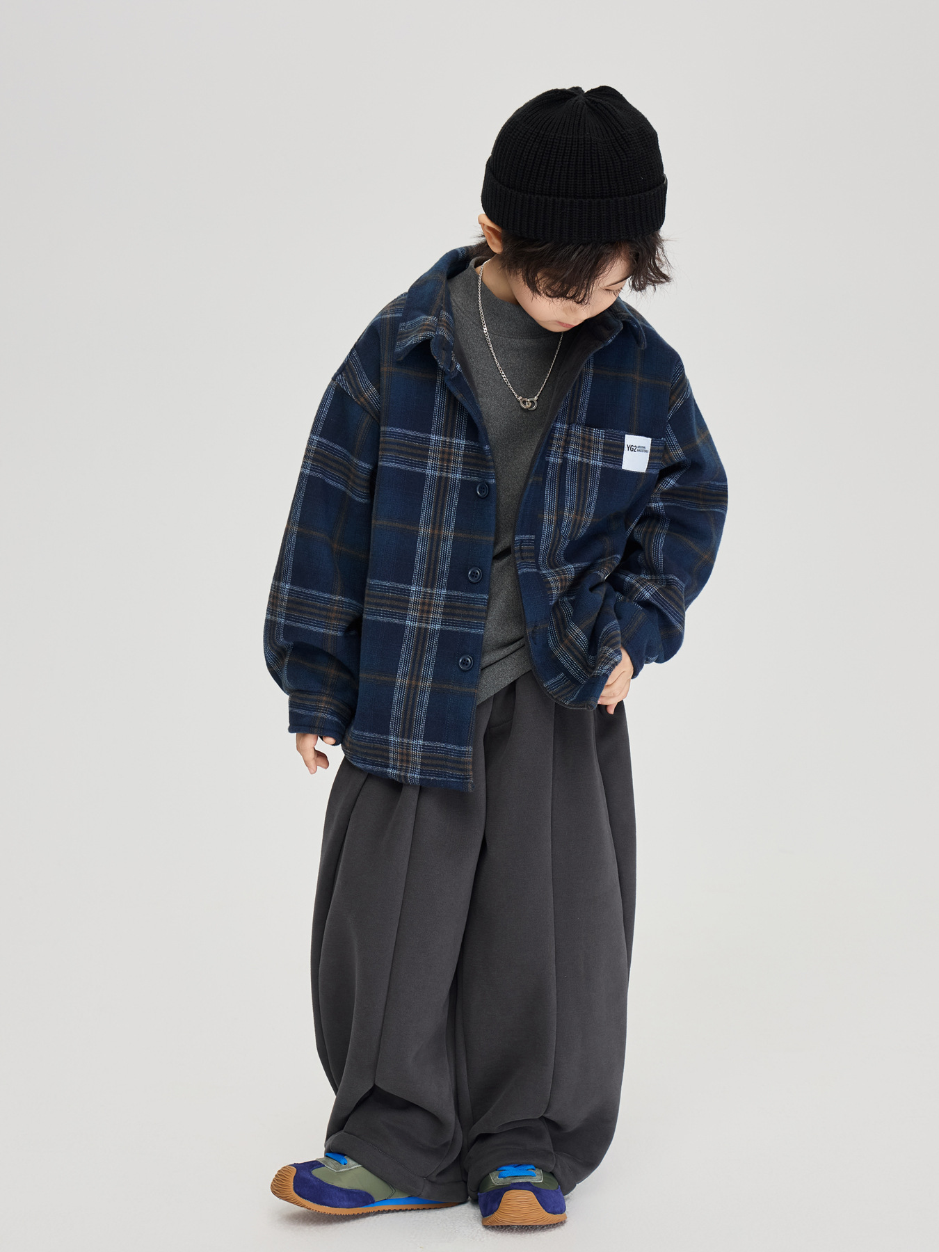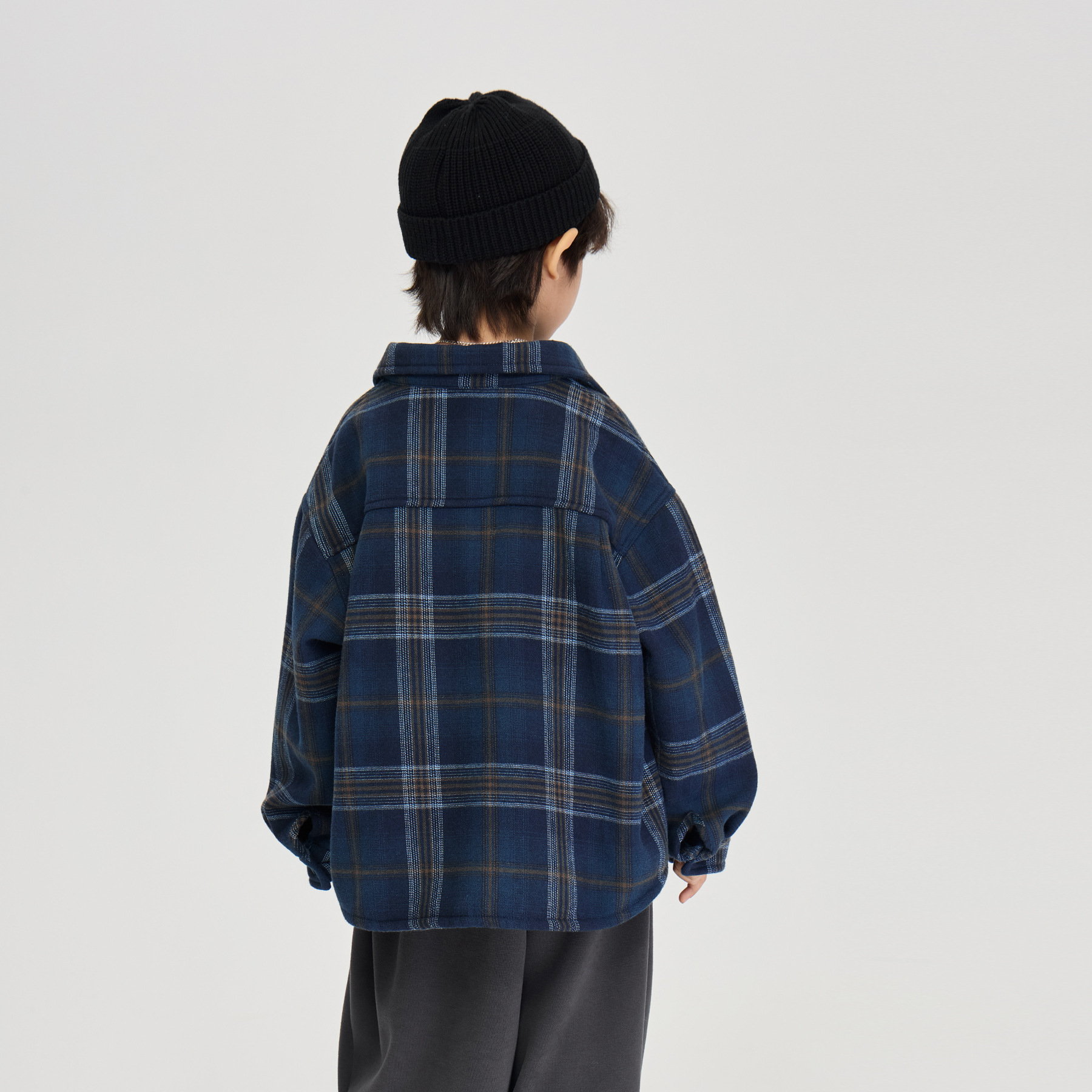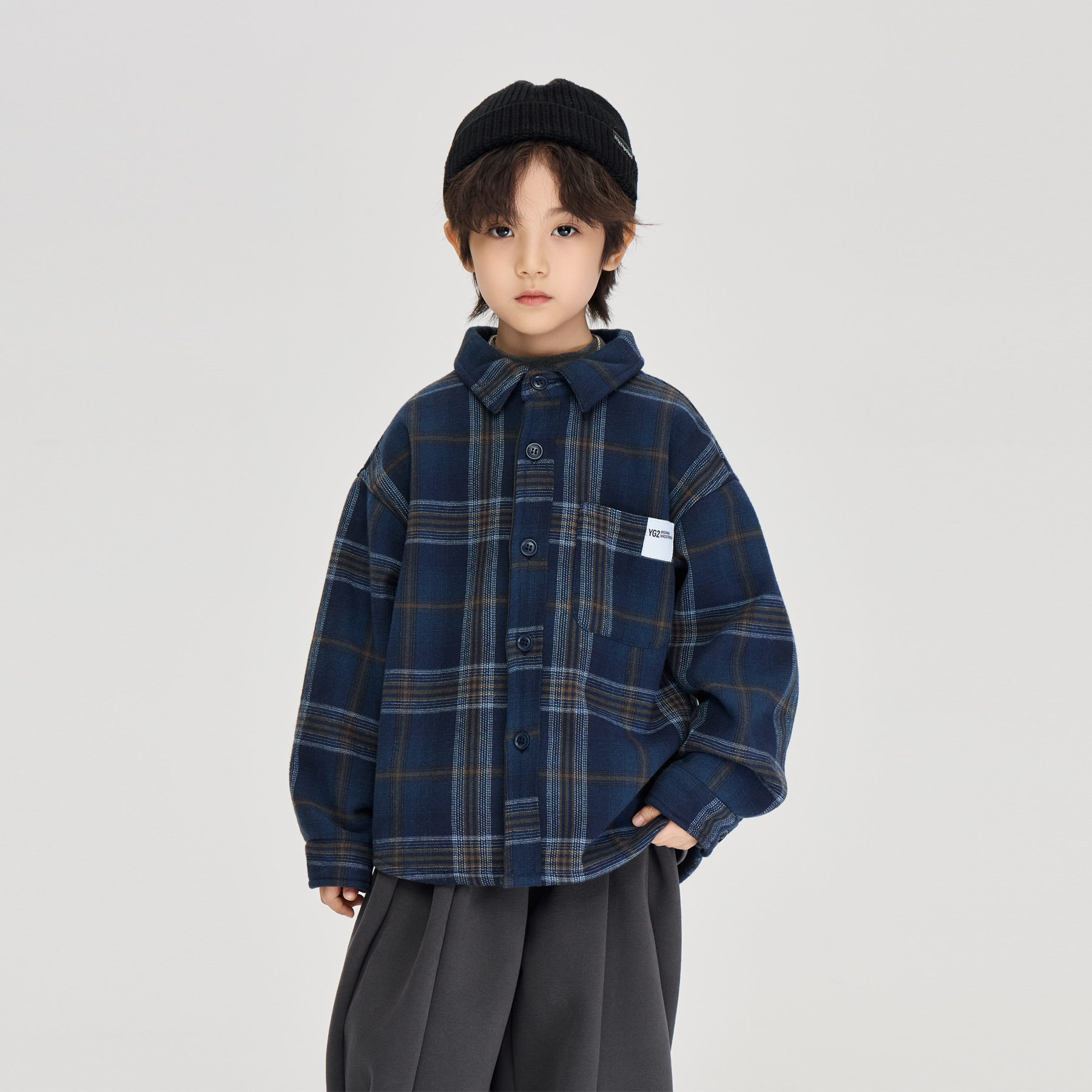2025冬季新款儿童日系复古加厚衬衣外套男中大童一体绒格子衬衫潮