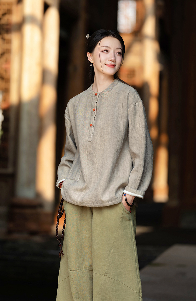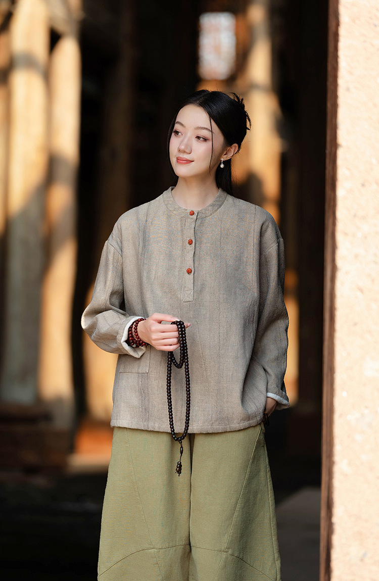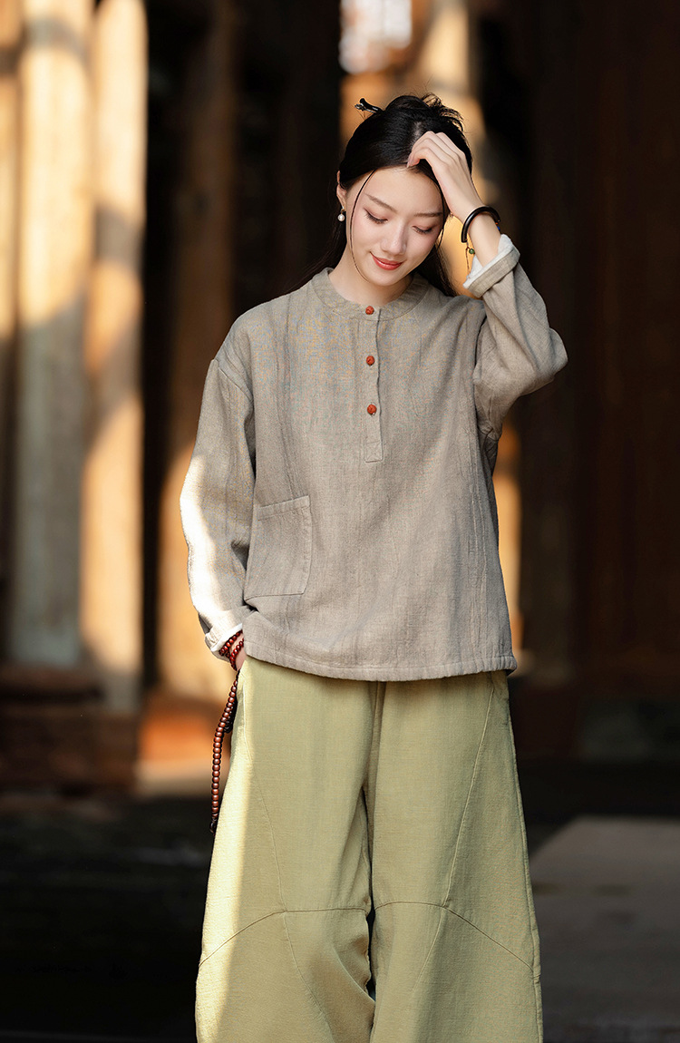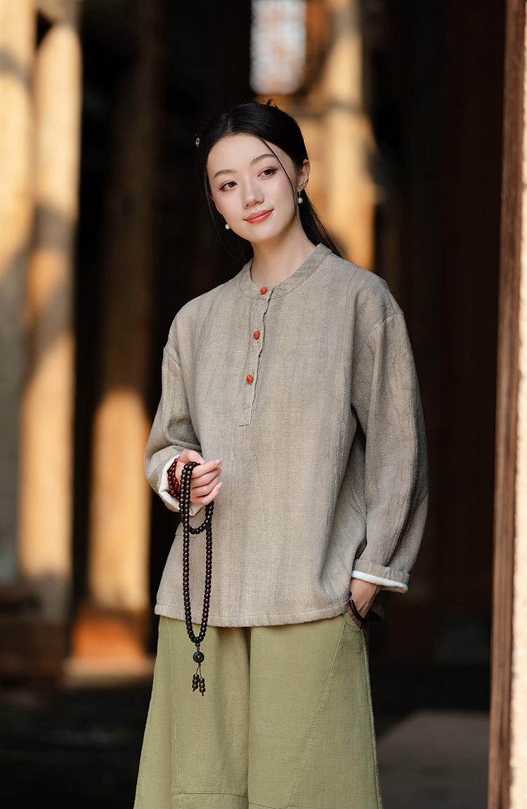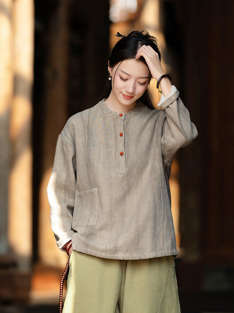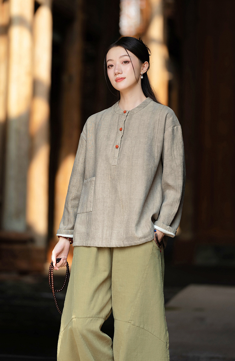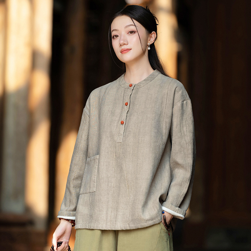 25冬新款棉麻女式衬衫立领拼色盘扣宽松复古禅意套头加绒加厚上衣