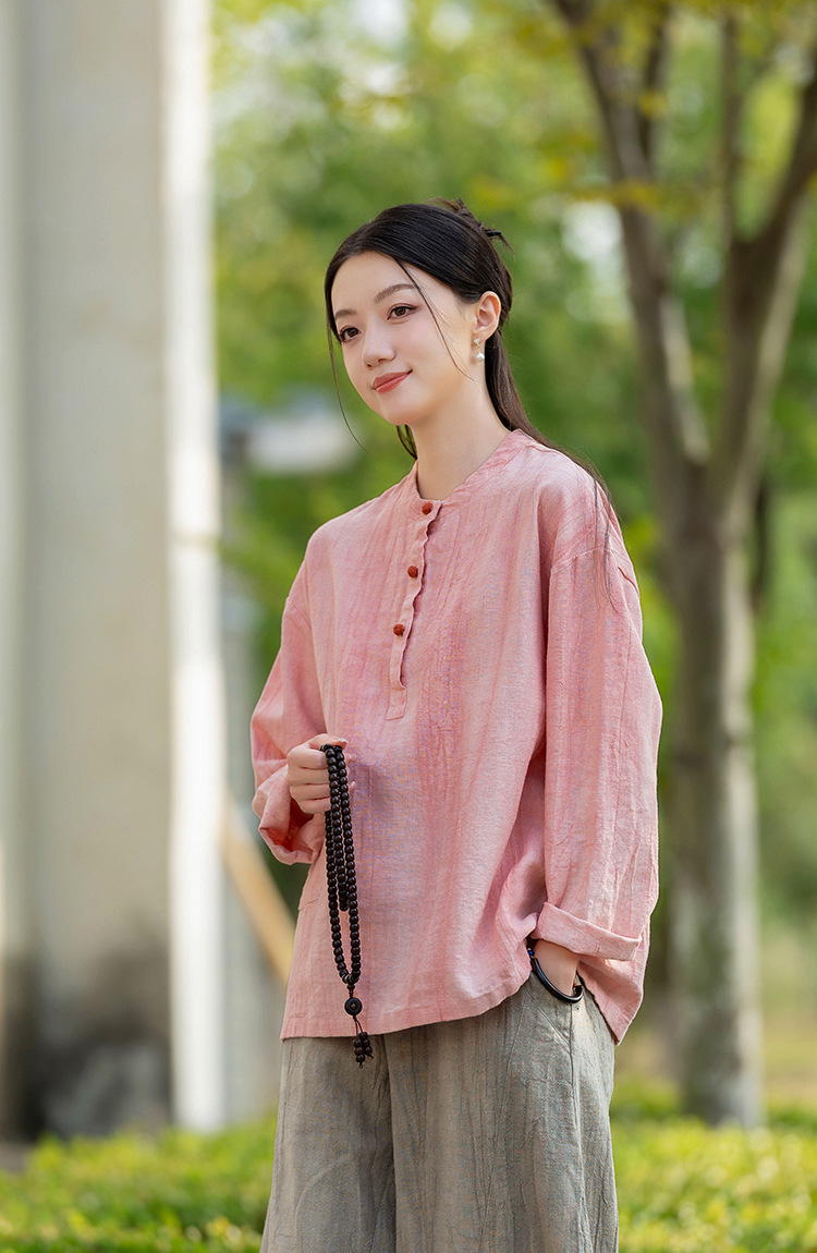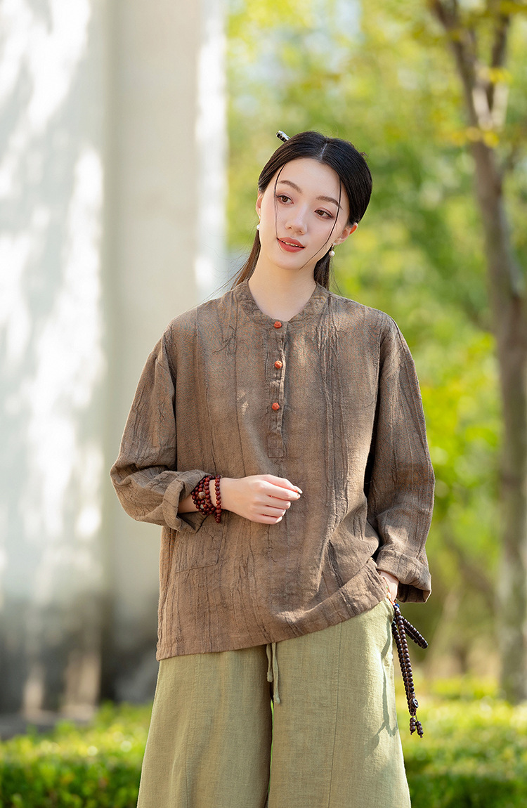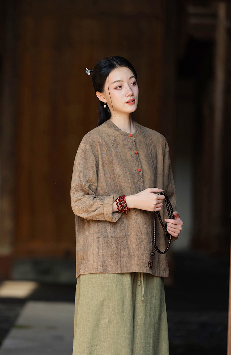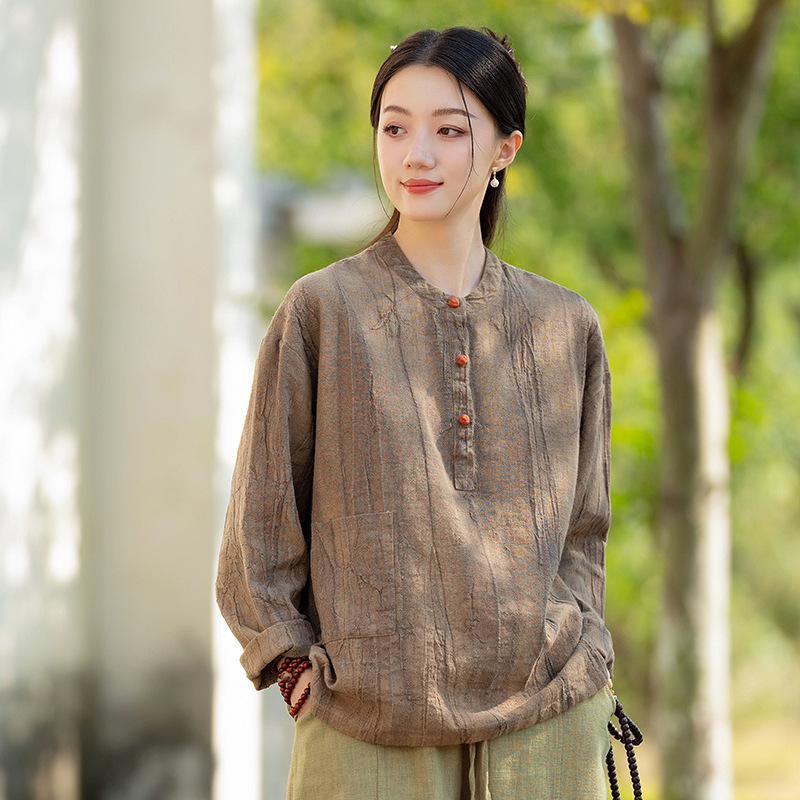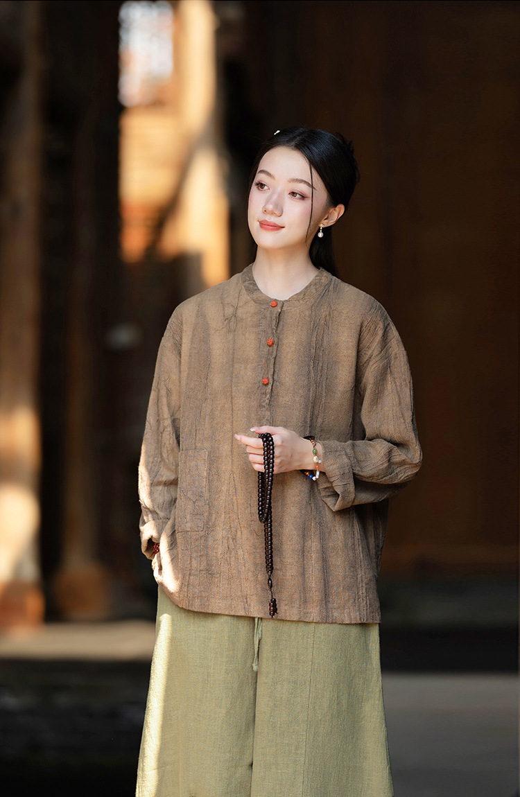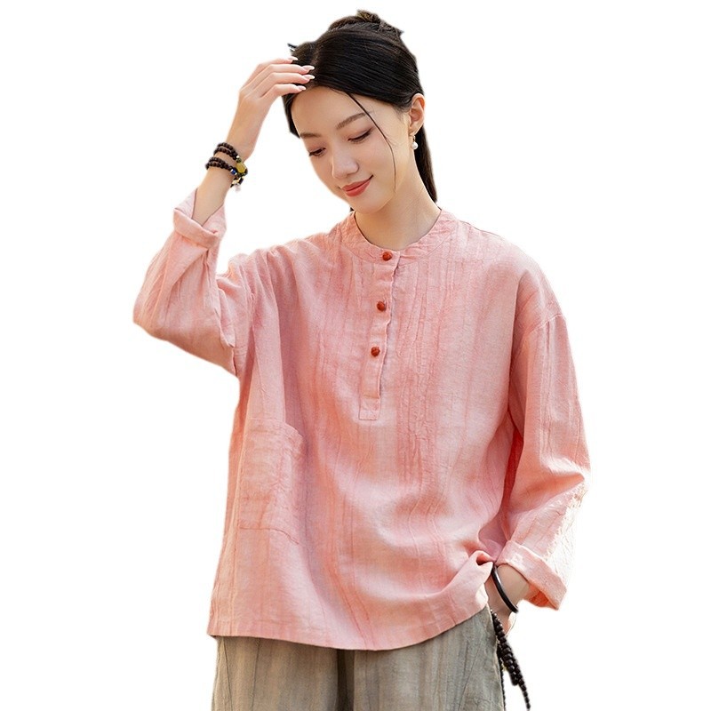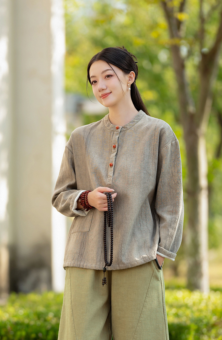 25冬新款棉麻女式衬衫立领拼色盘扣宽松复古禅意套头加绒加厚上衣