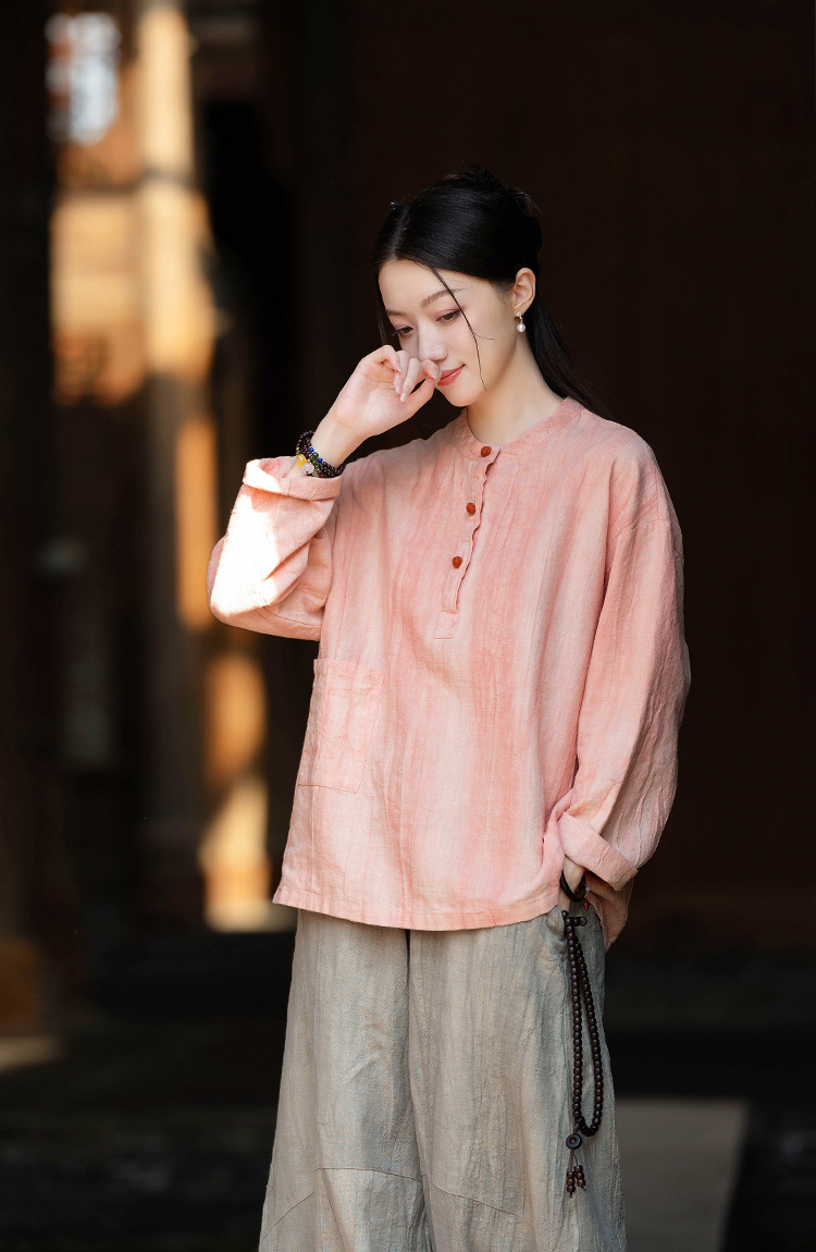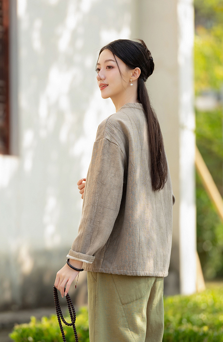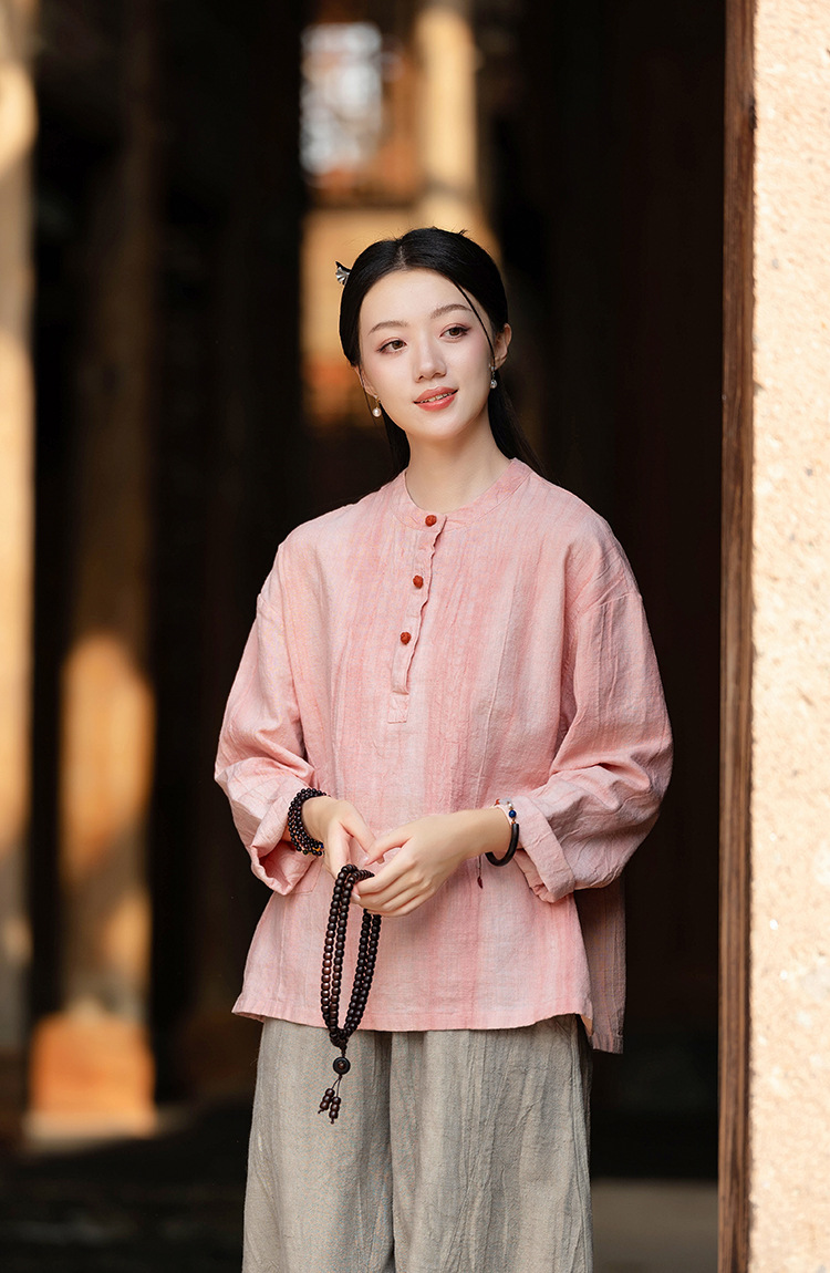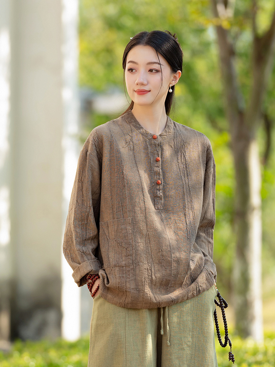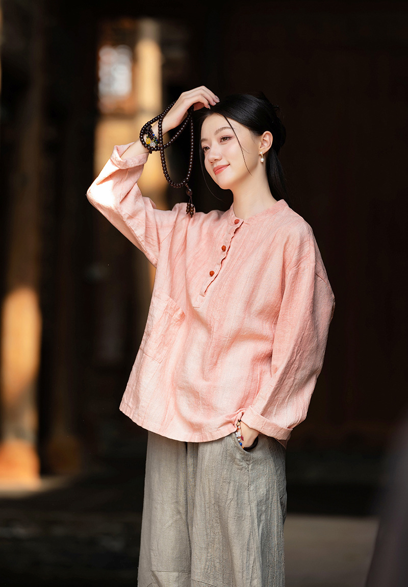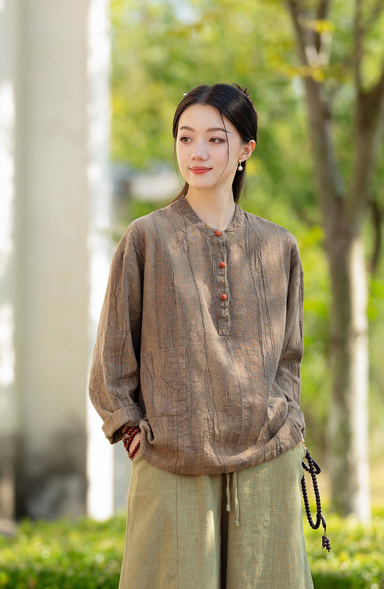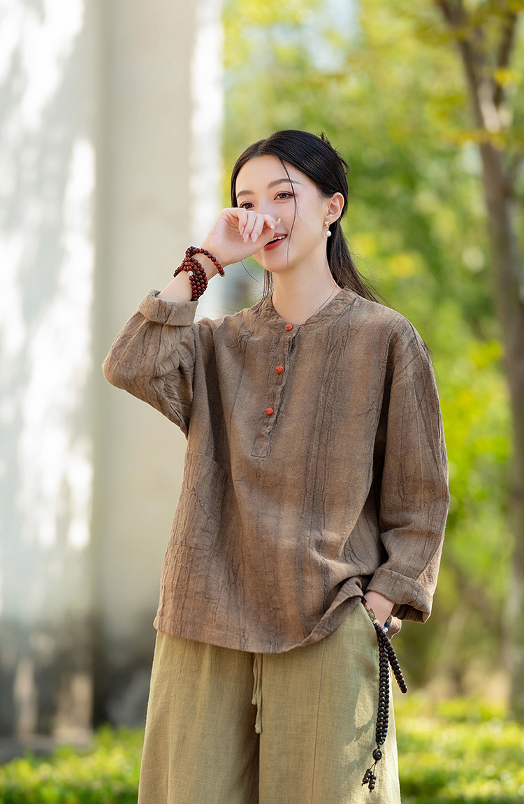 25冬新款棉麻女式衬衫立领拼色盘扣宽松复古禅意套头加绒加厚上衣