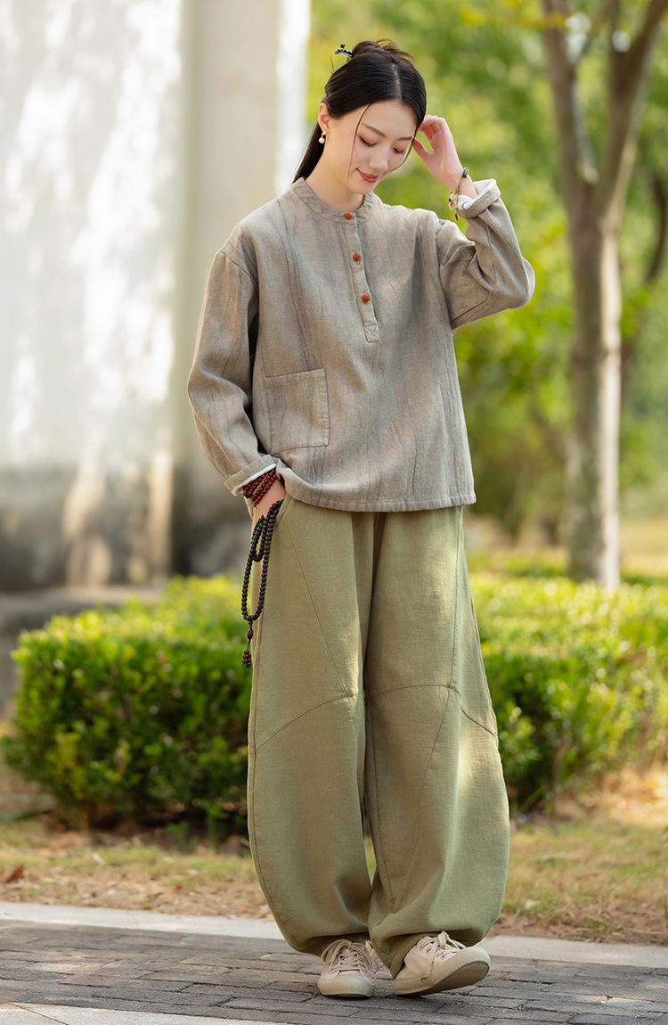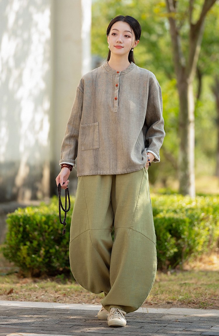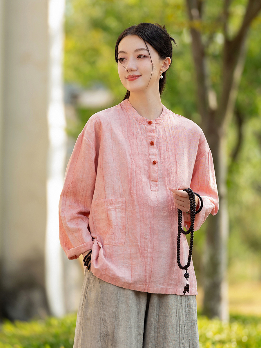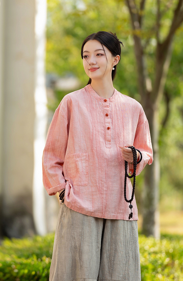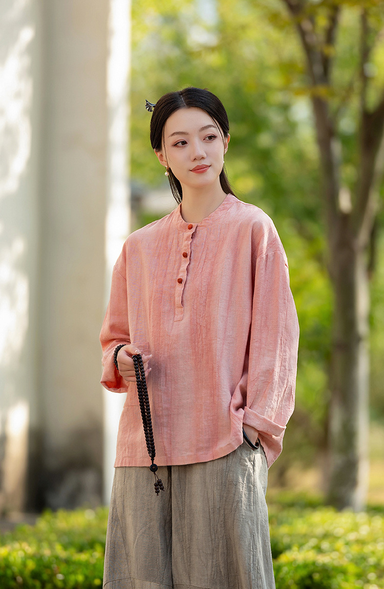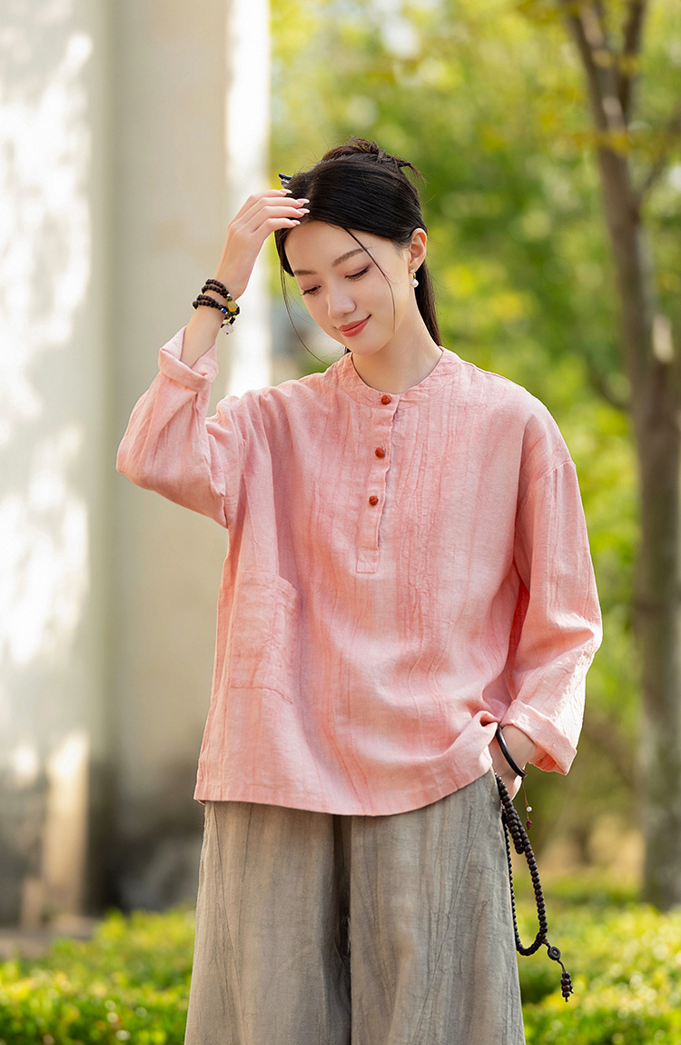 25冬新款棉麻女式衬衫立领拼色盘扣宽松复古禅意套头加绒加厚上衣