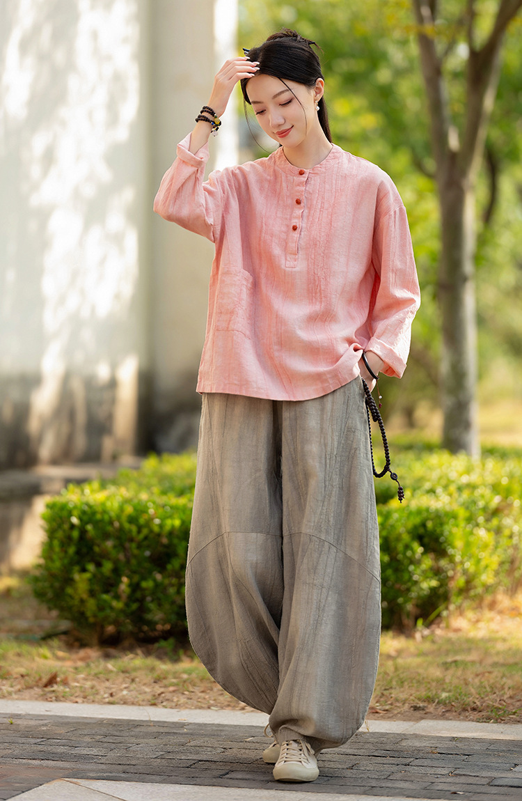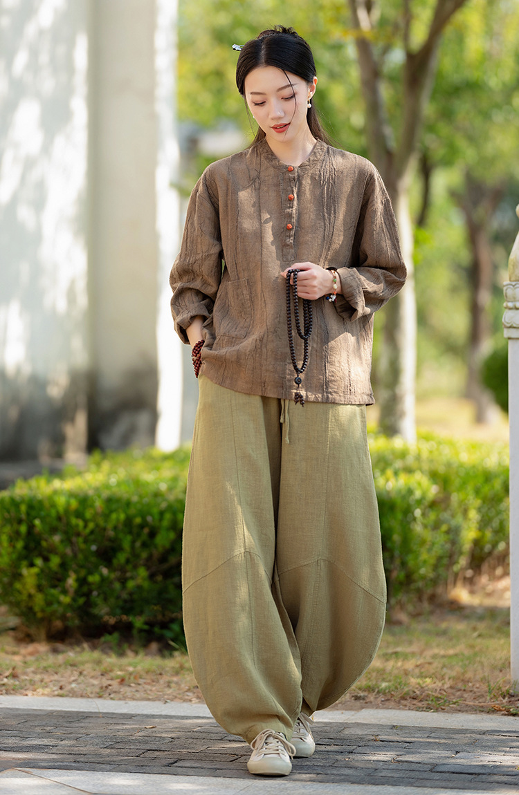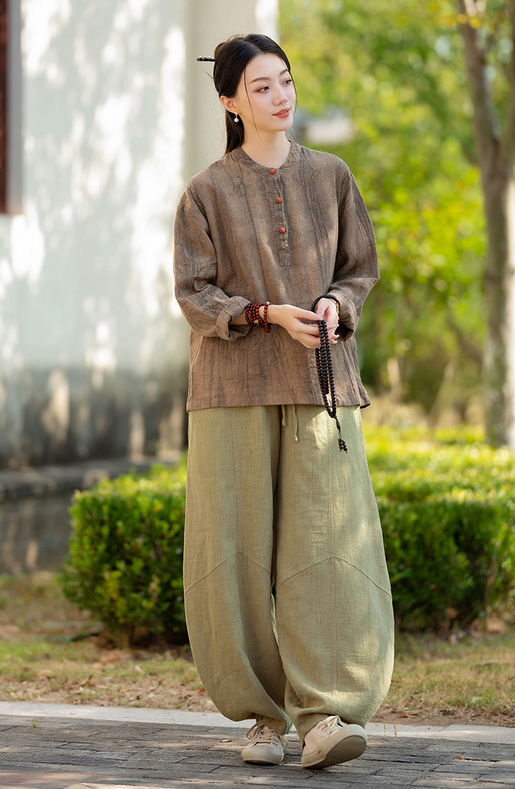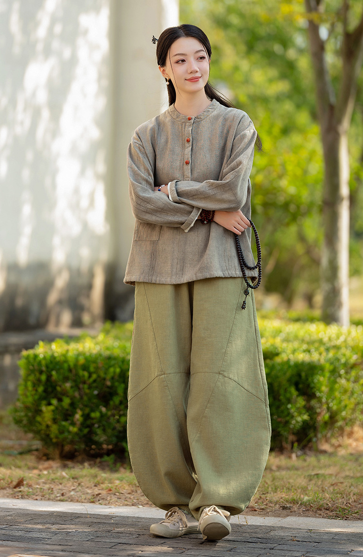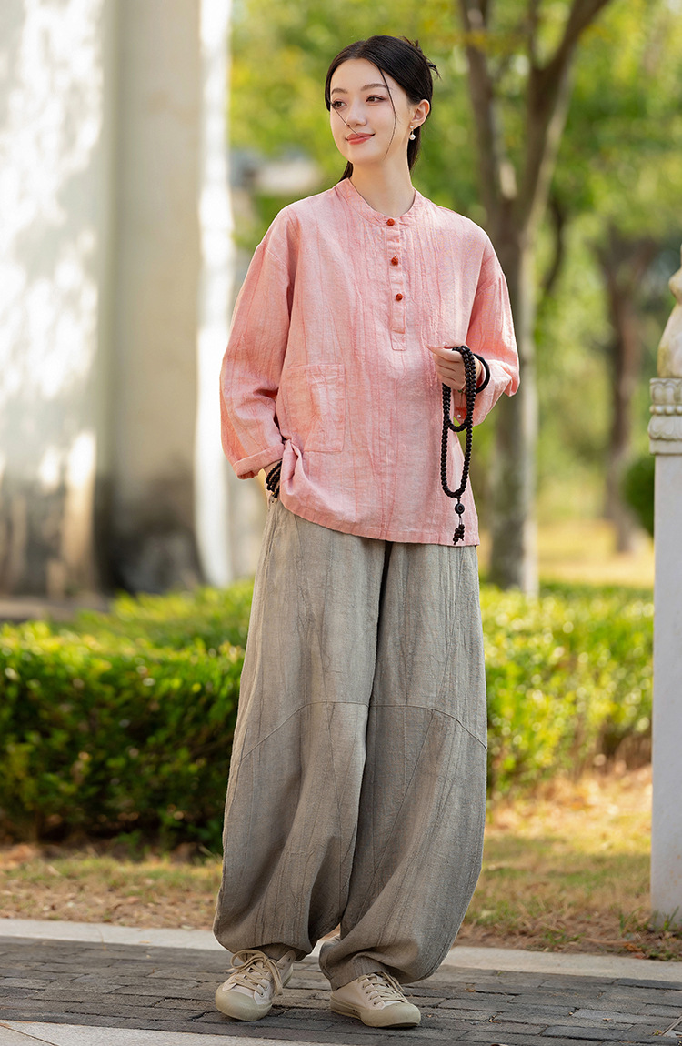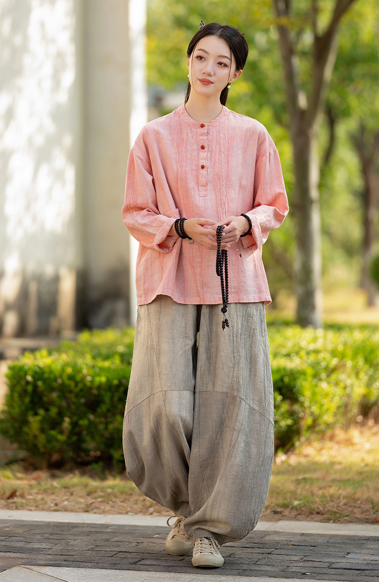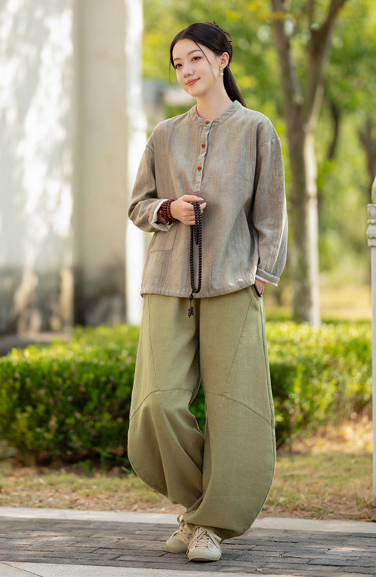 25冬新款棉麻女式衬衫立领拼色盘扣宽松复古禅意套头加绒加厚上衣
