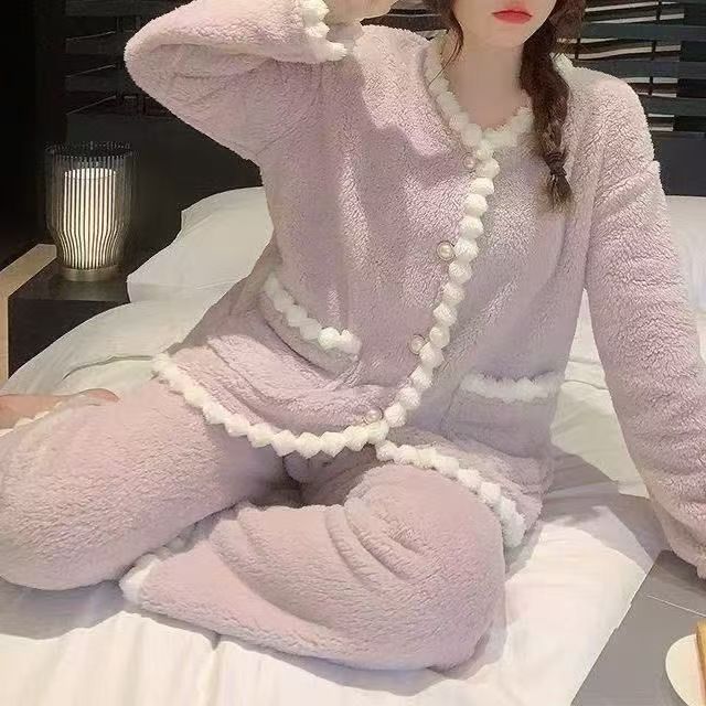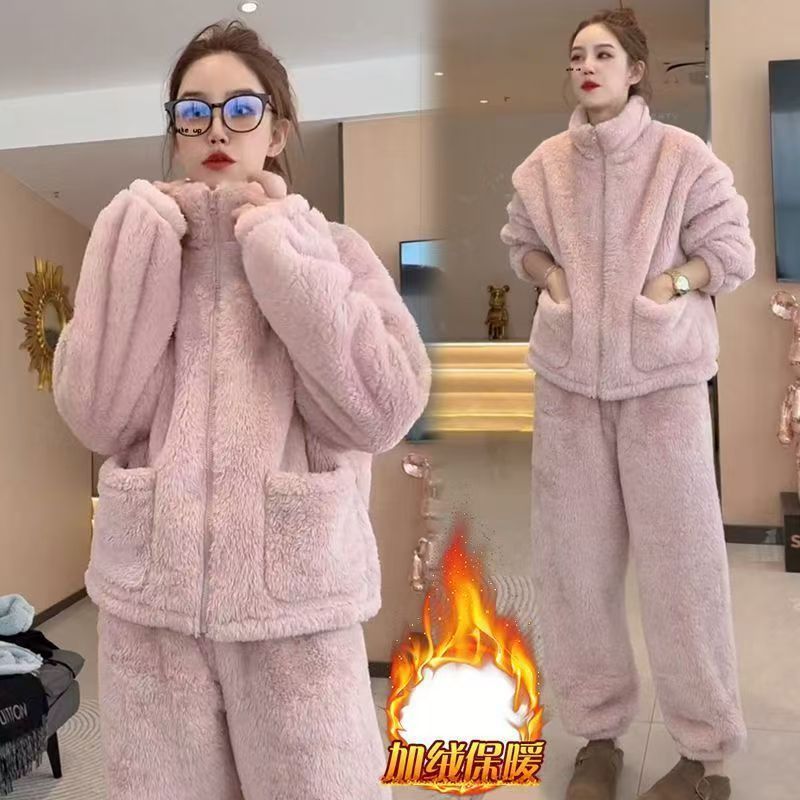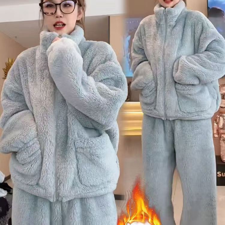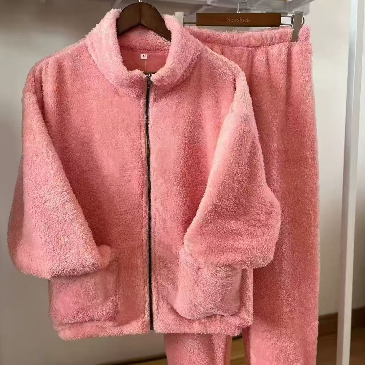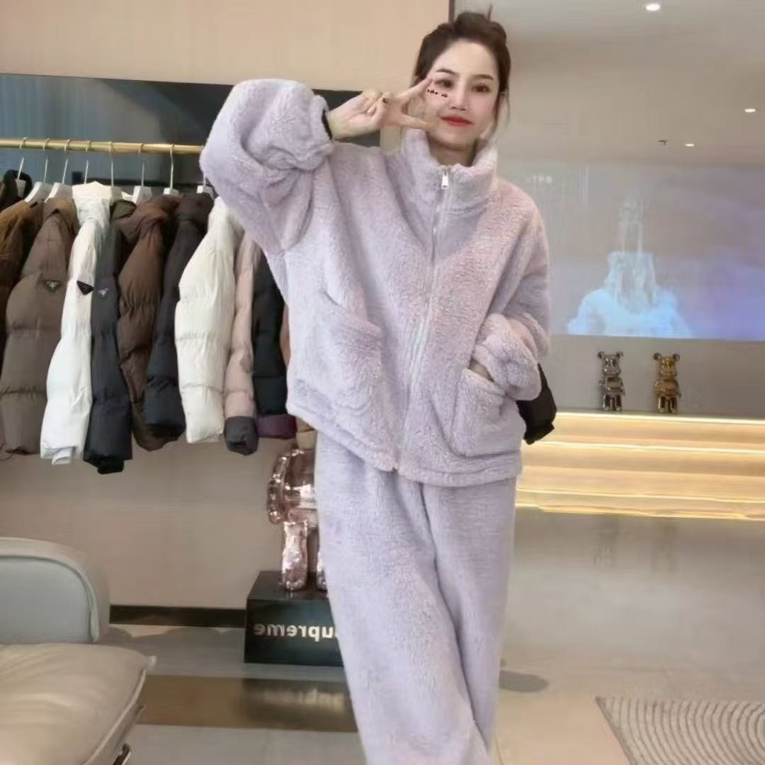 可外穿珊瑚绒春秋睡衣女开衫拉链套装女韩系情侣家居服两件套装
