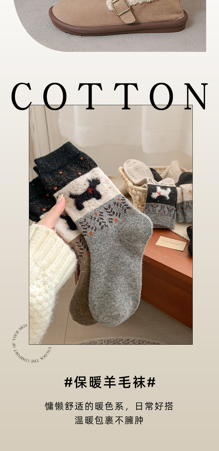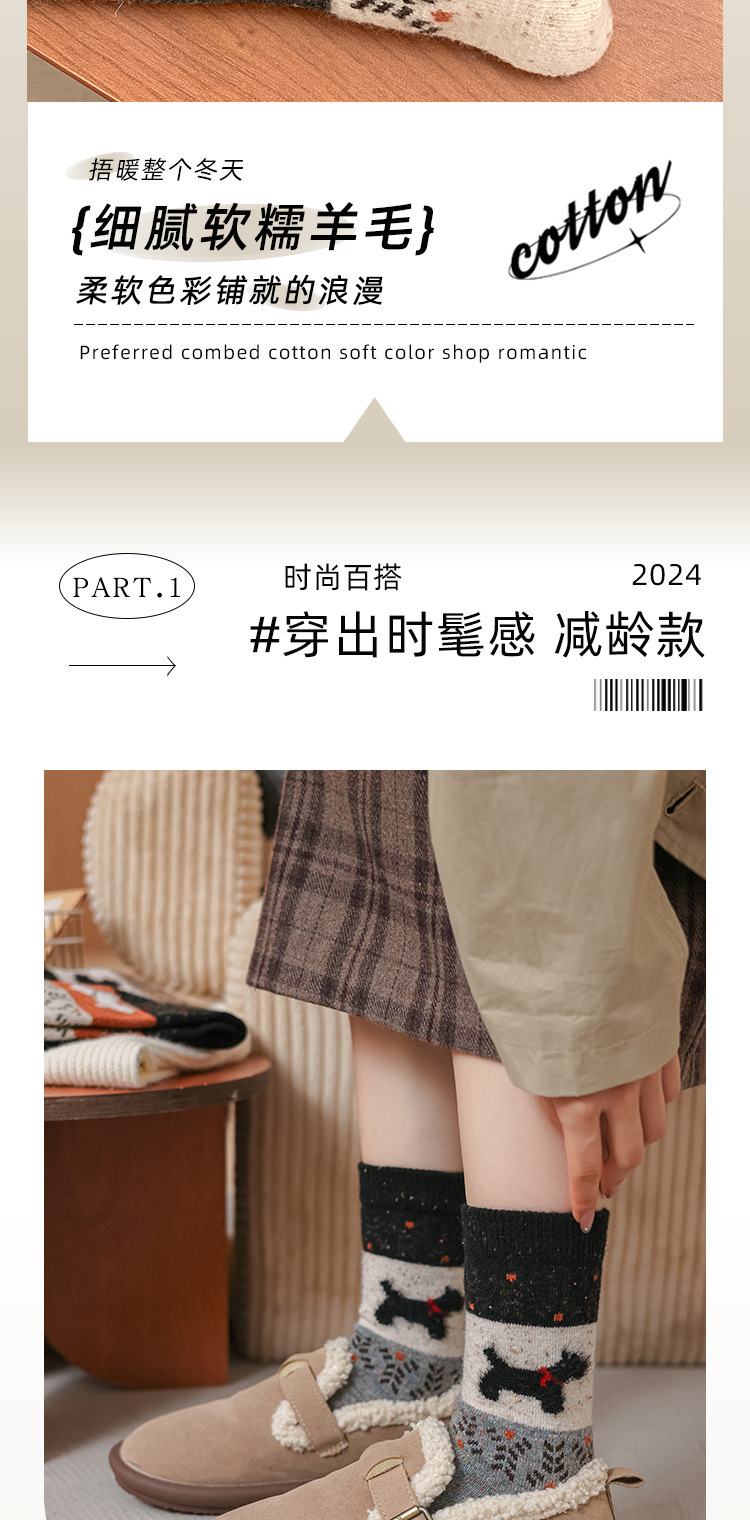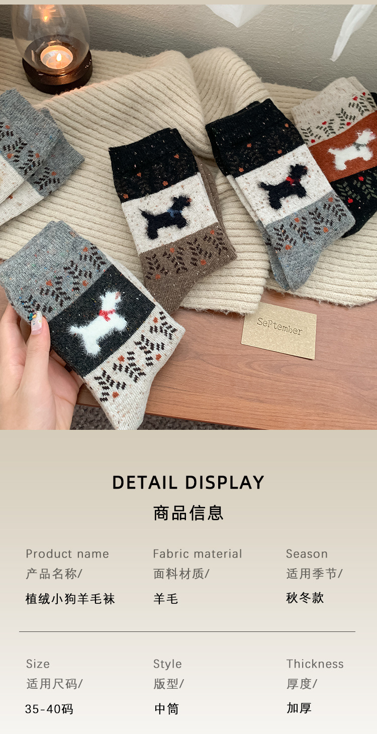 复古费尔岛小狗羊毛袜秋冬加厚保暖中筒袜长袜堆堆袜可爱毛绒袜子