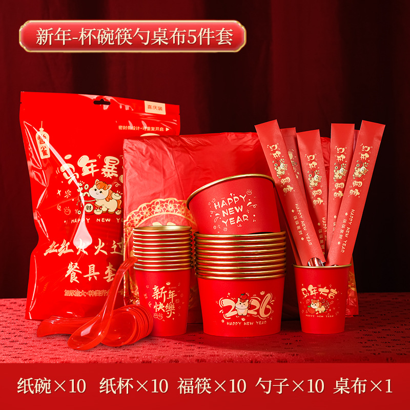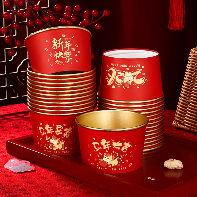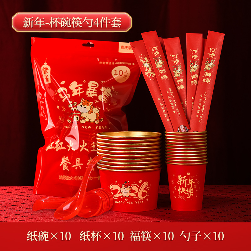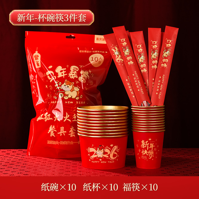 2026马年金箔一次性纸杯纸碗套装食品级加厚防烫新年聚餐待客餐具
