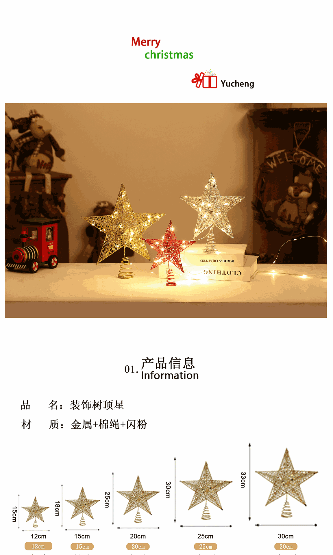 2025圣诞节树顶星铁艺发光五角星灯圣诞树顶灯顶星带灯装饰用礼品