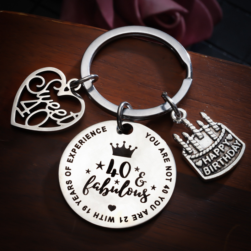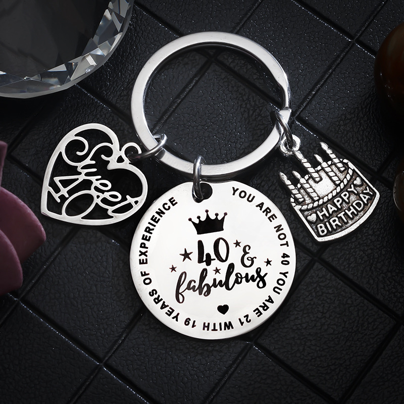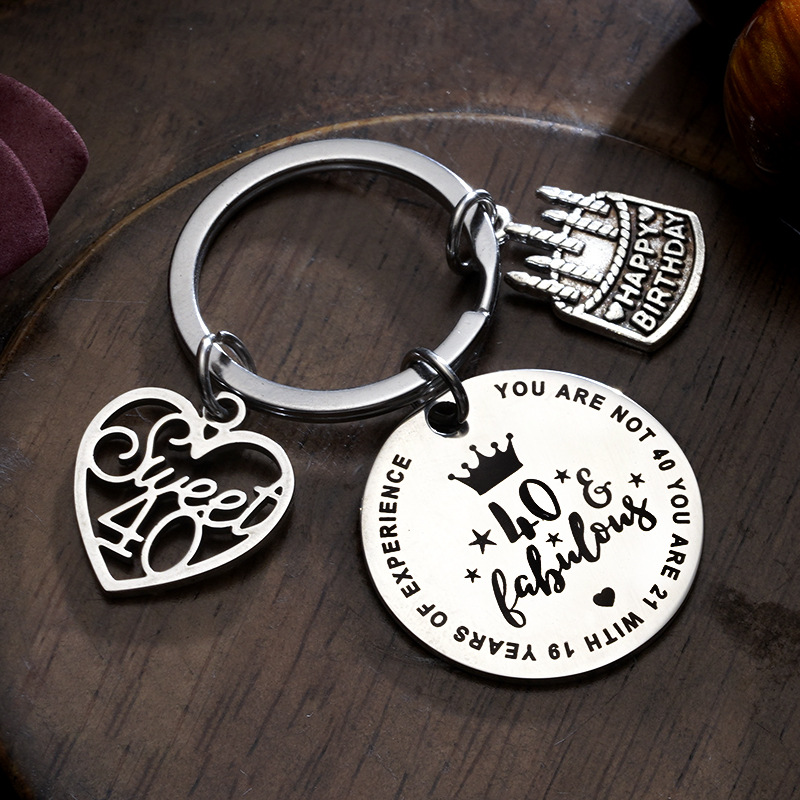 欧美跨境饰品40岁生日礼物蛋糕配件不锈钢钥匙扣刻字圆片厂家现货