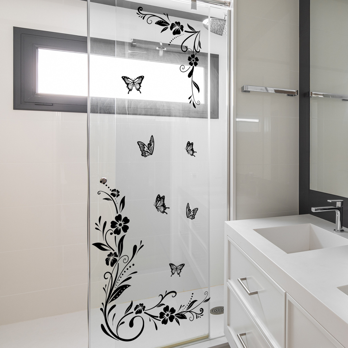 纯黑花卉蝴蝶浴室卫生间门贴浴缸贴卧室背景墙贴自粘墙贴