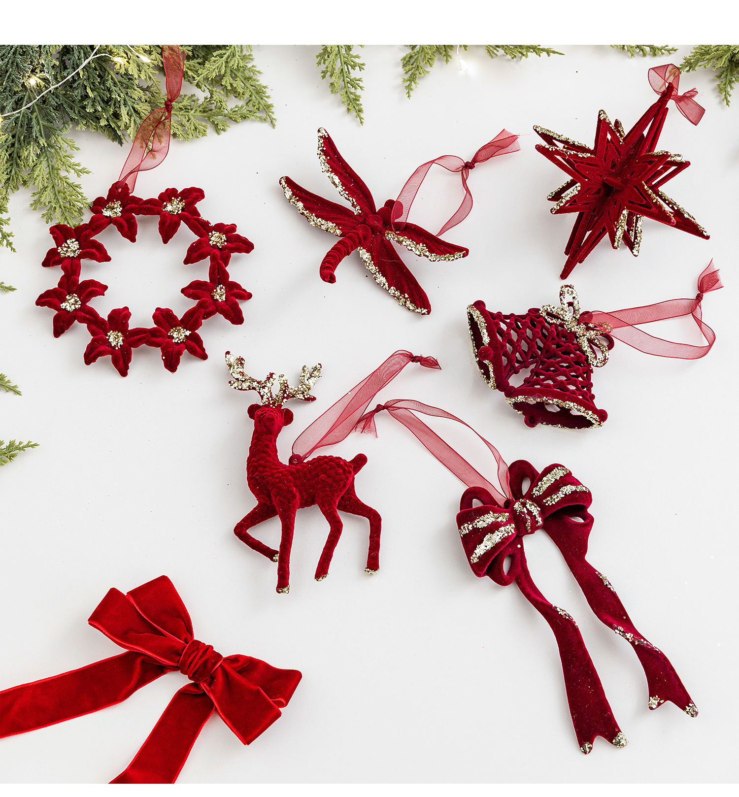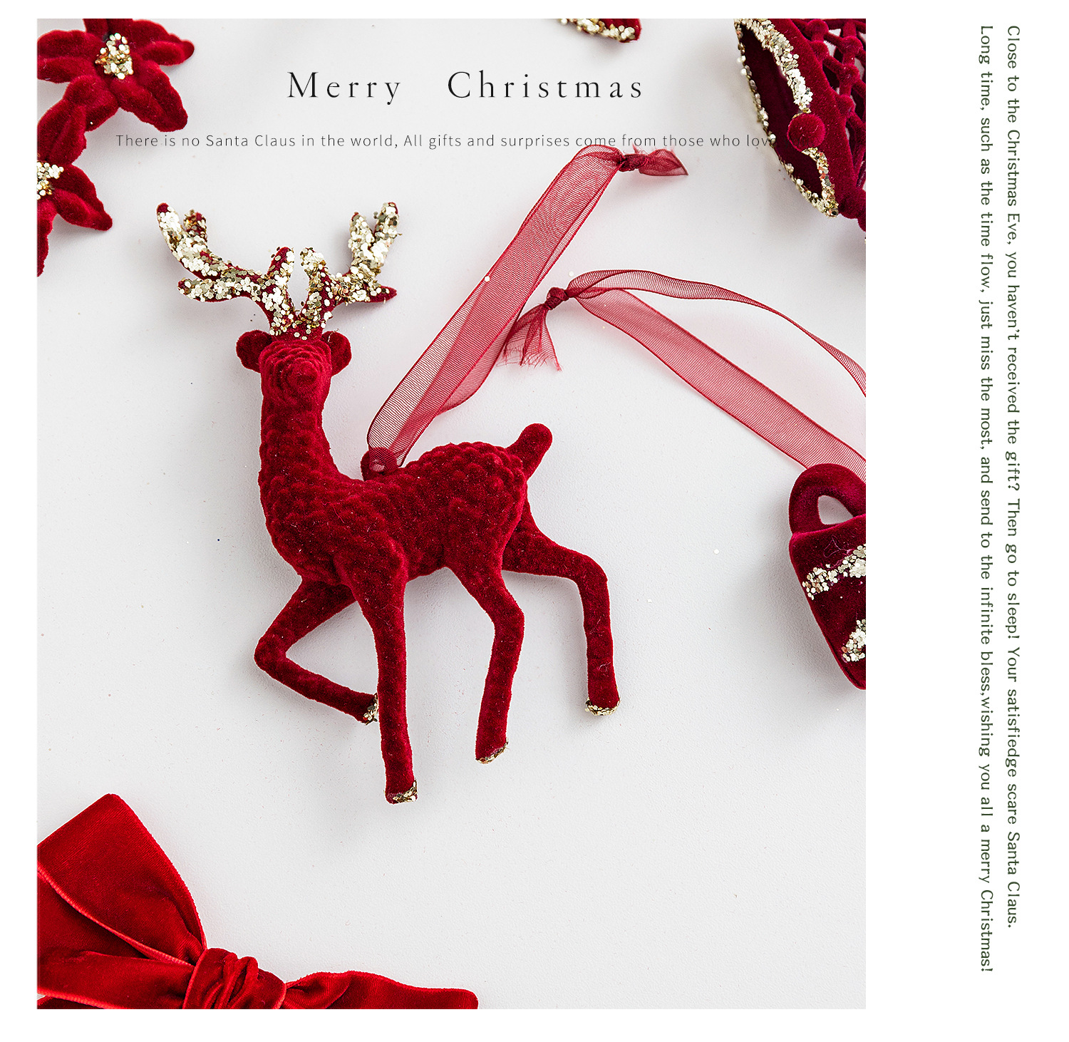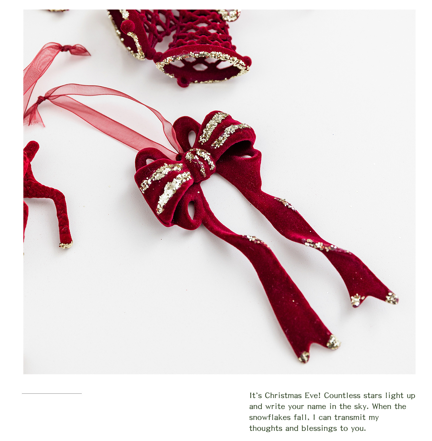 跨境新款圣诞酒红色植绒麋鹿蝴蝶结挂件diy蜻蜓花环圣诞树上挂饰