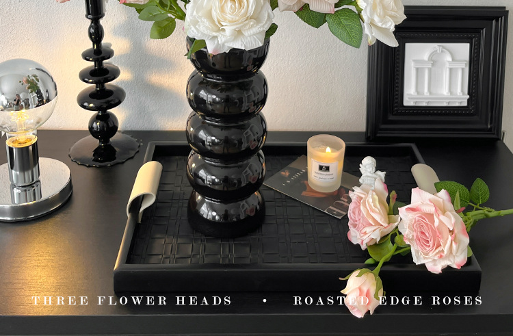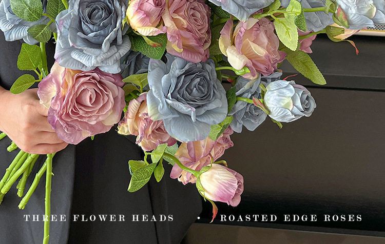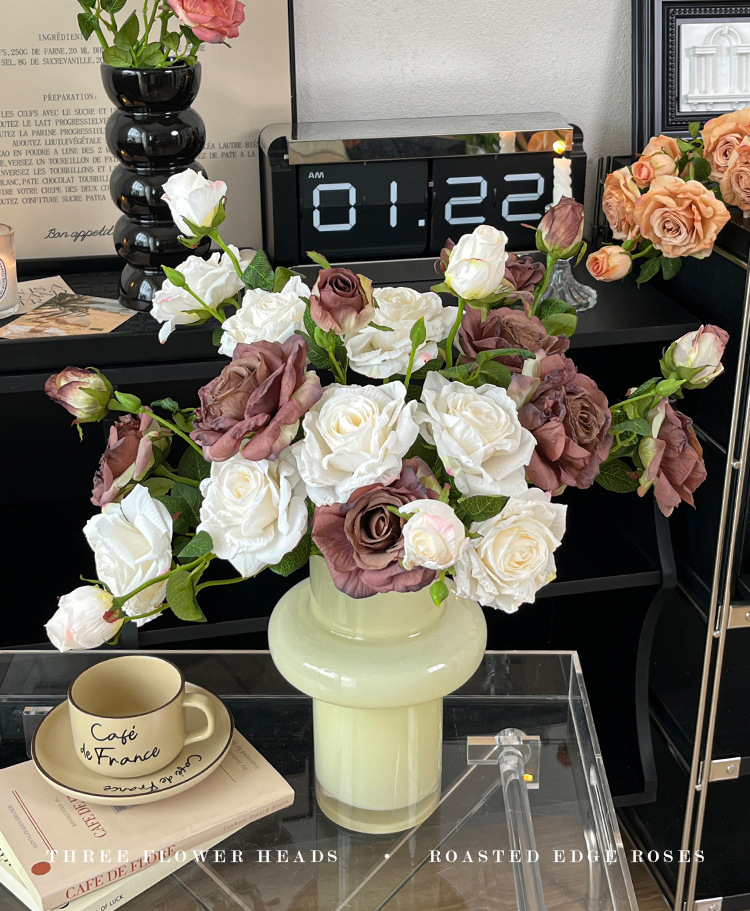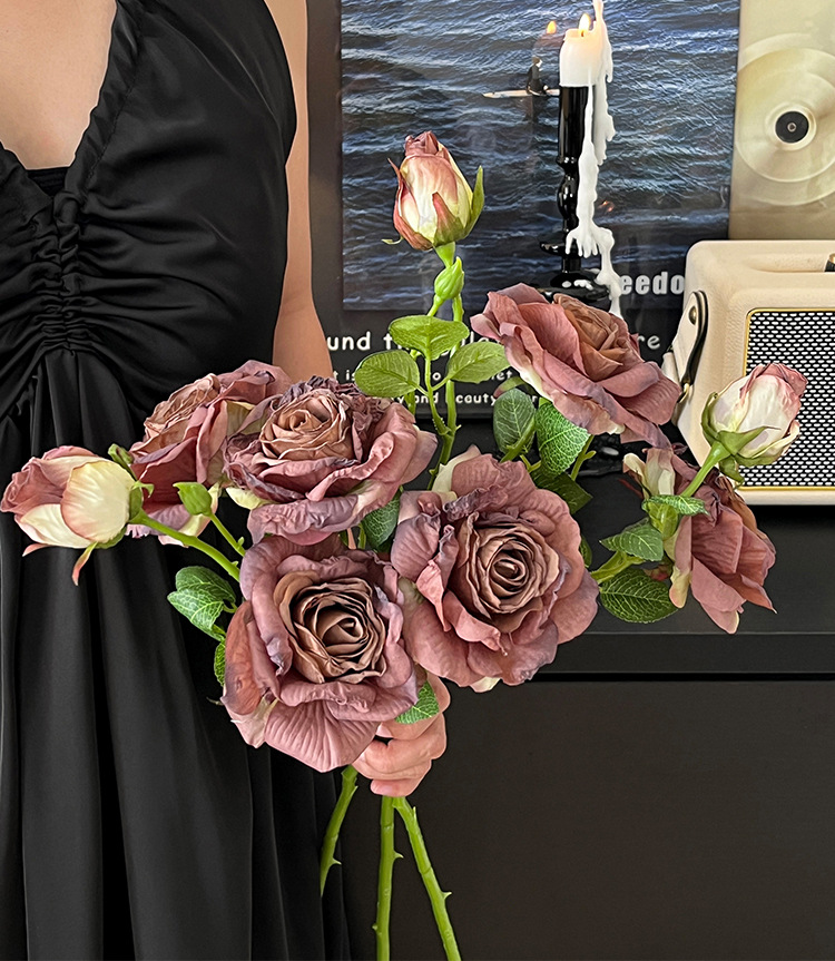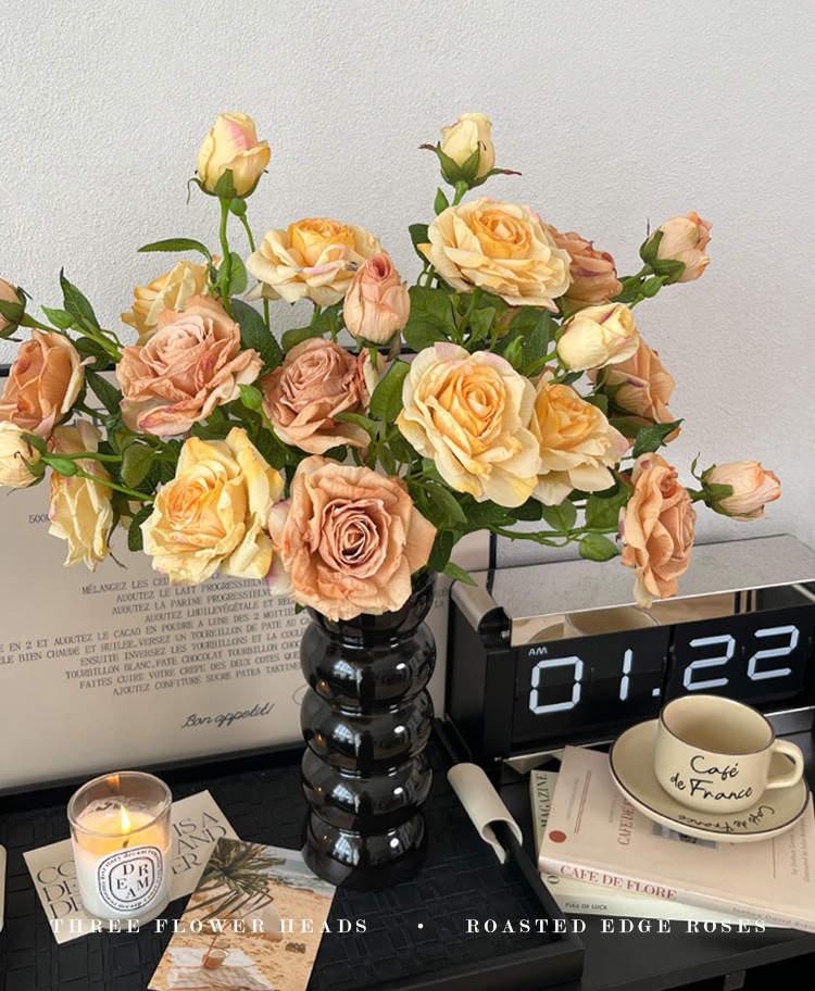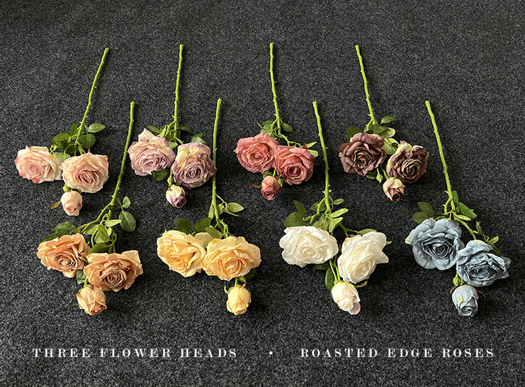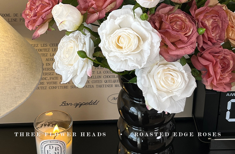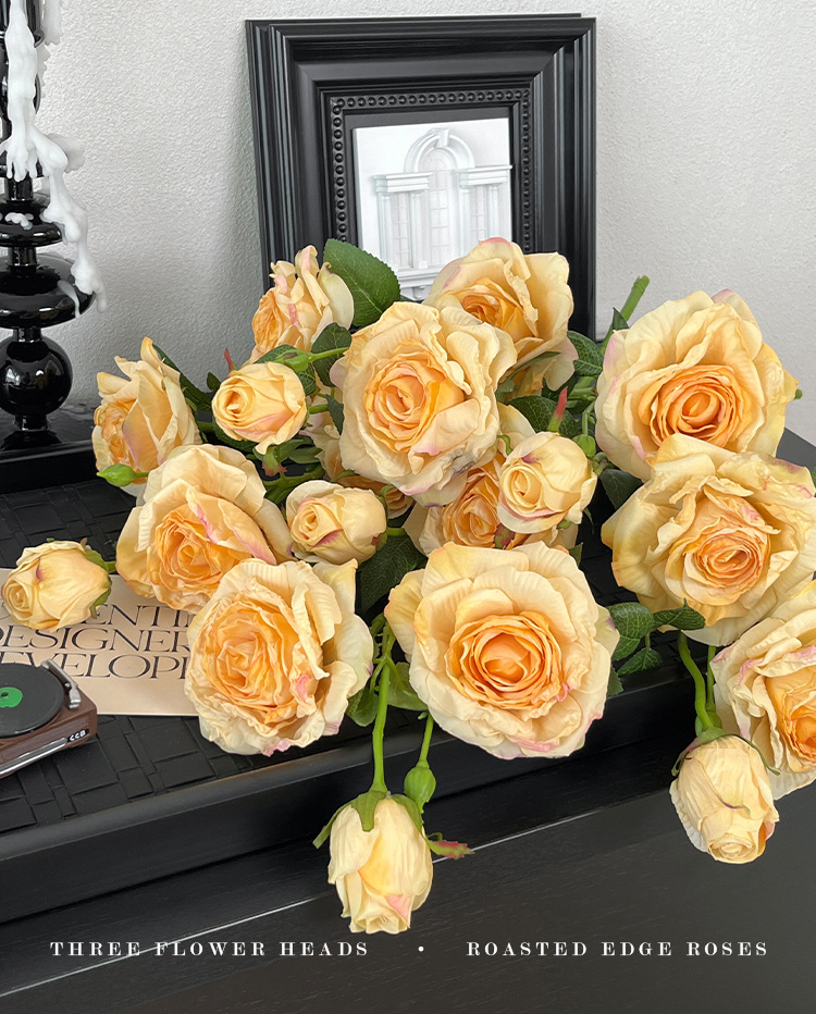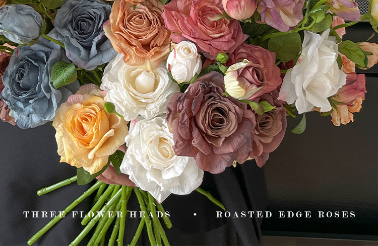 2花1苞烤边干枯玫瑰花仿真花束客厅摆件复古秋色假花装饰花仿真花