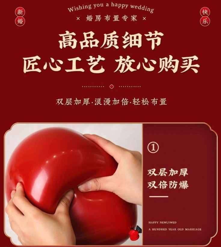 | double-layer new colorful double happy character + black red + rose gold-100 pcs/only balloon(双层新炫彩囍字+黑耀红+玫瑰金-100个/只有气球) | USD $2.22 | 8888 piece available |