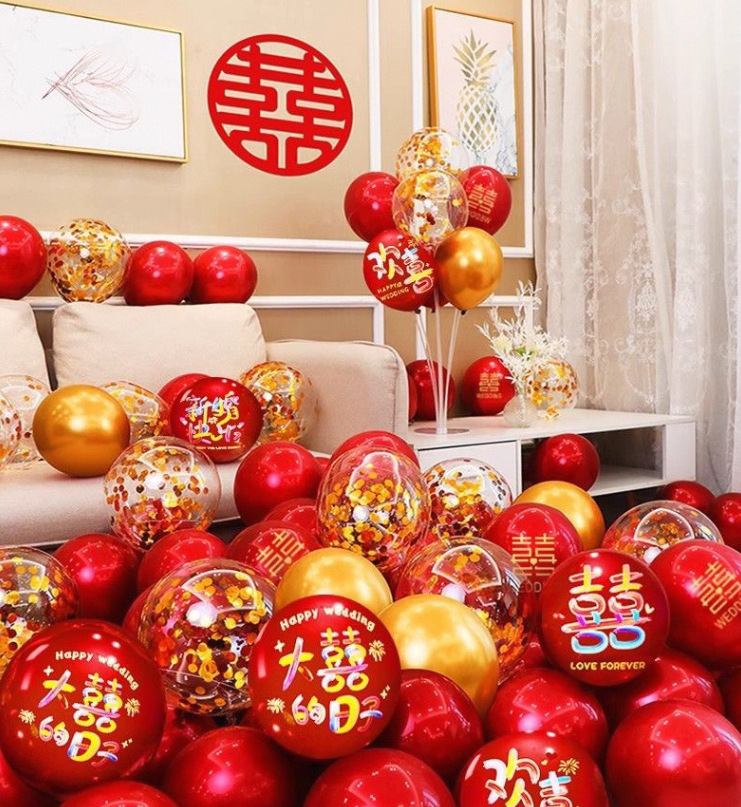 批发婚房装饰红色加厚结婚气球婚礼气球套装彩色字体双层乳胶气球