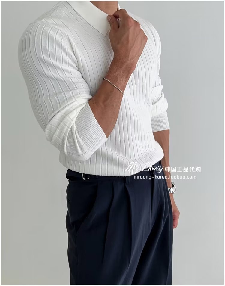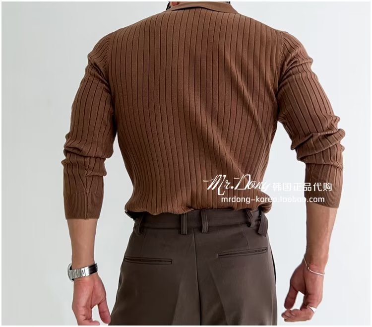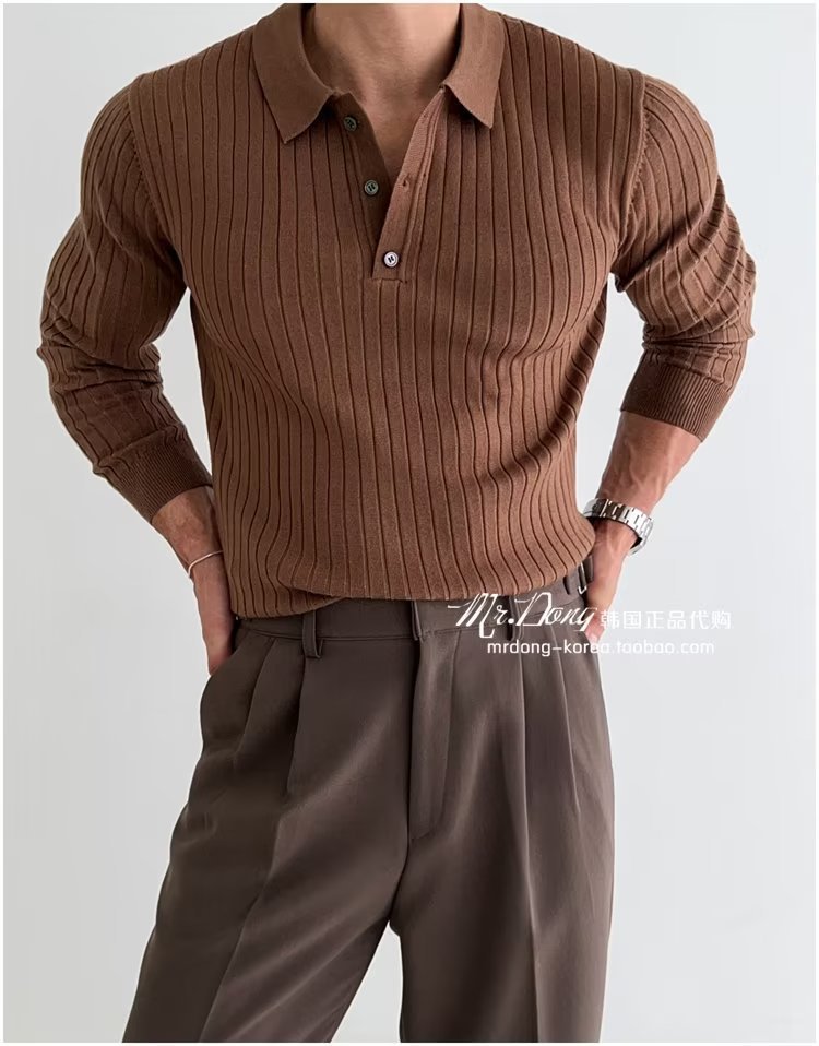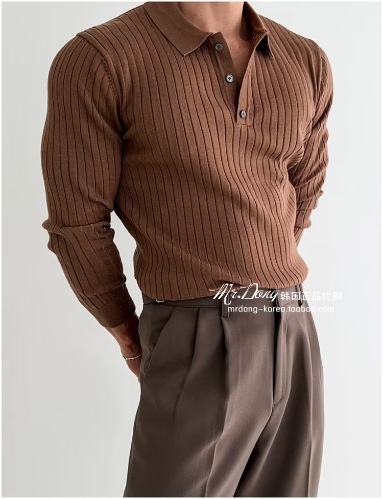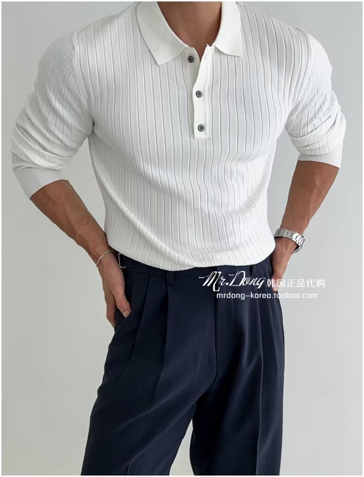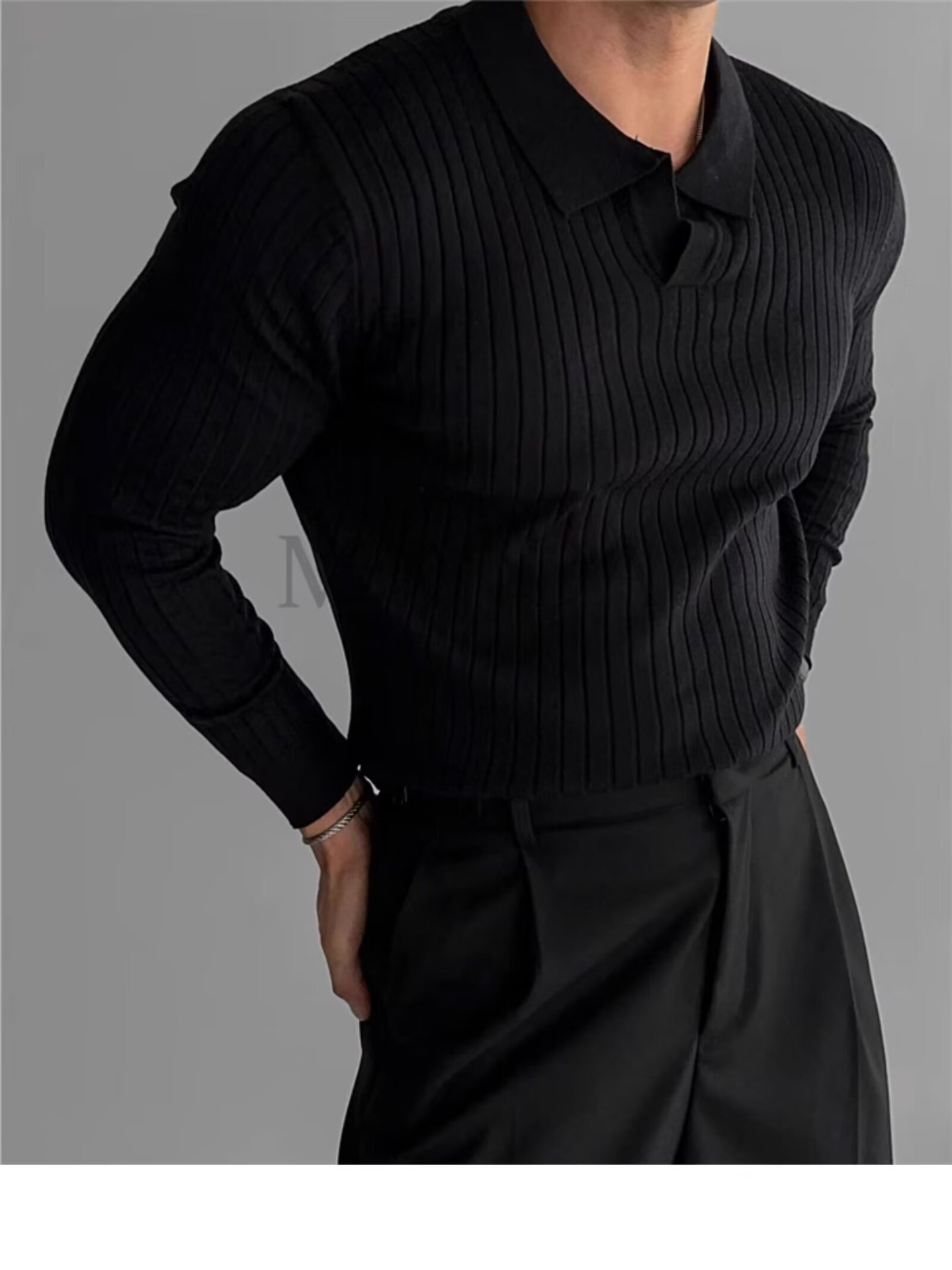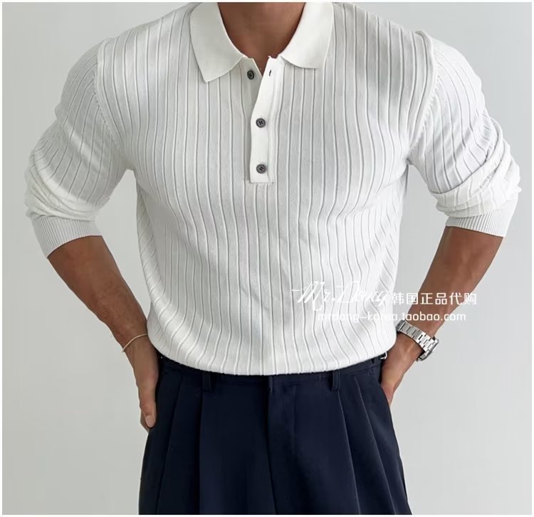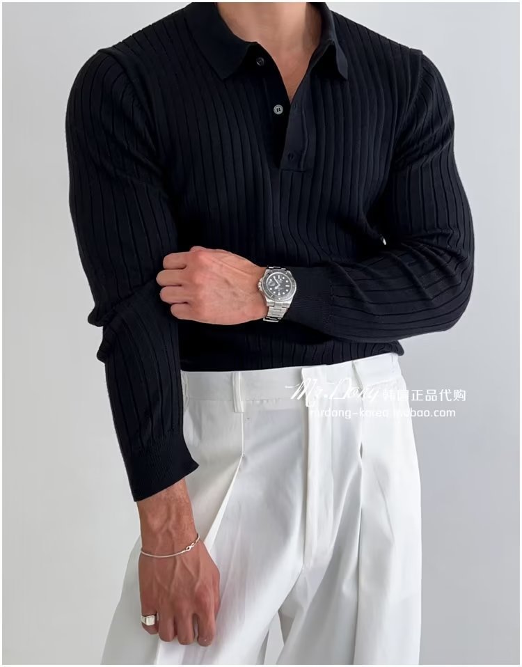 针织衫长袖POLO衫男秋季新款潮流简约肌肉健身条纹翻领上衣体恤衫