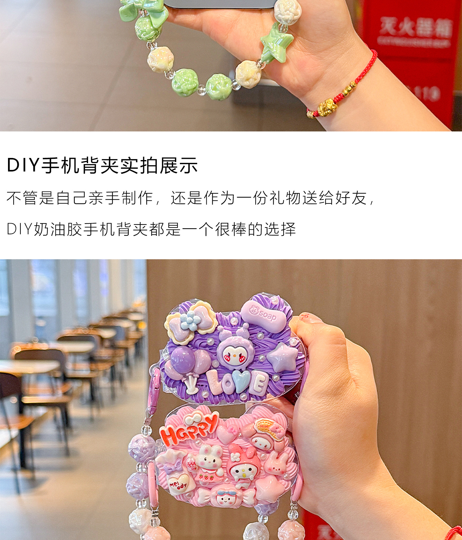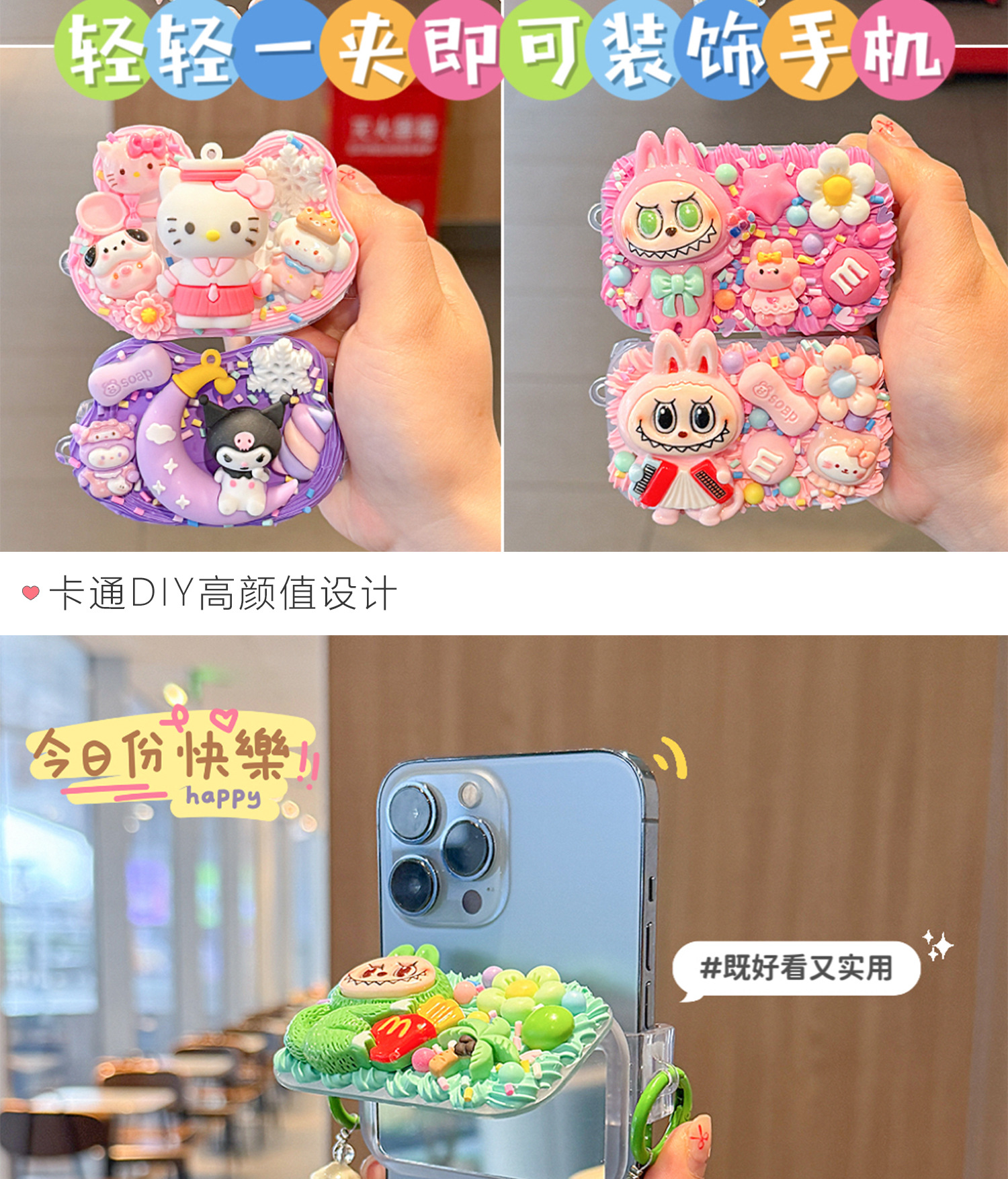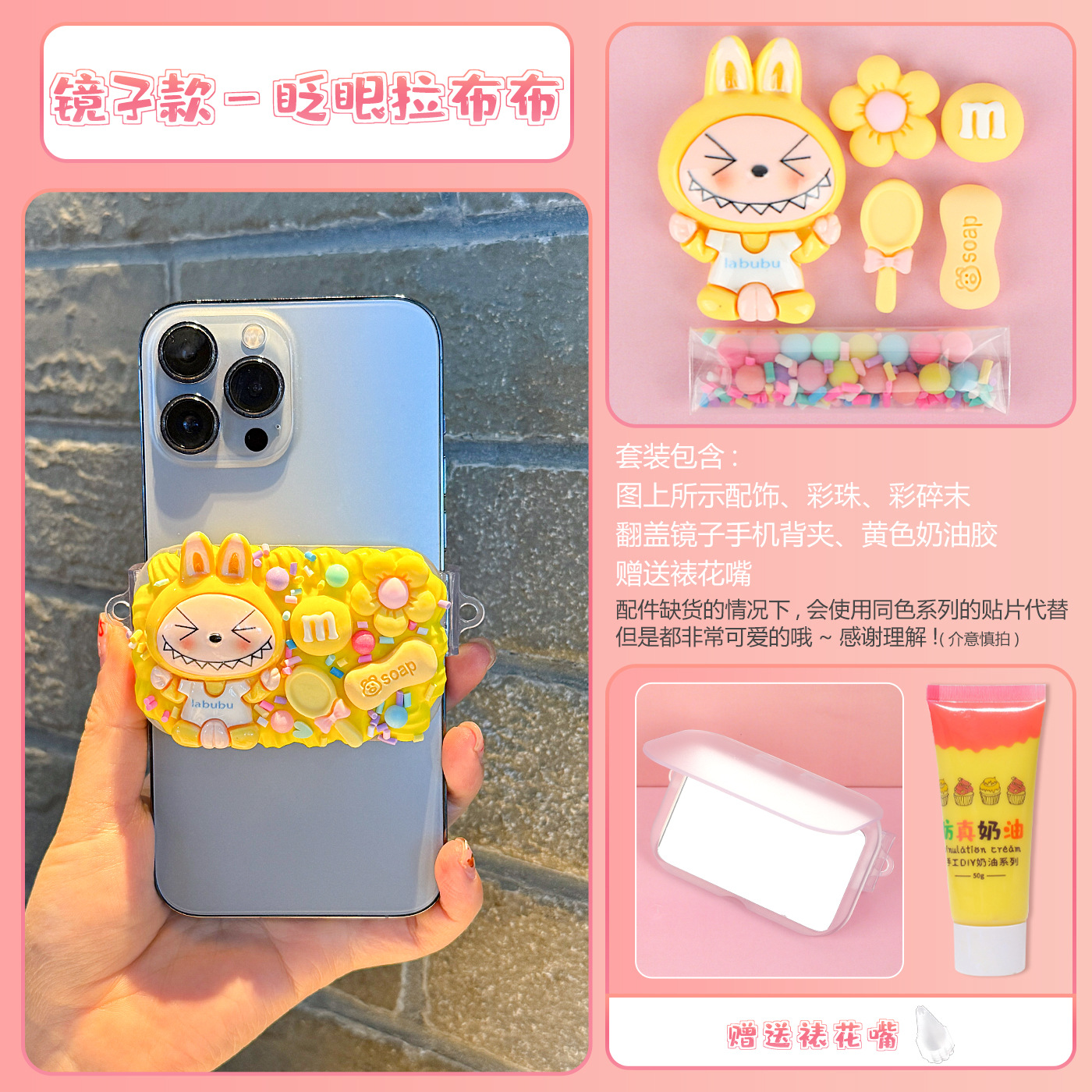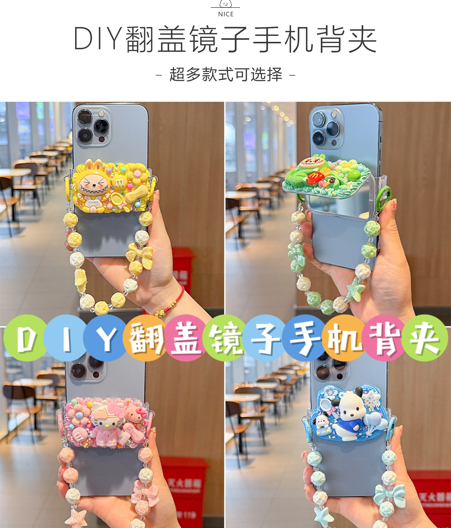 新款手工diy翻盖镜子手机背夹卡扣挂绳拉布布奶油胶材料包补妆镜