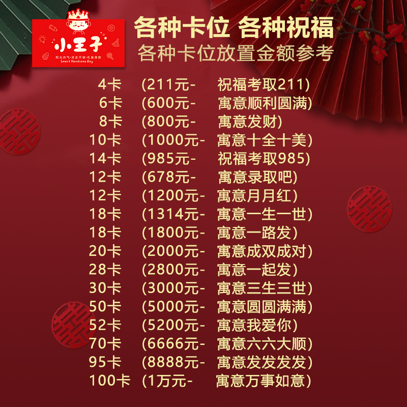 | 18 card position (put 1314 or 1800 yuan)(18卡位(放1314或1800元)) | USD $1.36 | 19986 piece available |