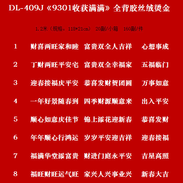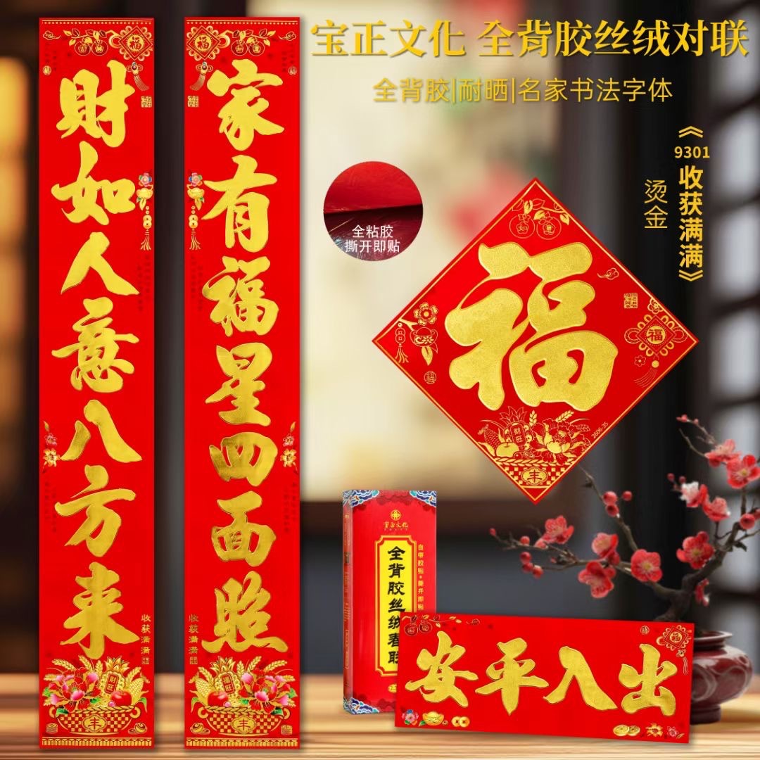 年货批发对联植绒全背胶撕不破对联新款七彩收获满满烫金礼盒春联