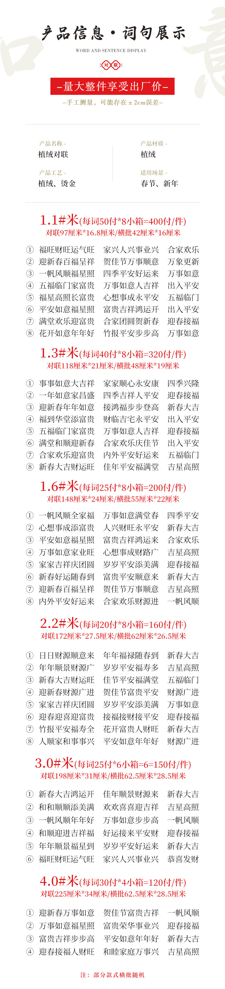 | 1.1m horizontal batch of words and sentences are random (please contact customer service for details on average)(1.1M横批词句随机(词句平均发详询客服)) | USD $0.67 | 1000 blessing available |
