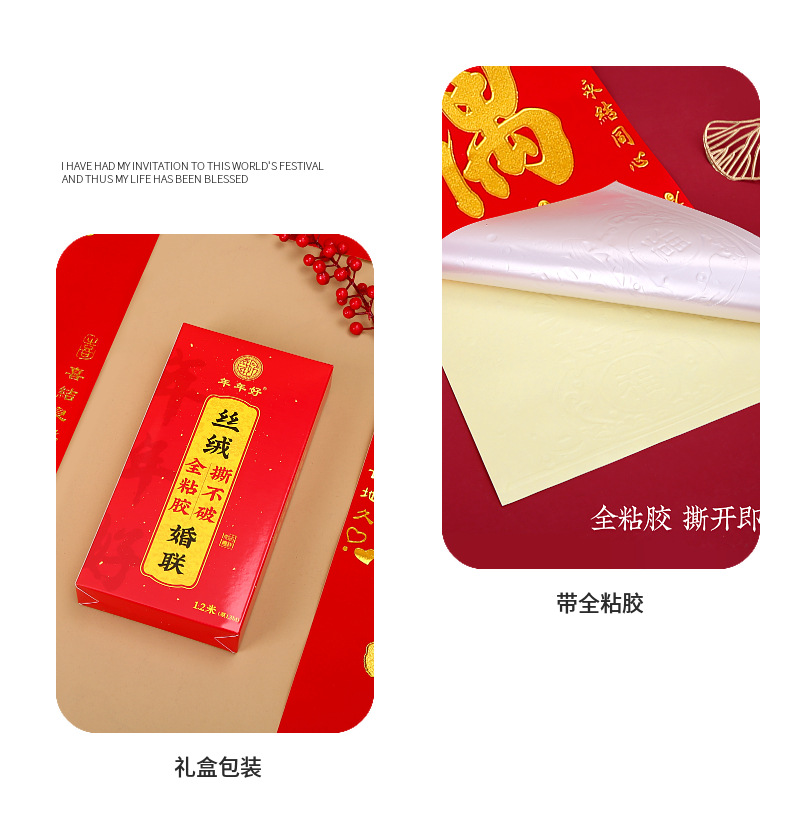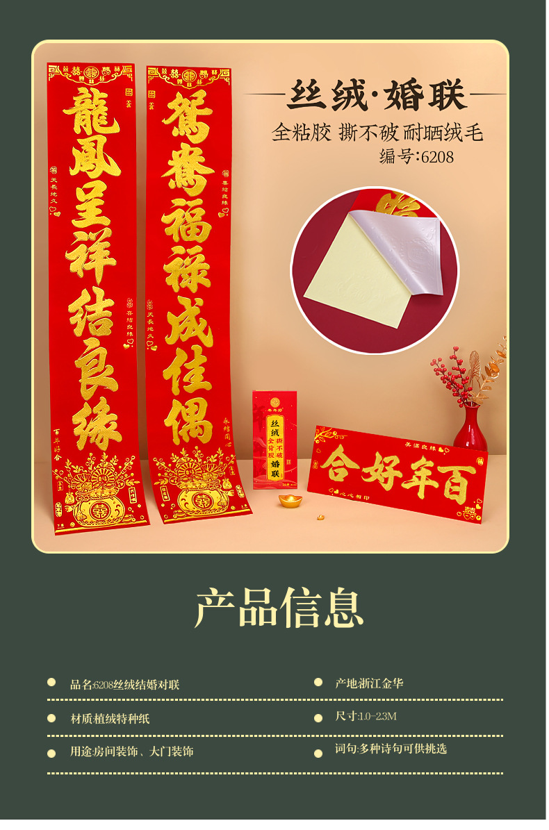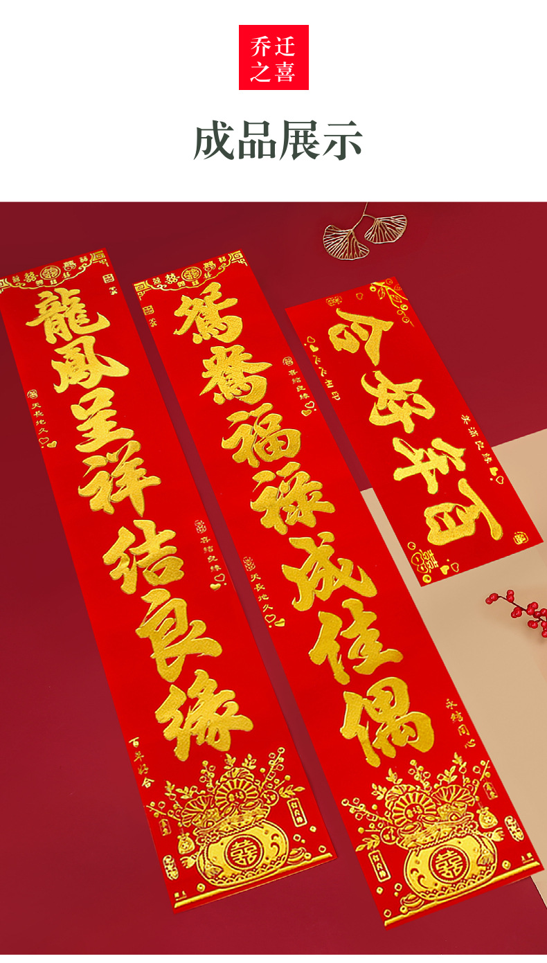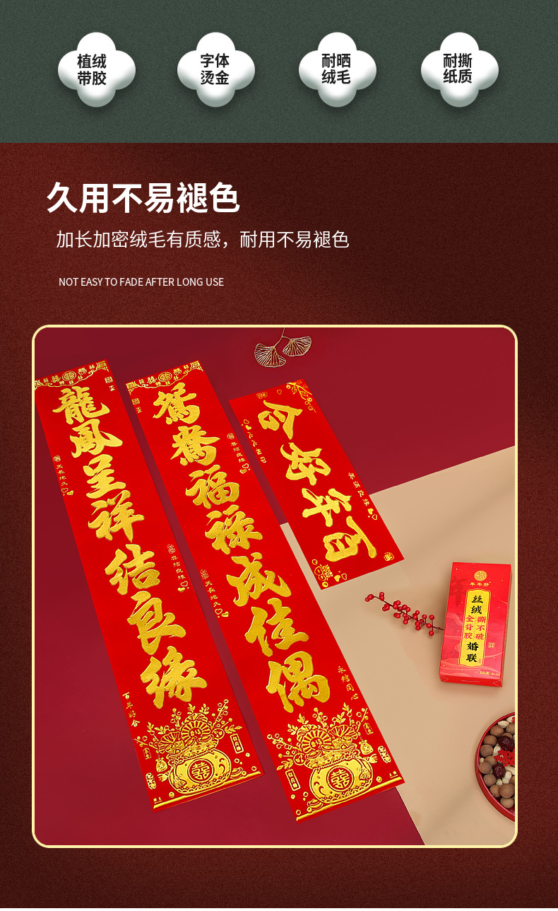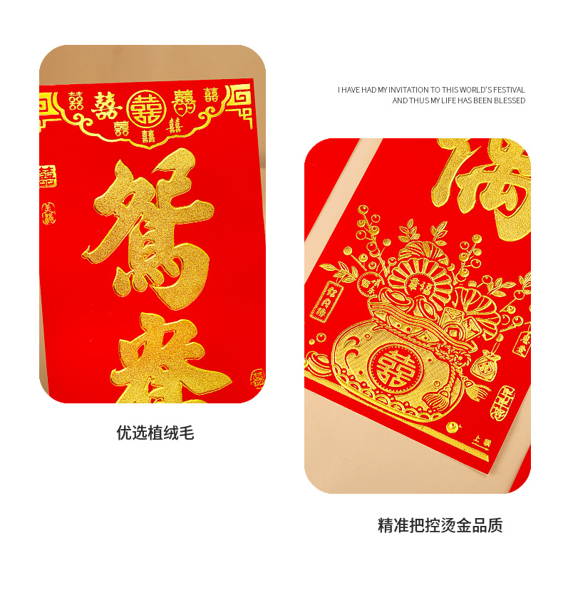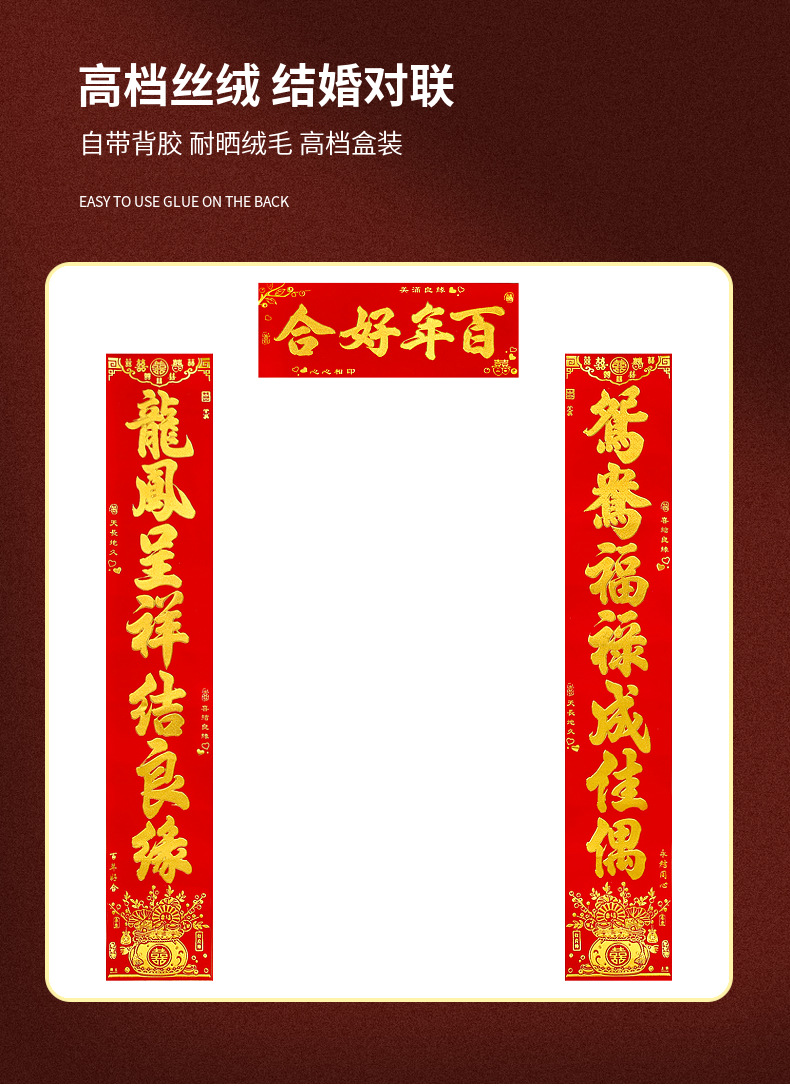 现货婚庆新品对联结婚大门联加厚带全胶植绒红卡烫金喜联婚房布置