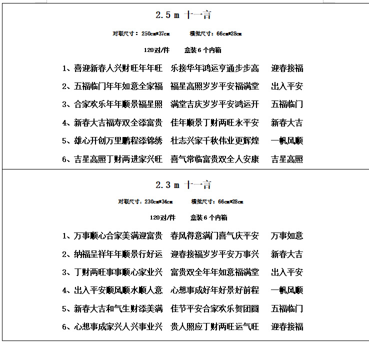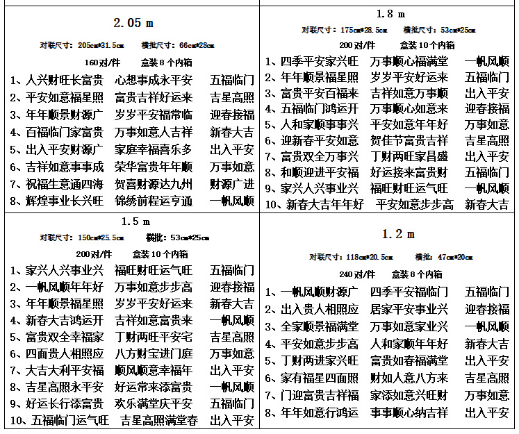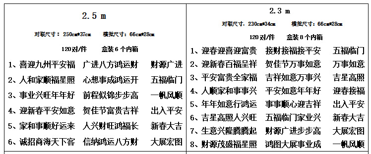| 1.5 m [original 1.6 m] (seven words)(1.5米【原1.6米】(七言)) | USD $0.5 | 300 pair available |