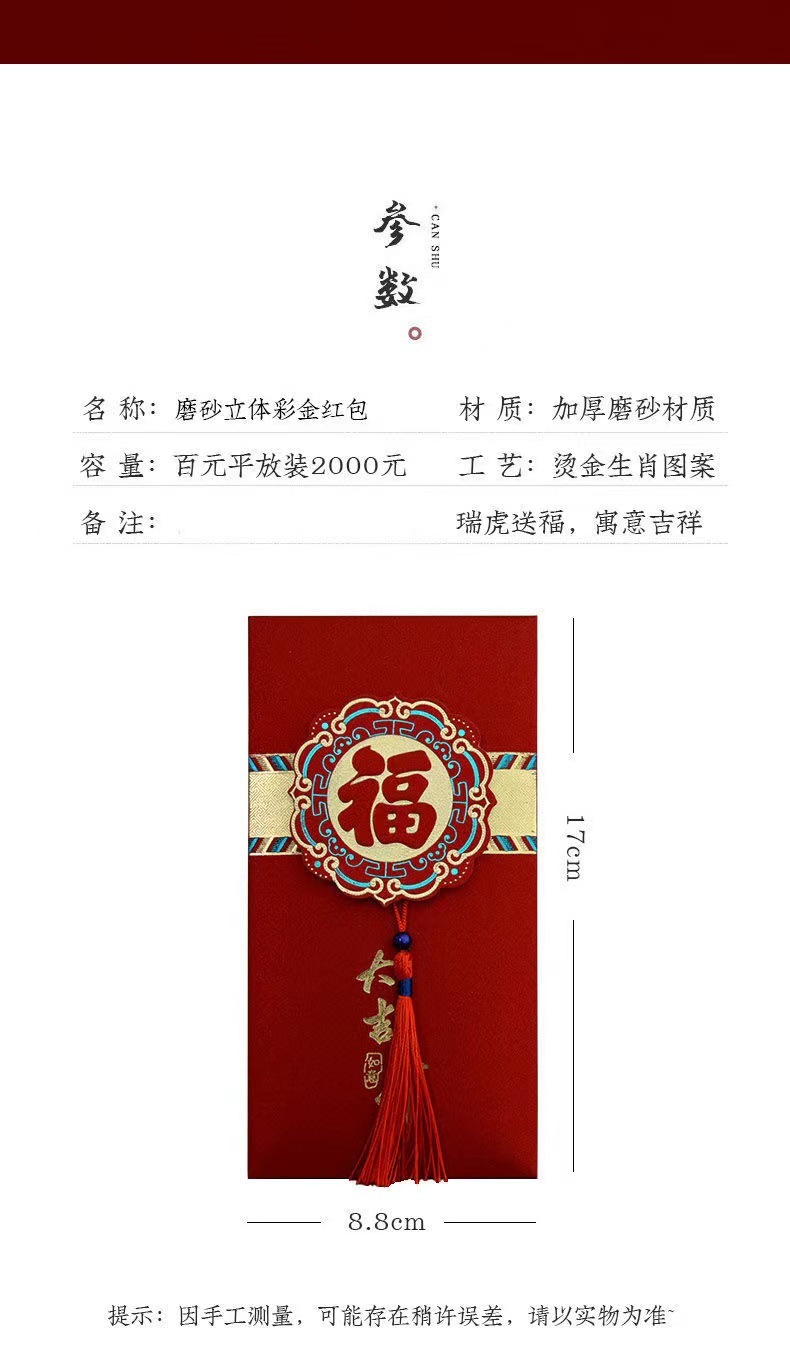 | high-end relief gilding red packet [price increase tomorrow night] buy more at a good price(高档浮雕烫金红包【明晚涨价】多买价优) | USD $5.27 | 720 piece available |