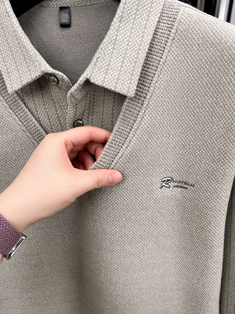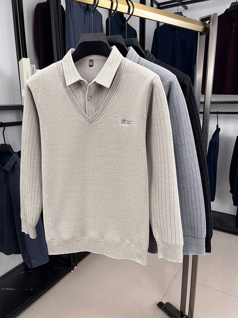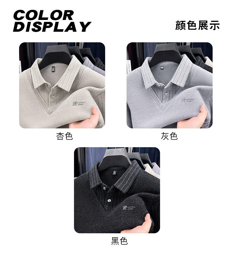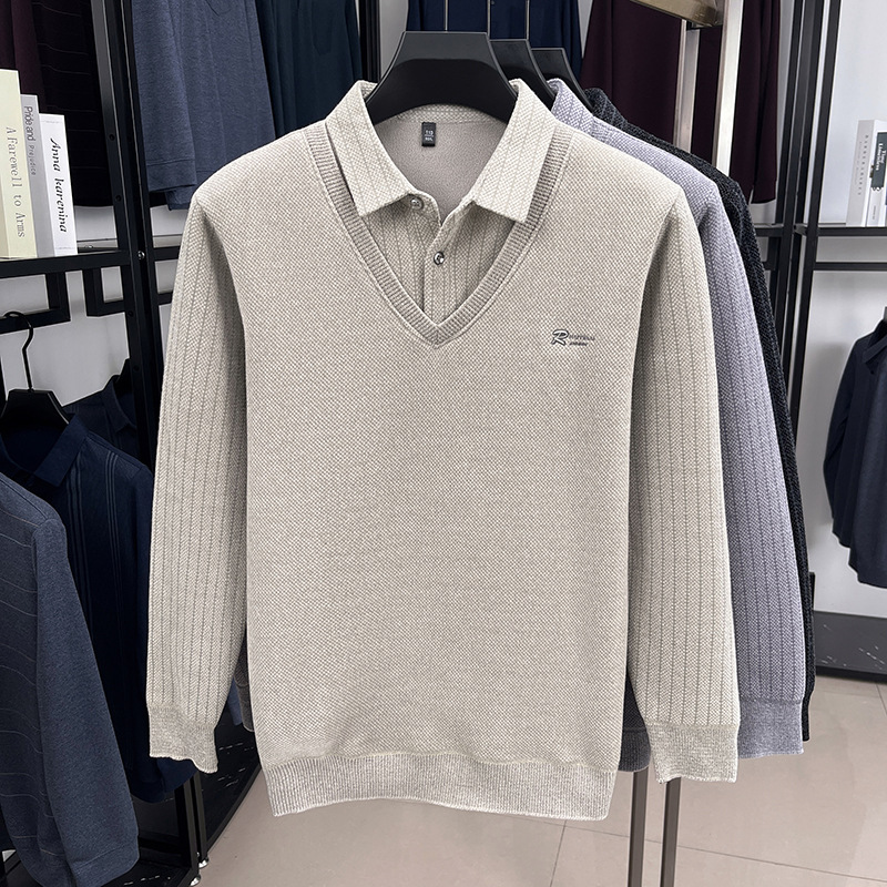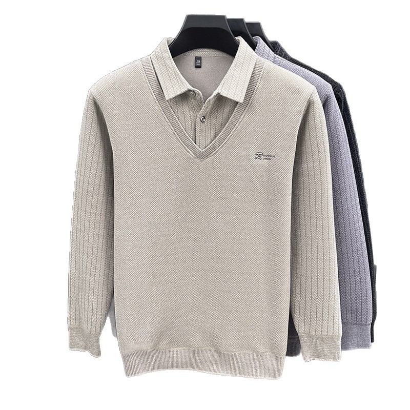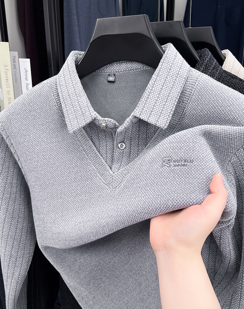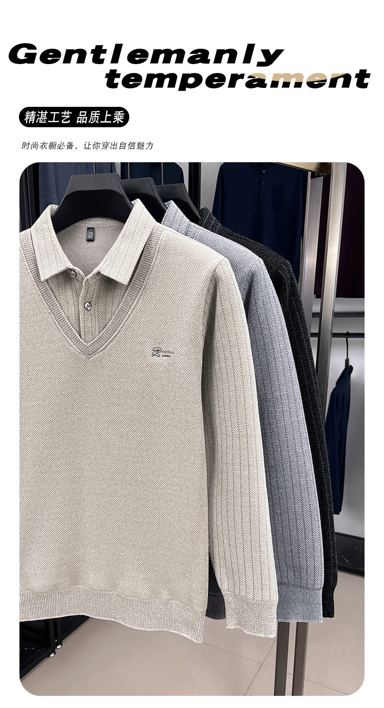 男士假两件加绒加厚冬季爆款中年男士保暖上衣翻领纯色打底衫男装