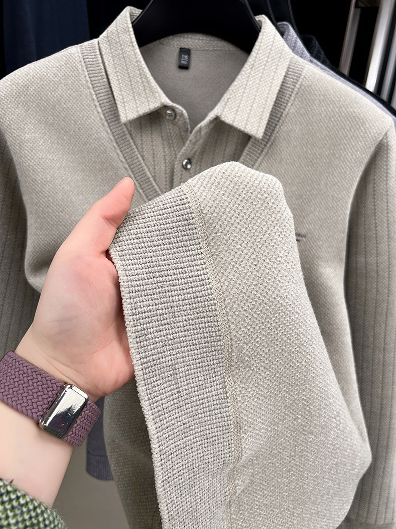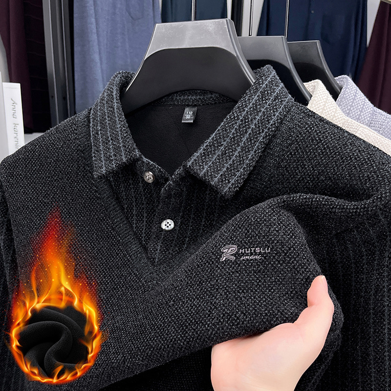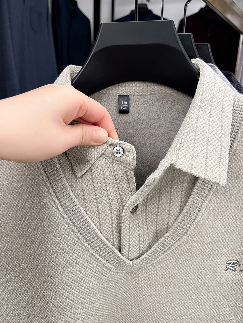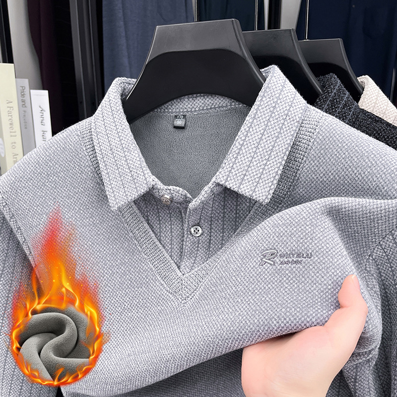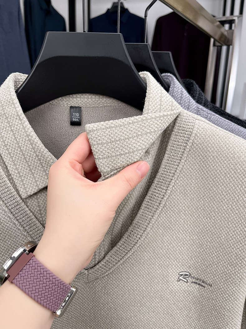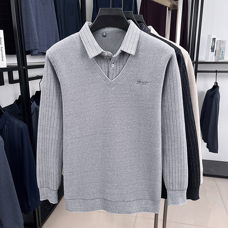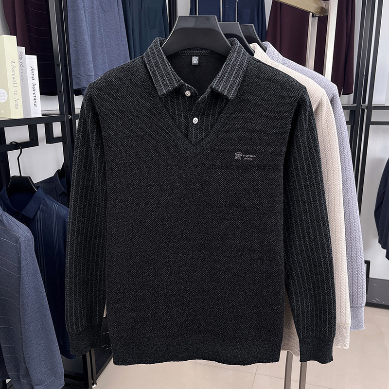 男士假两件加绒加厚冬季爆款中年男士保暖上衣翻领纯色打底衫男装