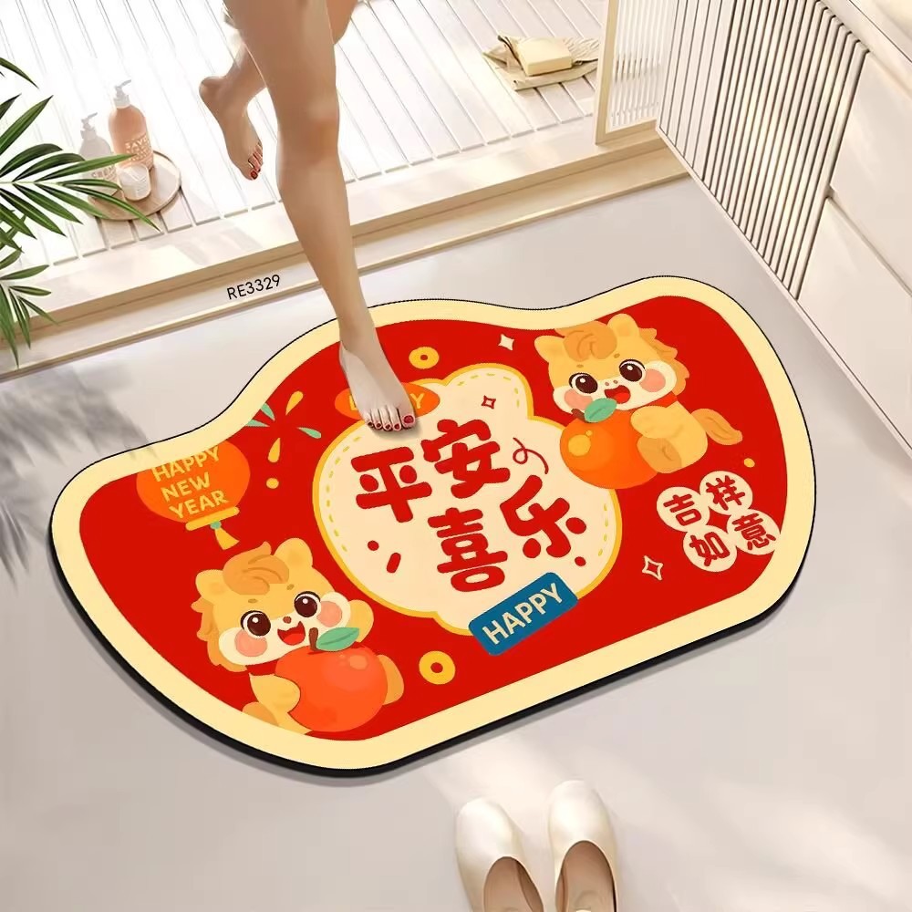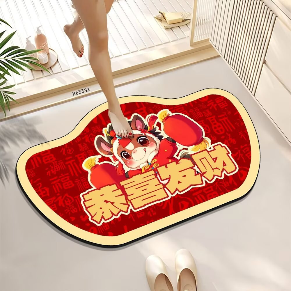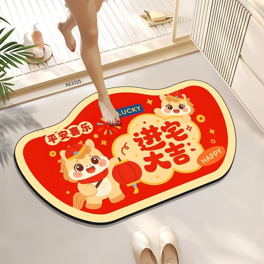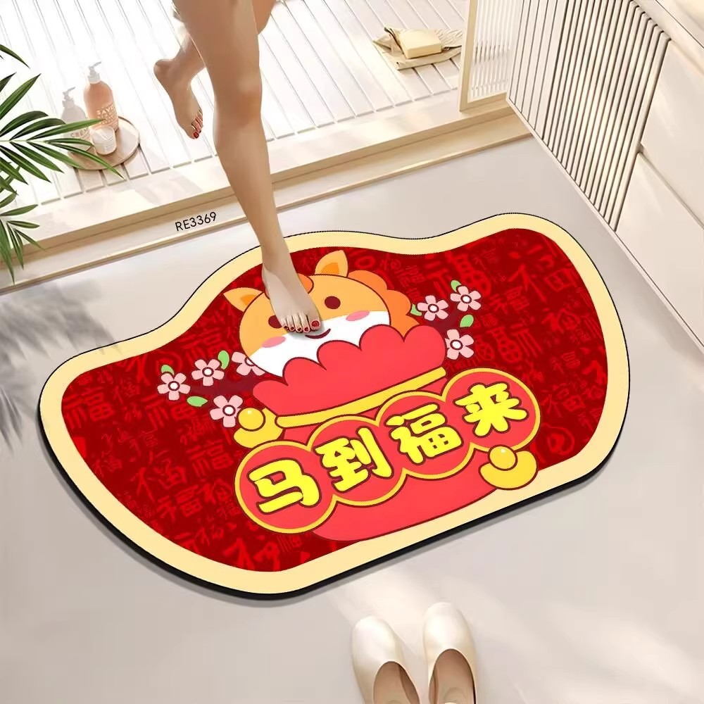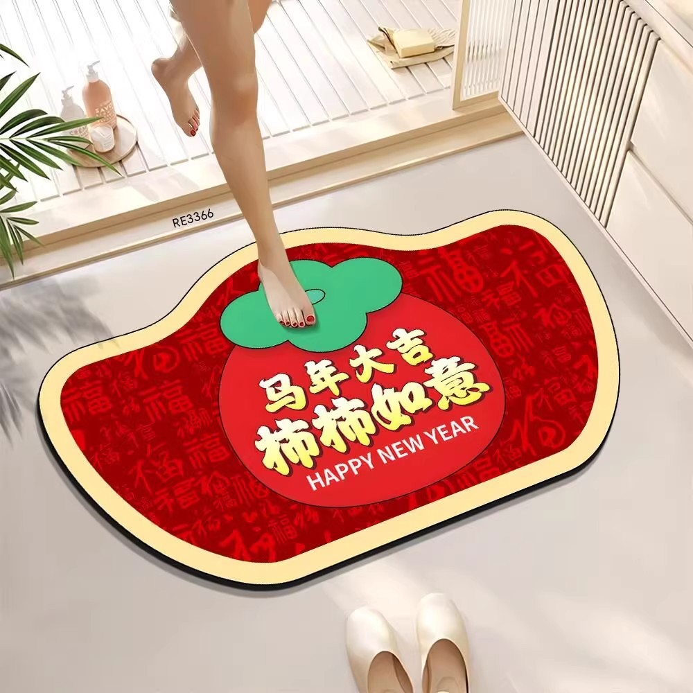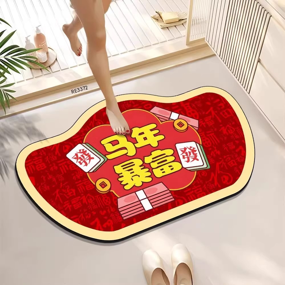 马年春节硅藻泥地垫家用红色喜庆防滑浴室地垫吸水速干卫生间脚垫