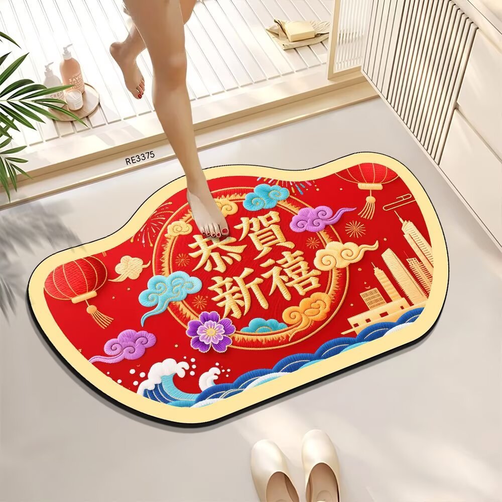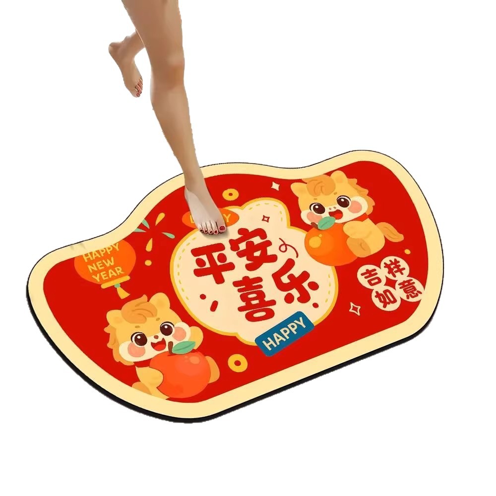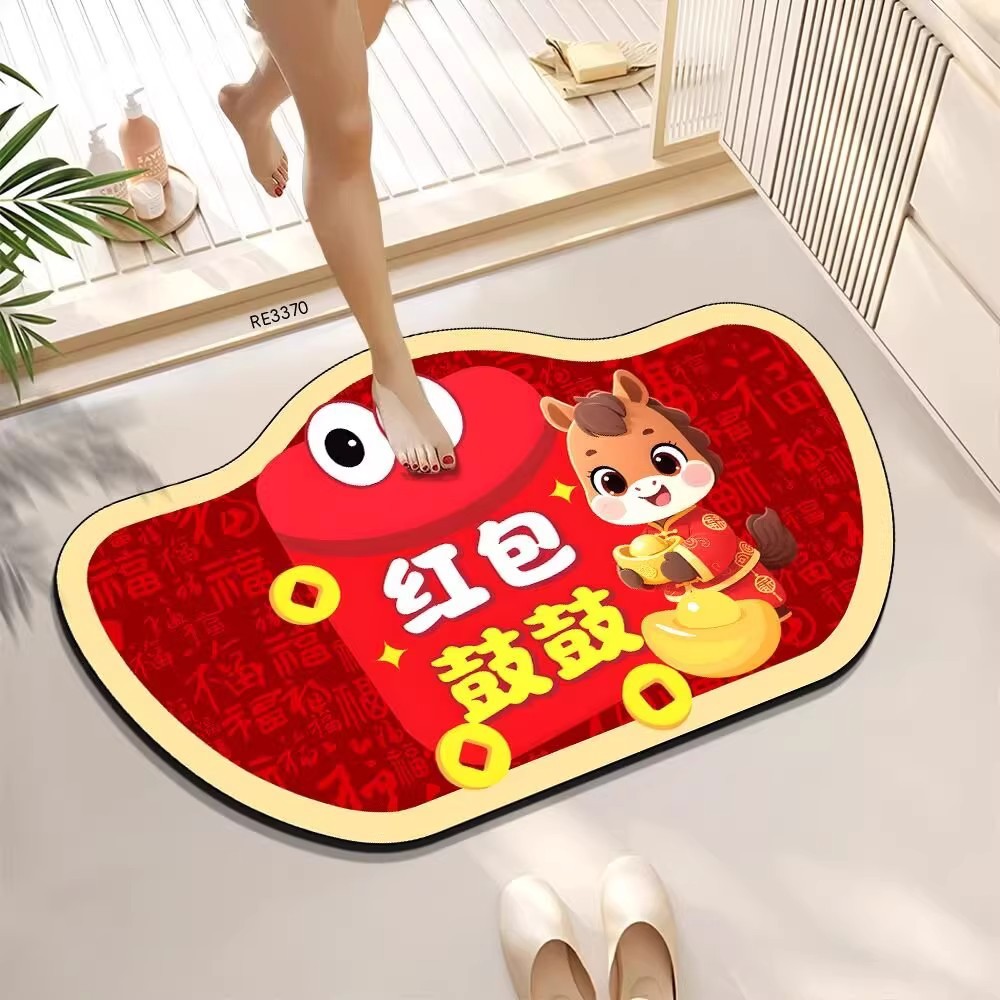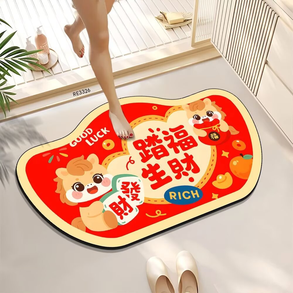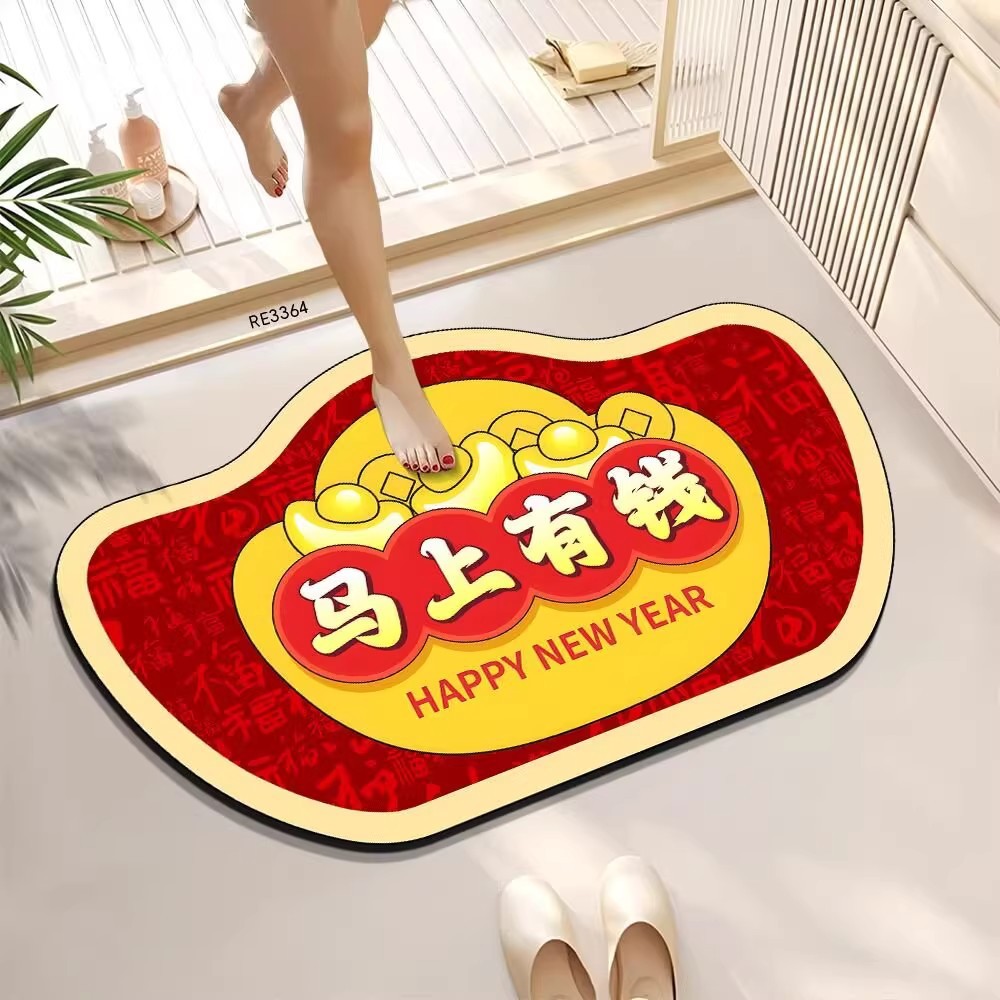 马年春节硅藻泥地垫家用红色喜庆防滑浴室地垫吸水速干卫生间脚垫