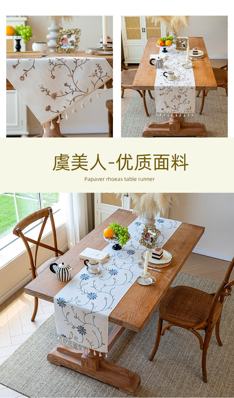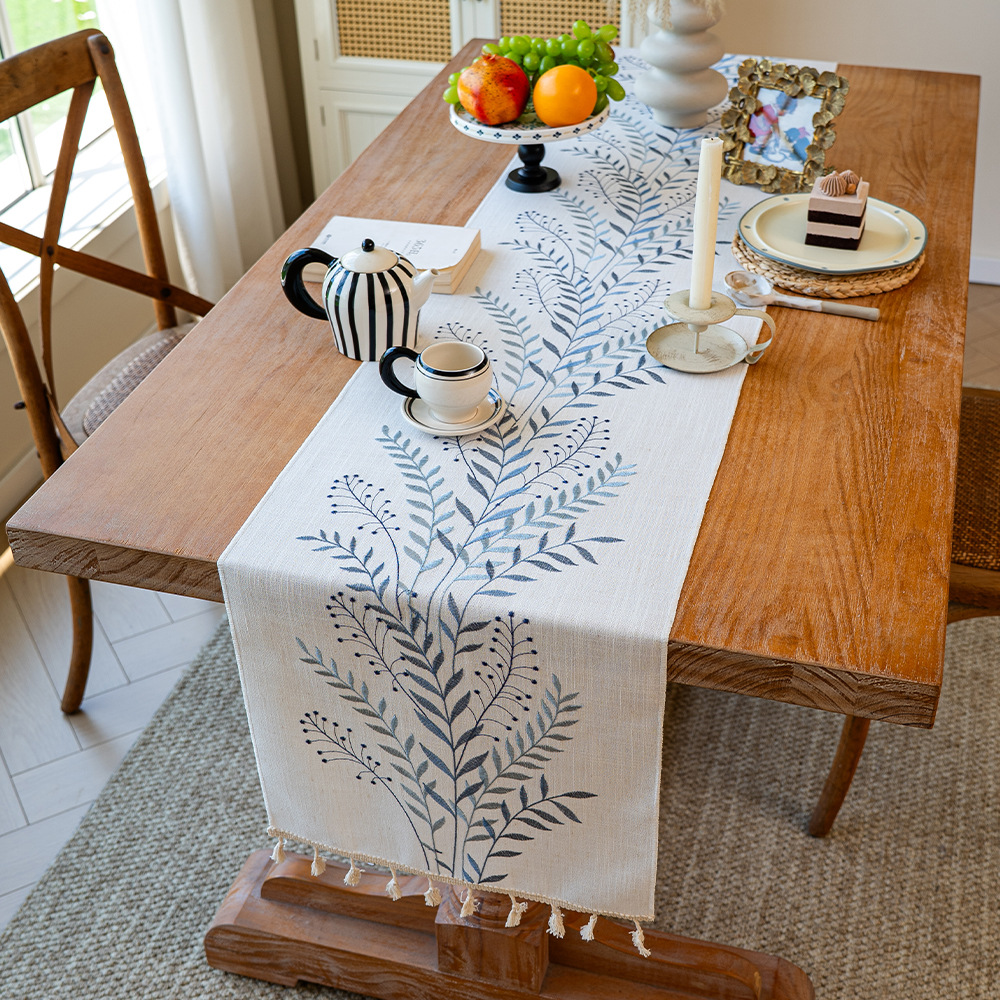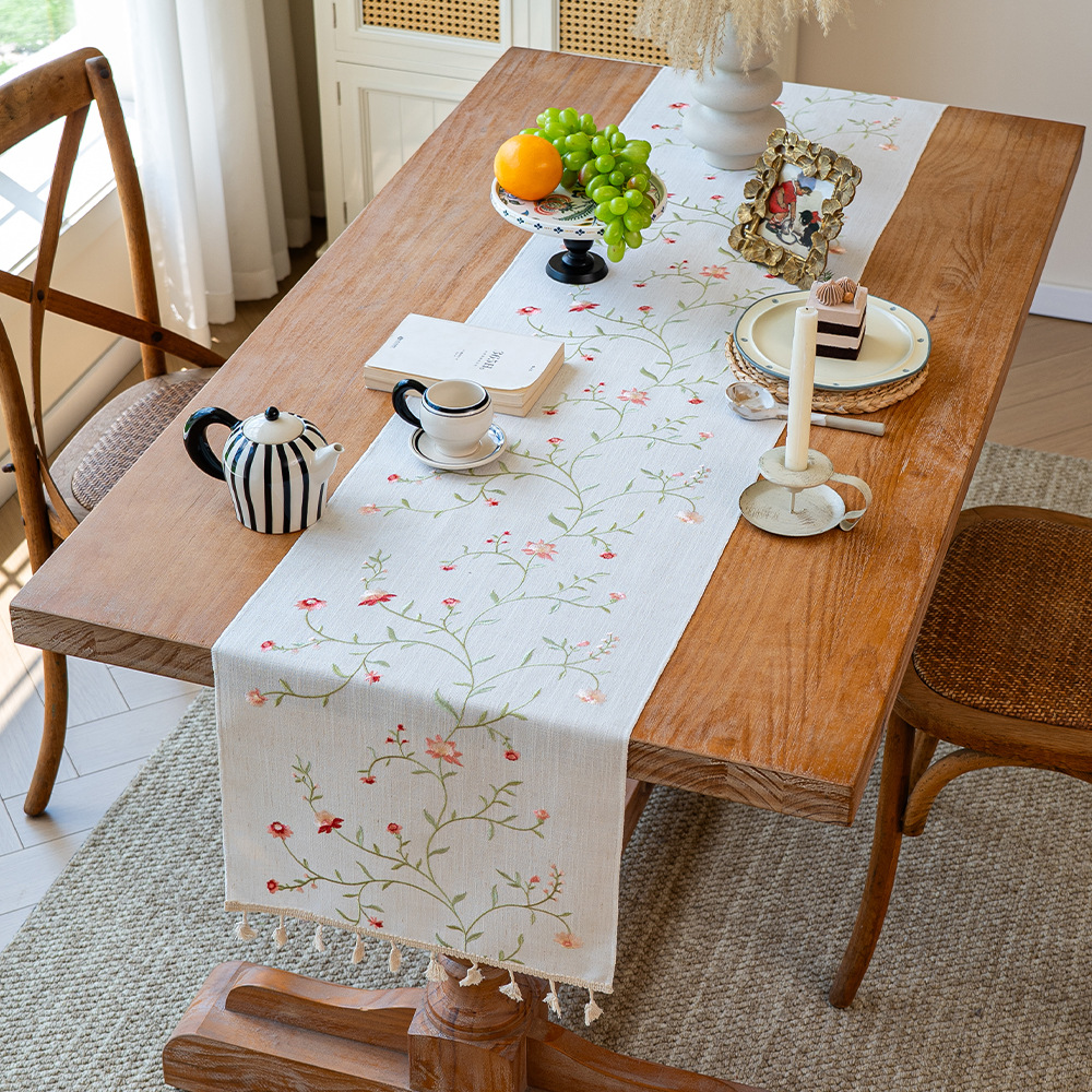 北欧新款桌旗跨境专供植物花卉绣花长条布艺流苏家用茶几桌垫批发
