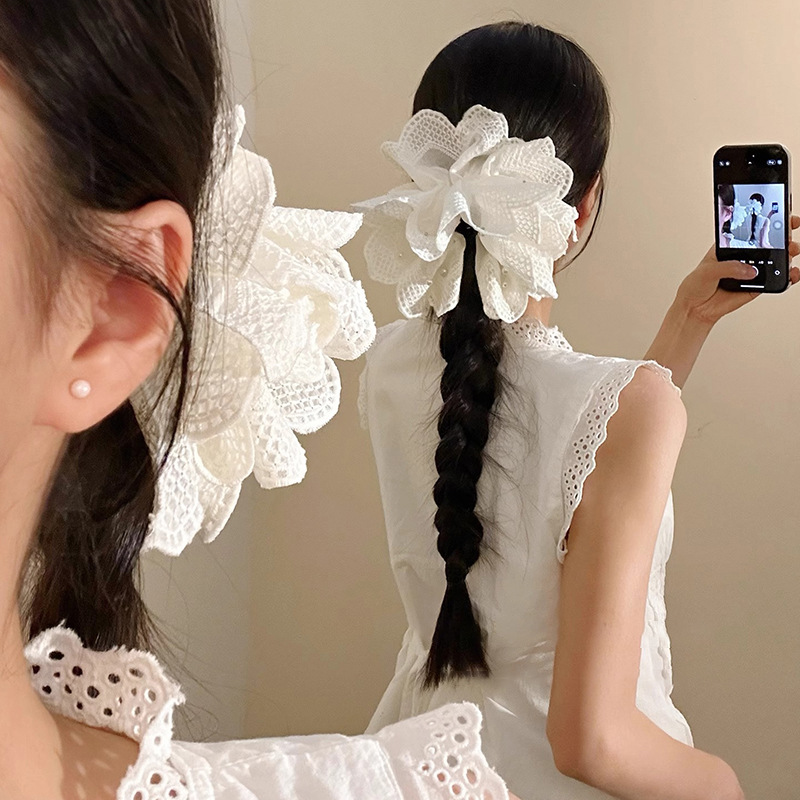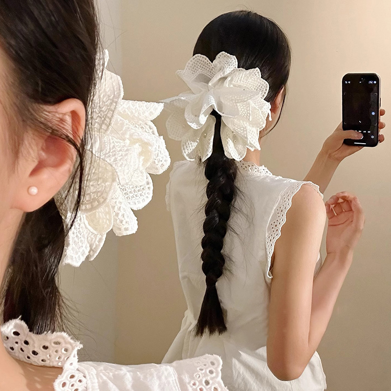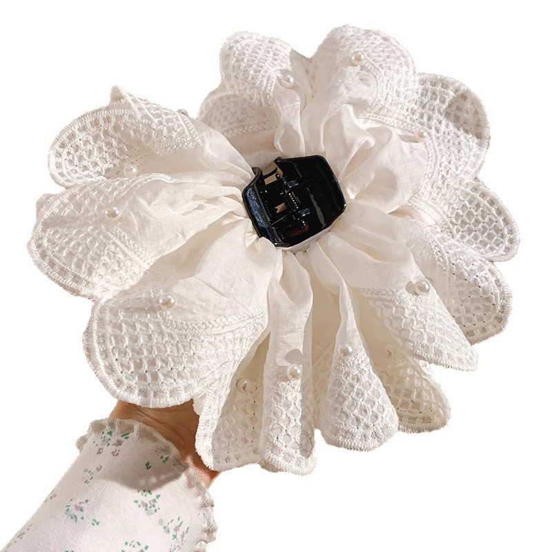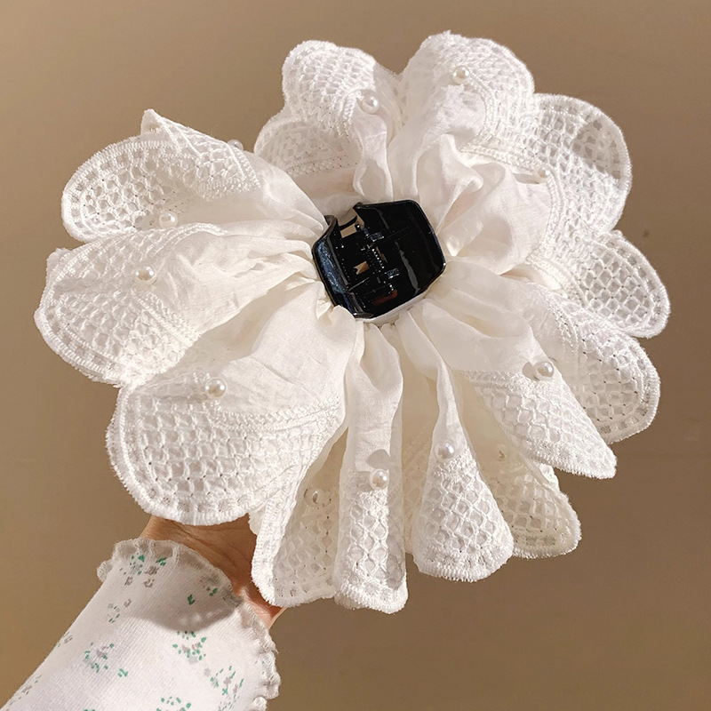 超仙白色蕾丝珍珠花朵抓夹女氛围感低马尾鲨鱼夹后脑勺麻花辫发夹