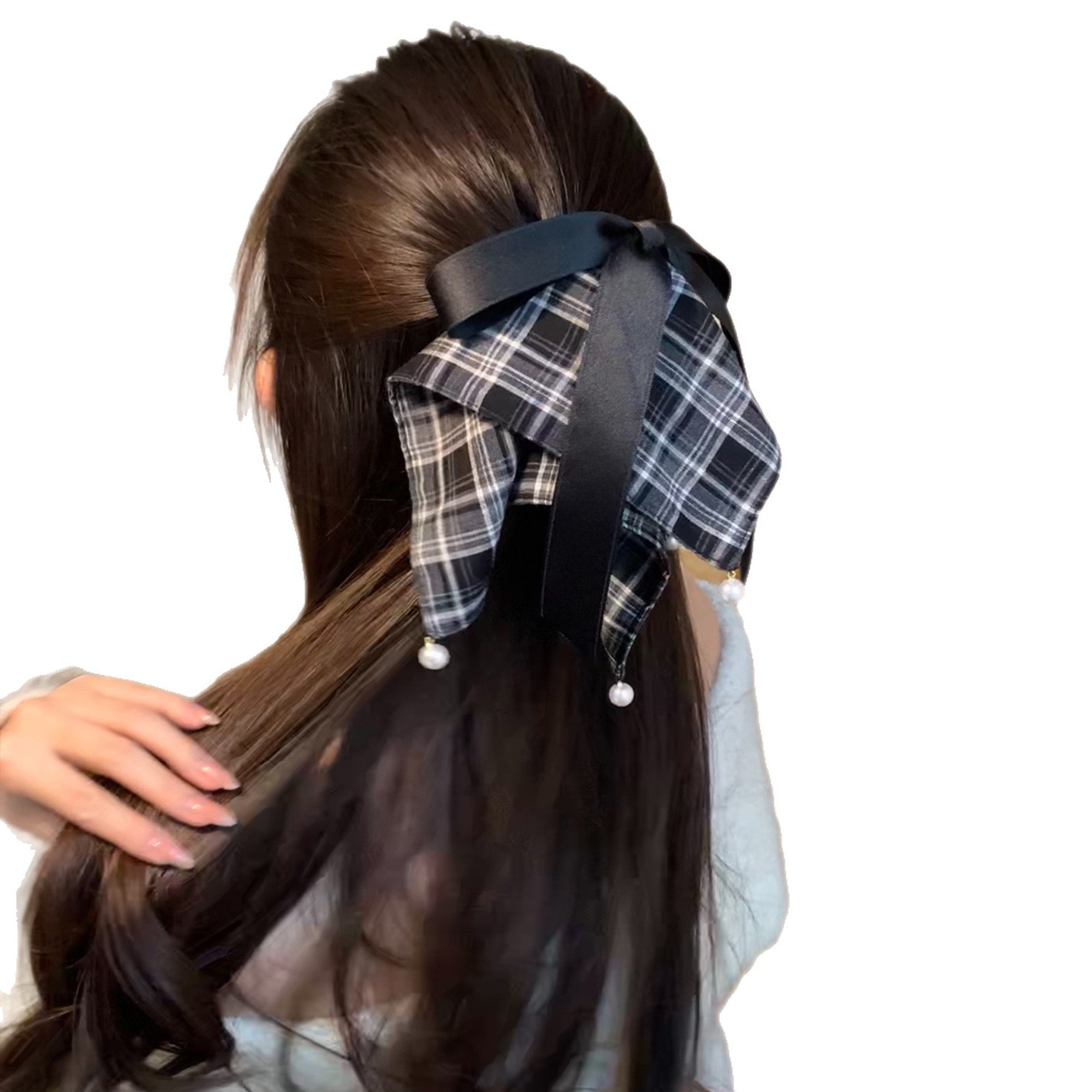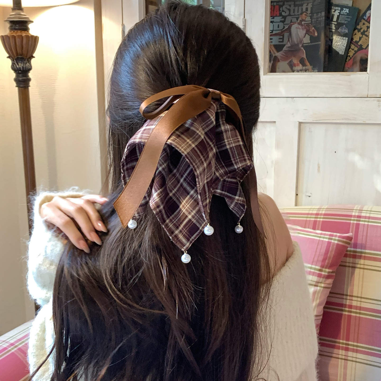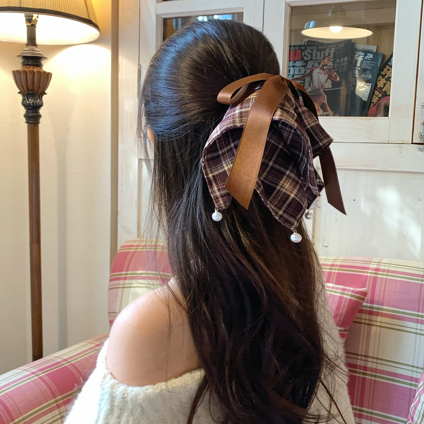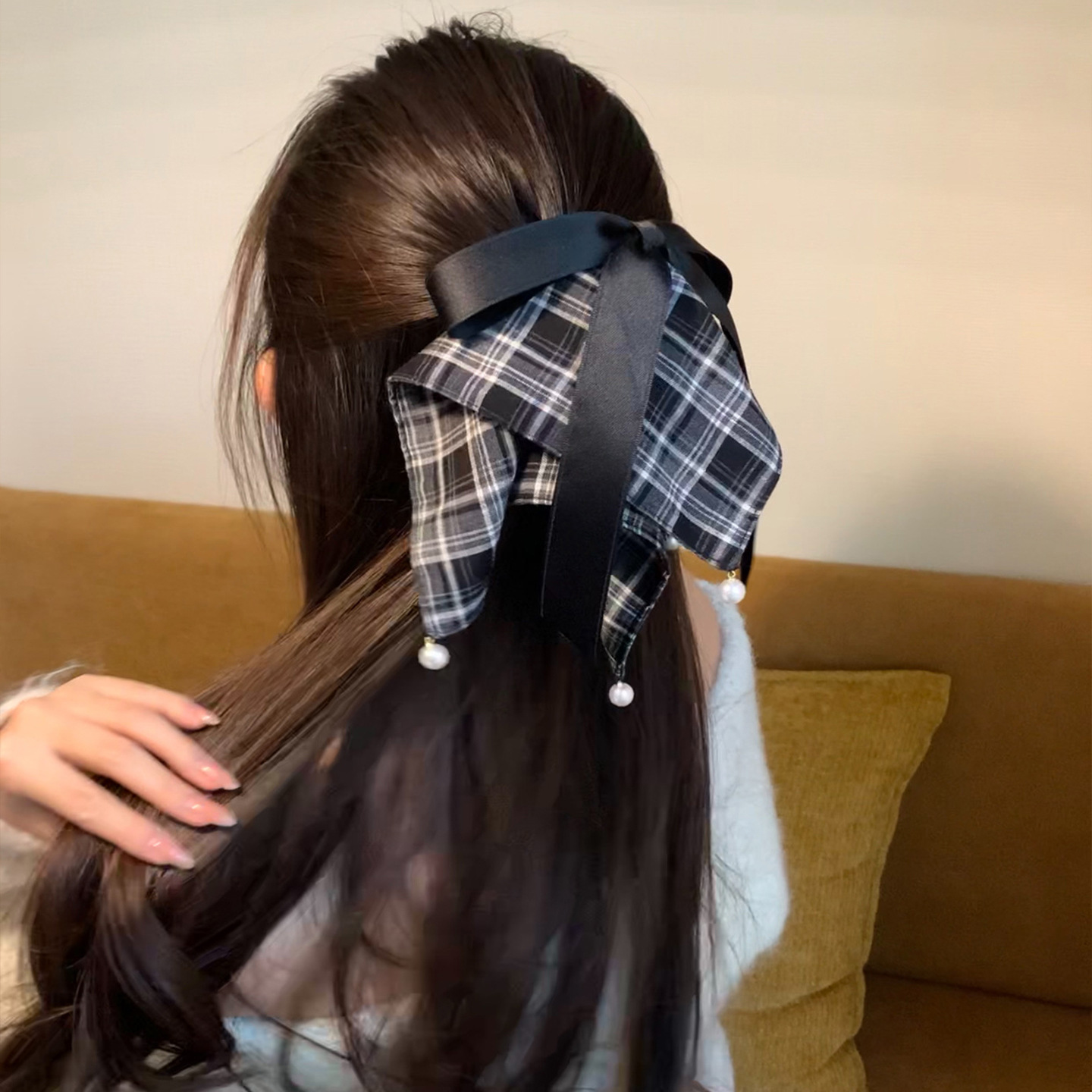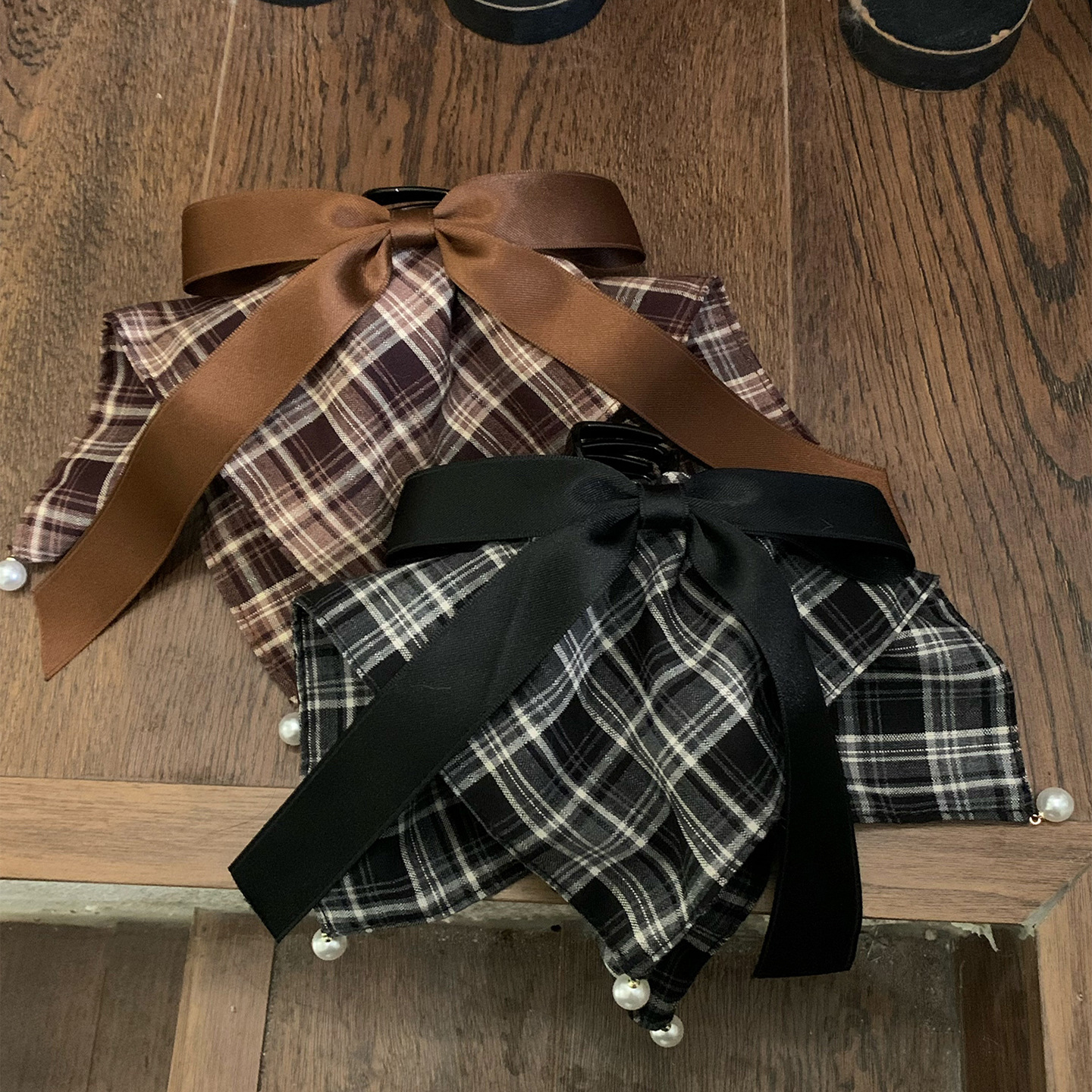 法式复古美拉德色系格纹方巾马尾夹少女心珍珠蝴蝶结盘发夹鲨鱼夹