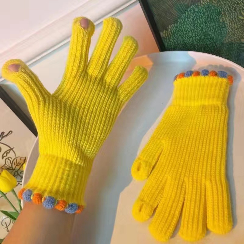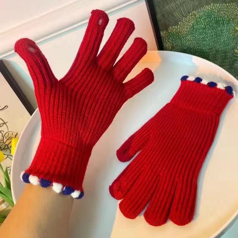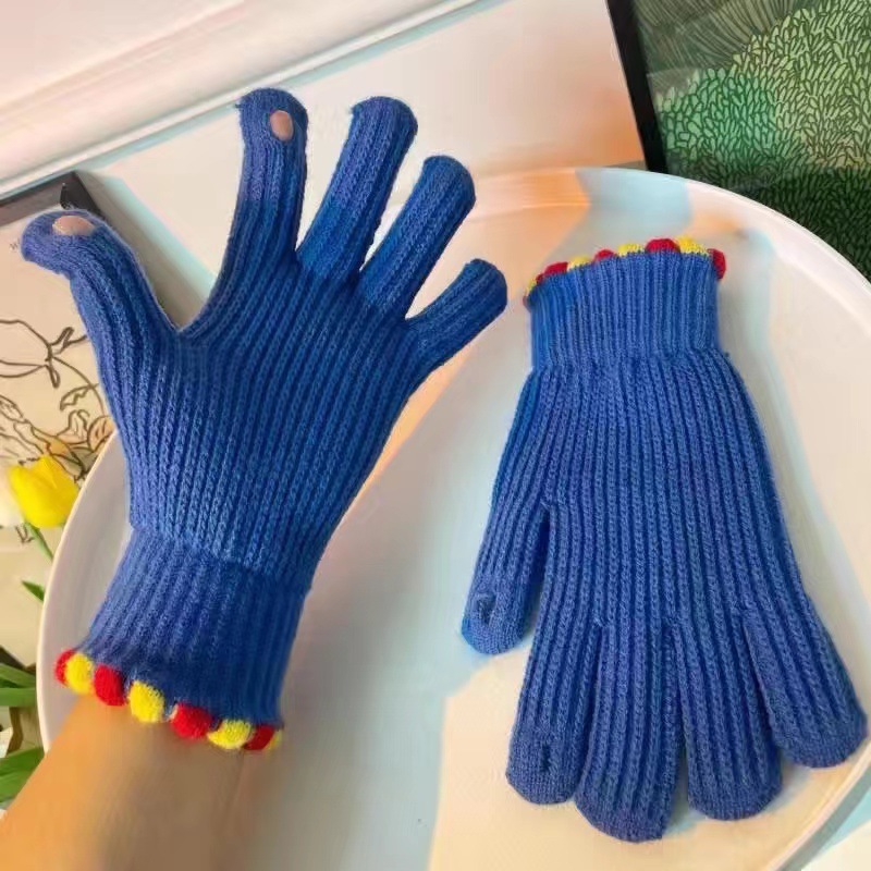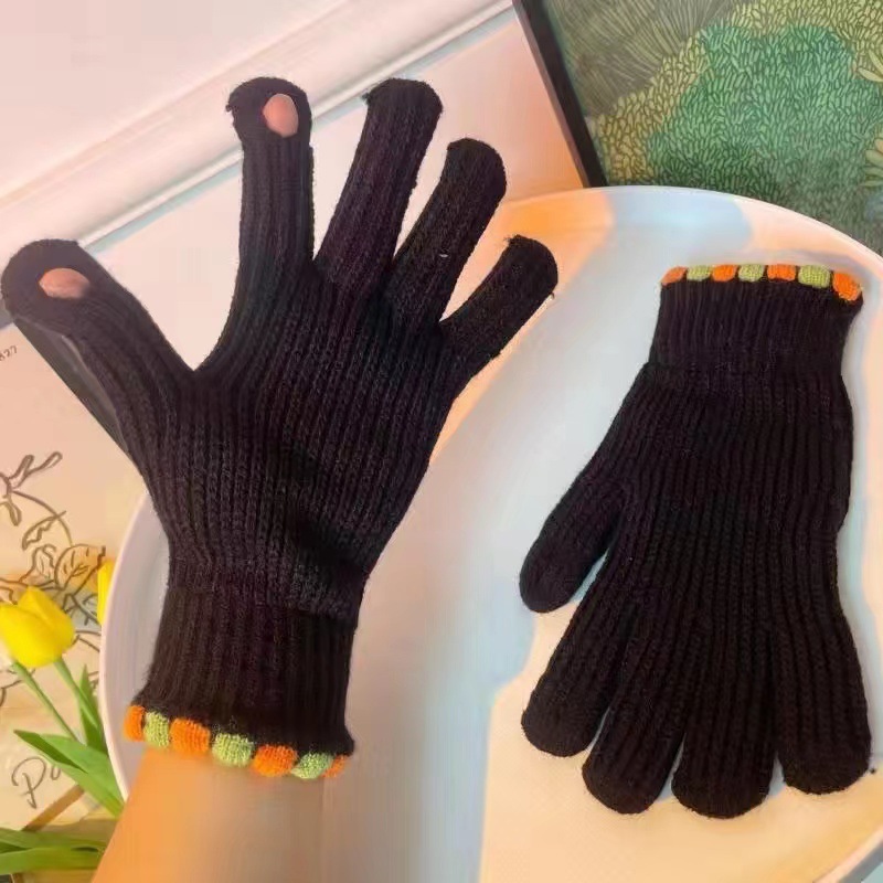 ins针织毛线手套加绒加厚女士保暖骑车漏指触屏毛绒防寒成人甜美