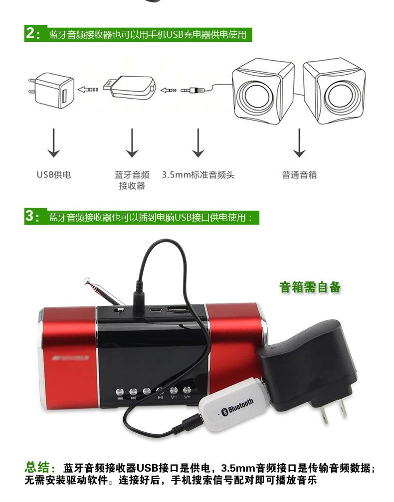 使用说明:此款需要连接音频线才能使用!