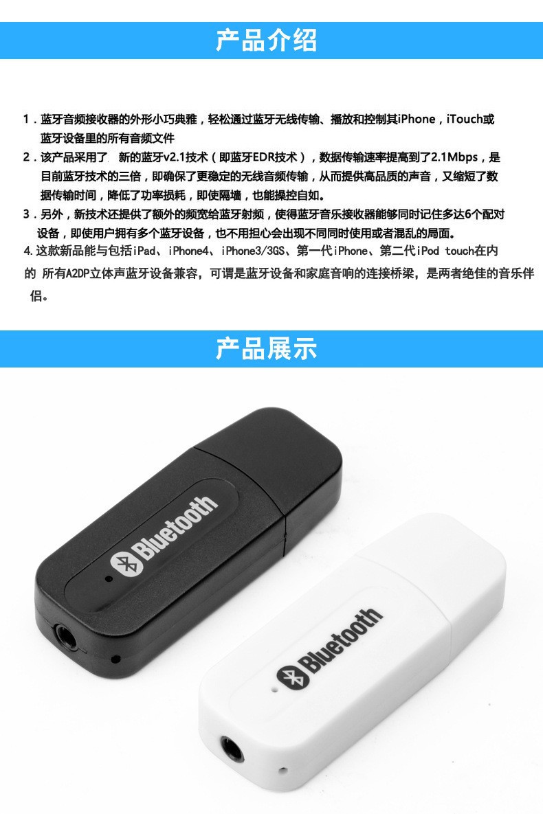 包装内容:USB蓝牙音乐接收器、3.5转接线、包装盒