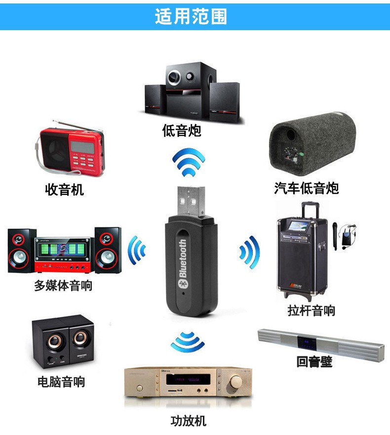 把蓝牙U盘直接插入音箱USB接口,然后把音频连接线连接到AUX端口