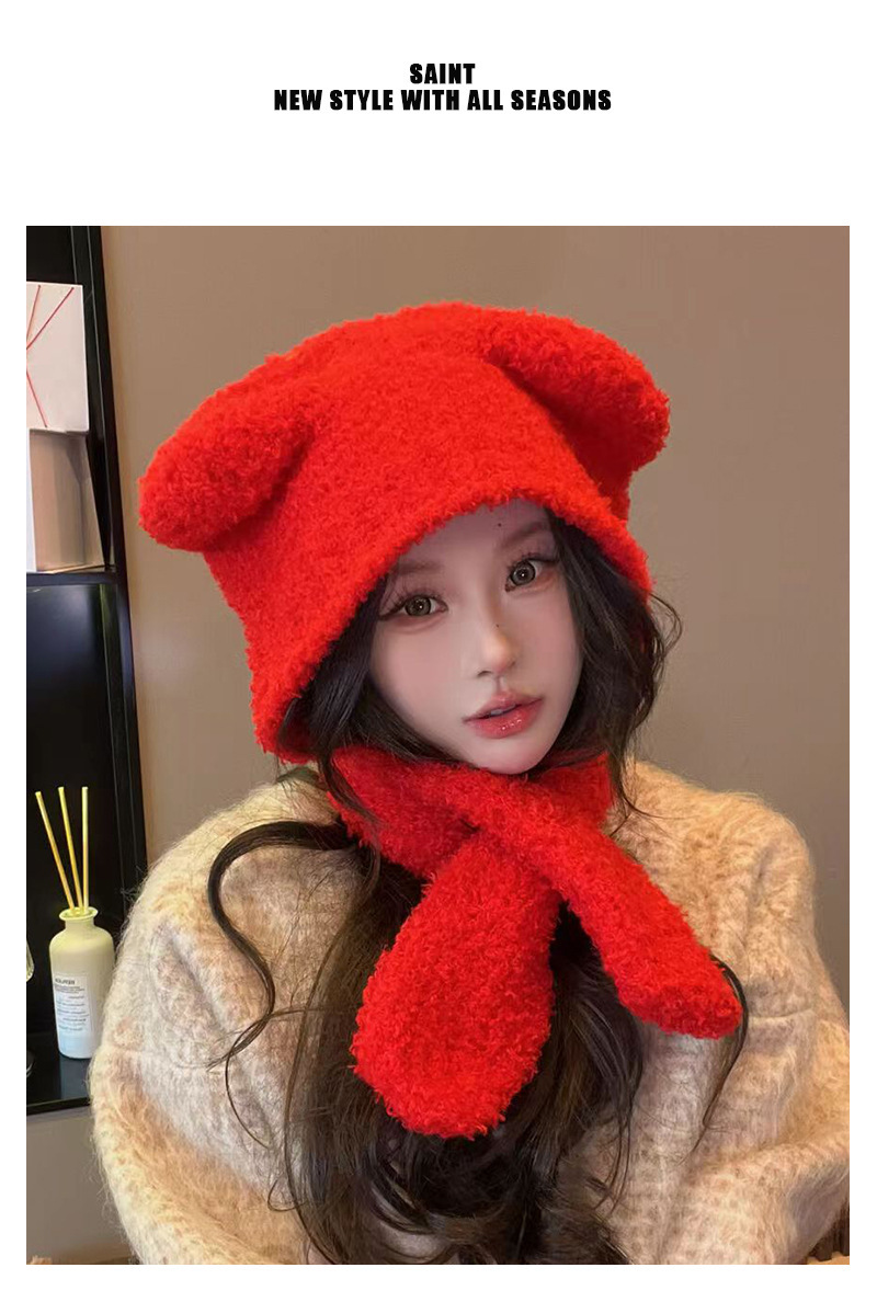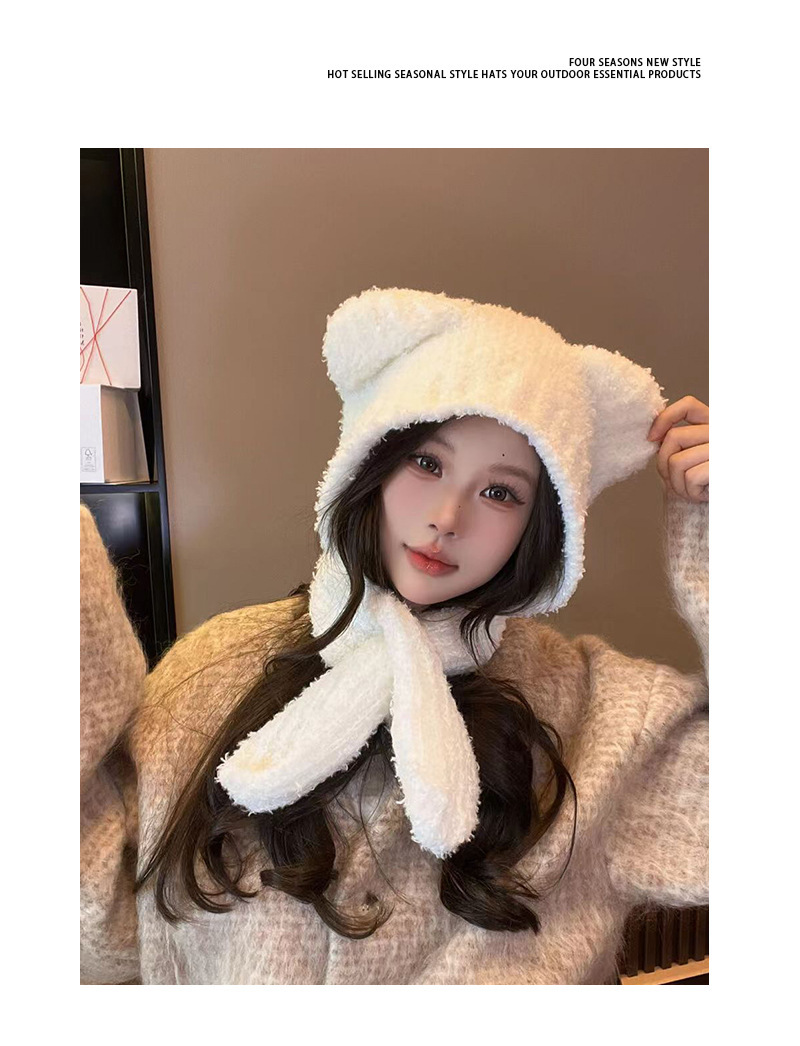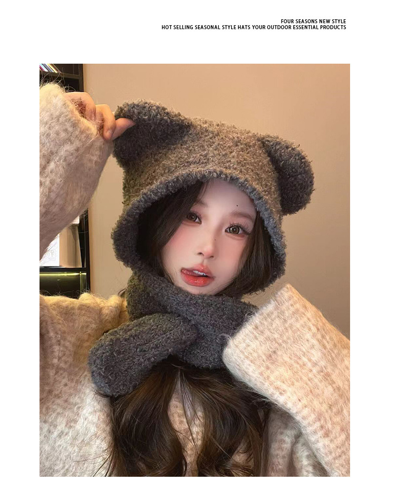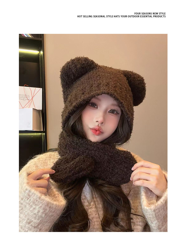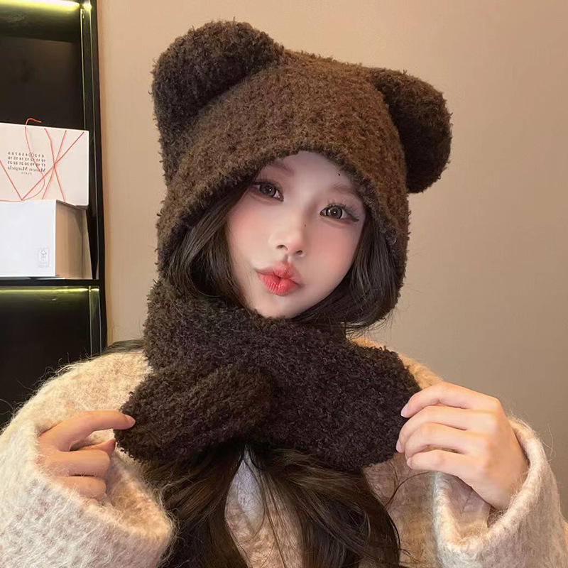 24年升级版百搭小熊保暖帽子围脖一体女加厚护耳帽秋冬针织雷锋帽